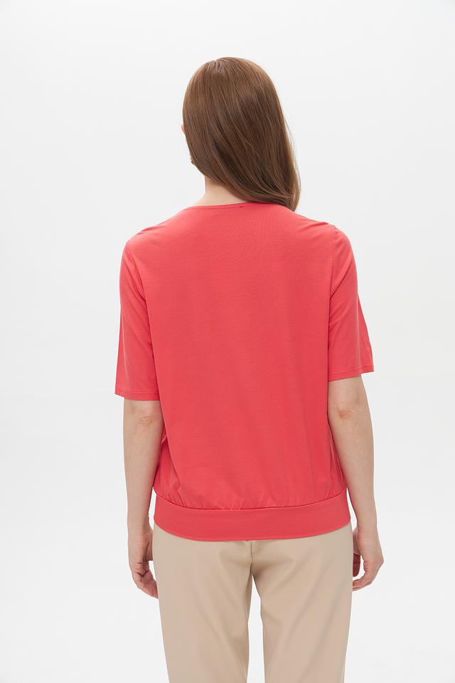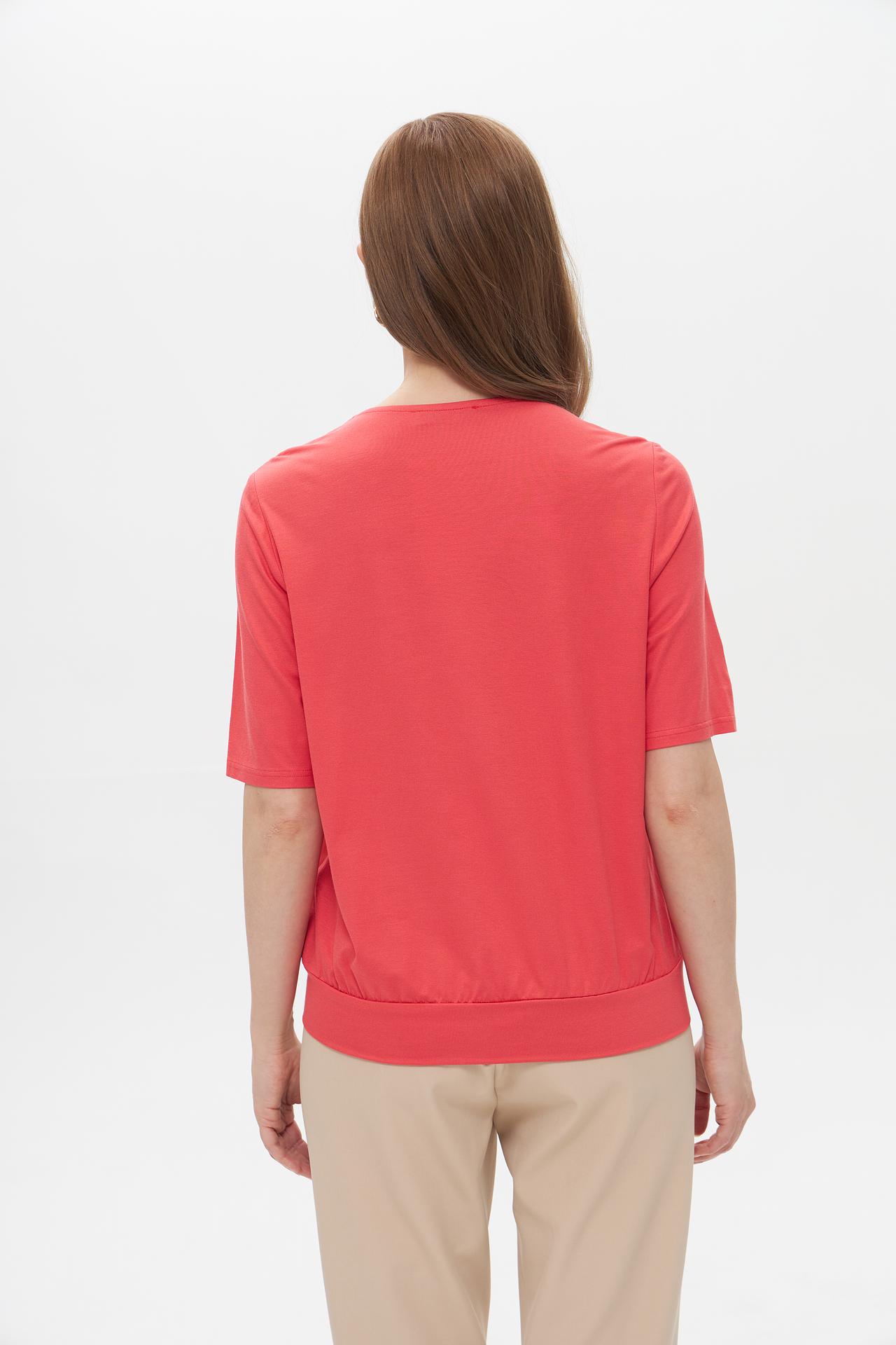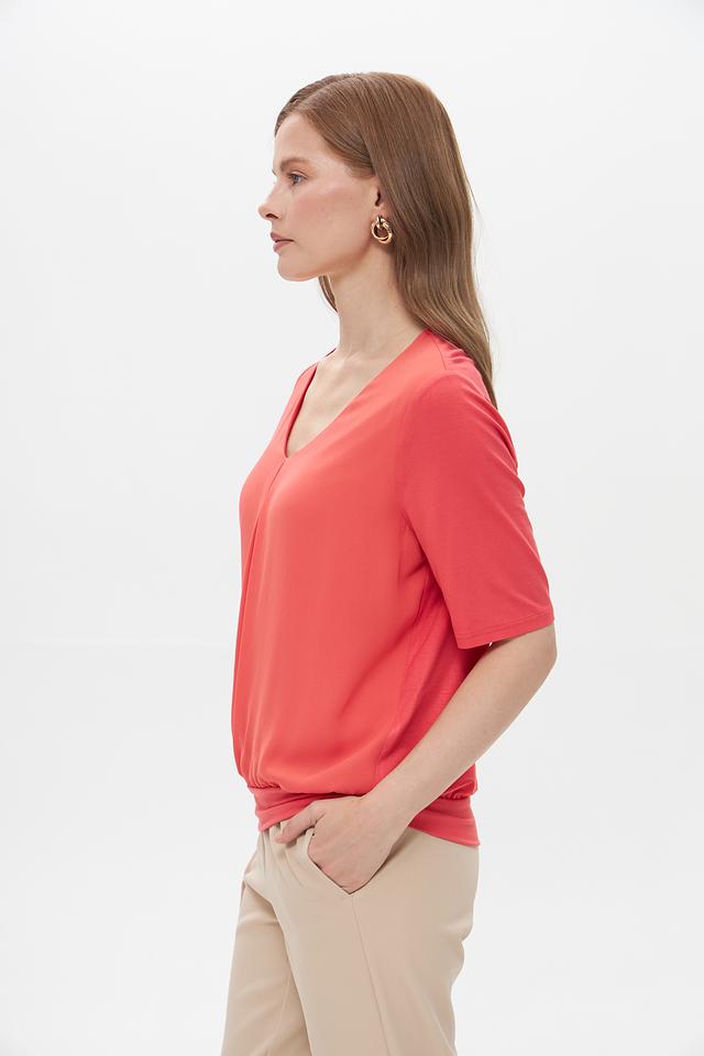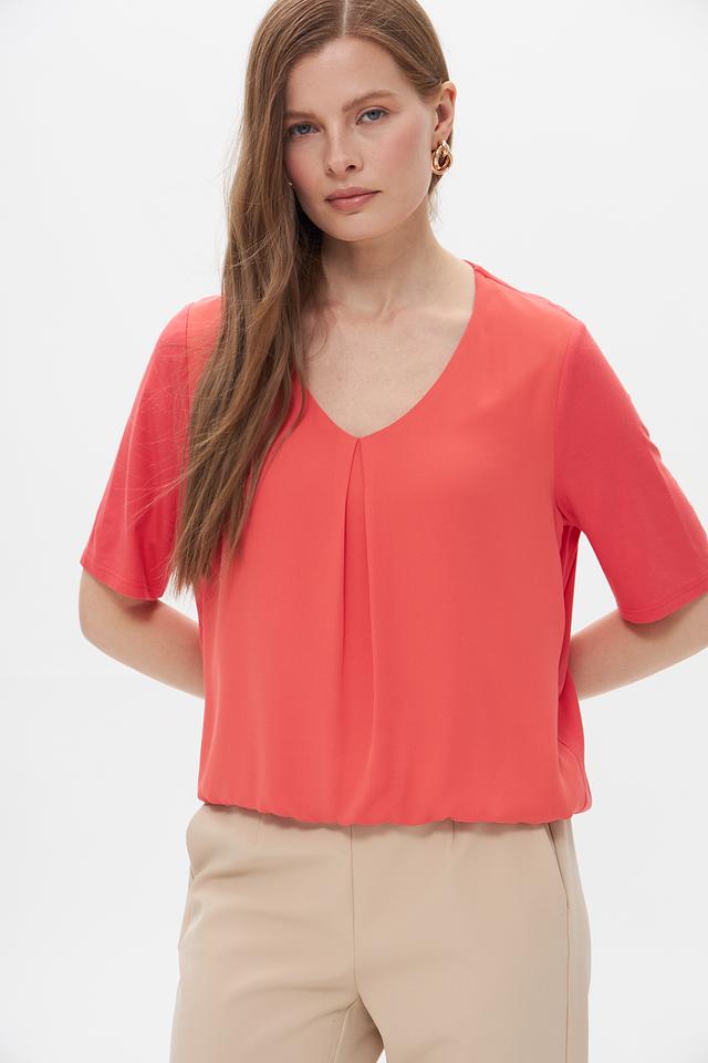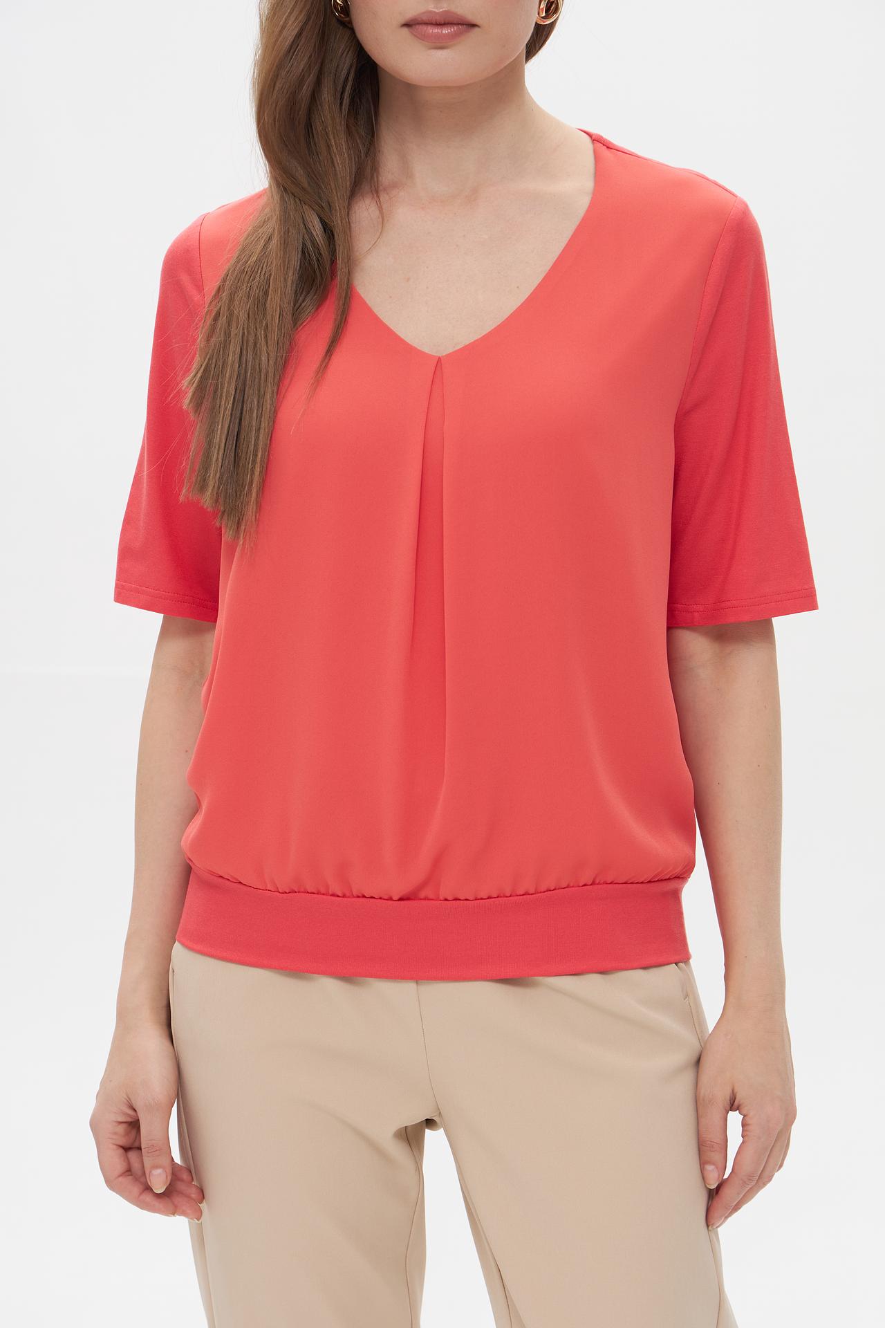 - Элегантный дизайн: V-образный вырез визуально удлиняет шею, а деликатные складки спереди добавляют изысканности и создают эффект струящегося силуэта. Короткий рукав и эластичная кулиска по низу подчеркивают фигуру, обеспечивая при этом полную свободу движений.