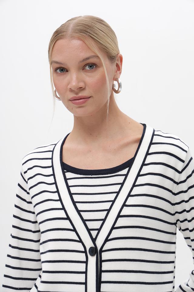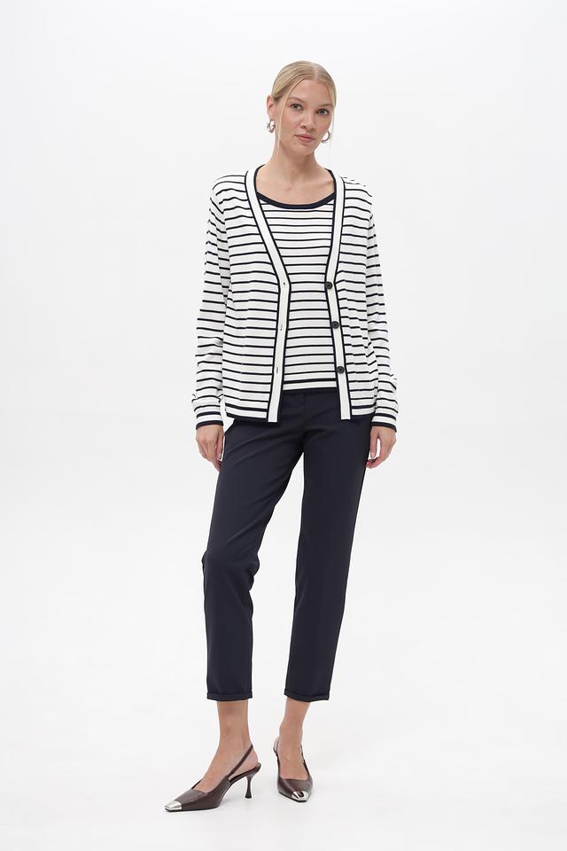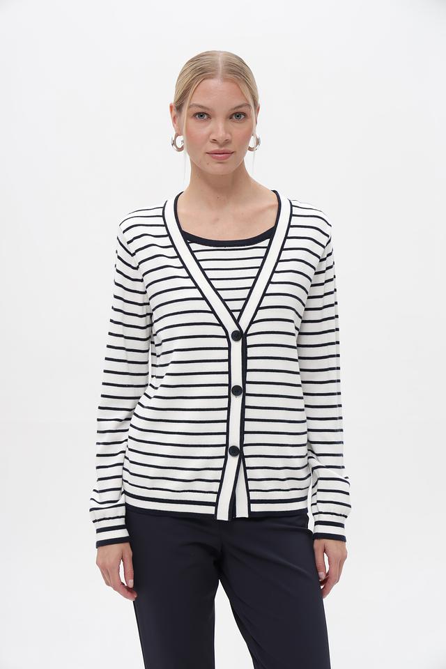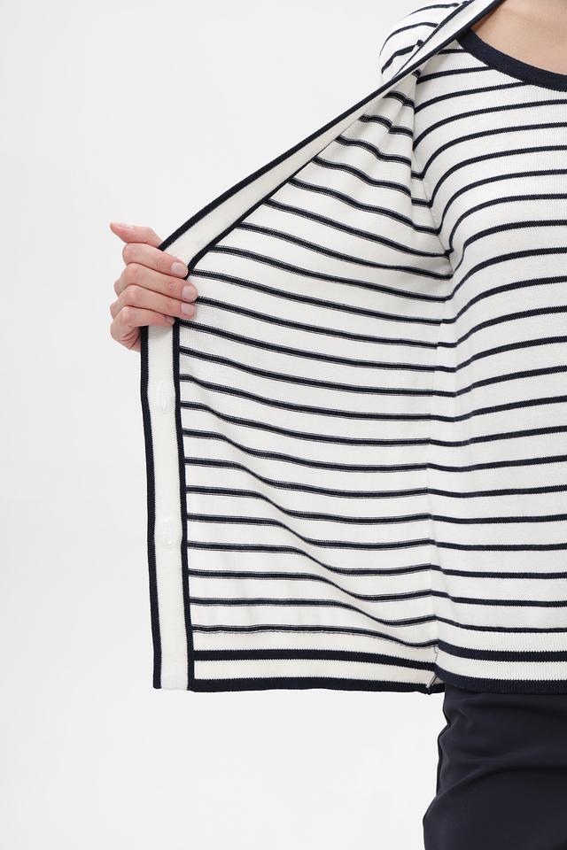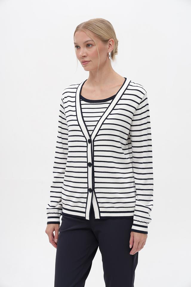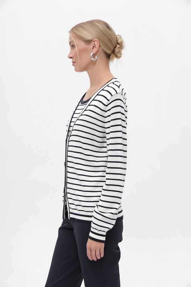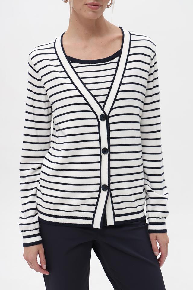 Женский кардиган Frank Walder бело-синей полоски с застежкой на пуговицы. Модель выполнена из мягкого хлопка с добавлением вискозы, обеспечивающей комфорт и приятные тактильные ощущения. Состав: хлопок 60%, вискоза 40%