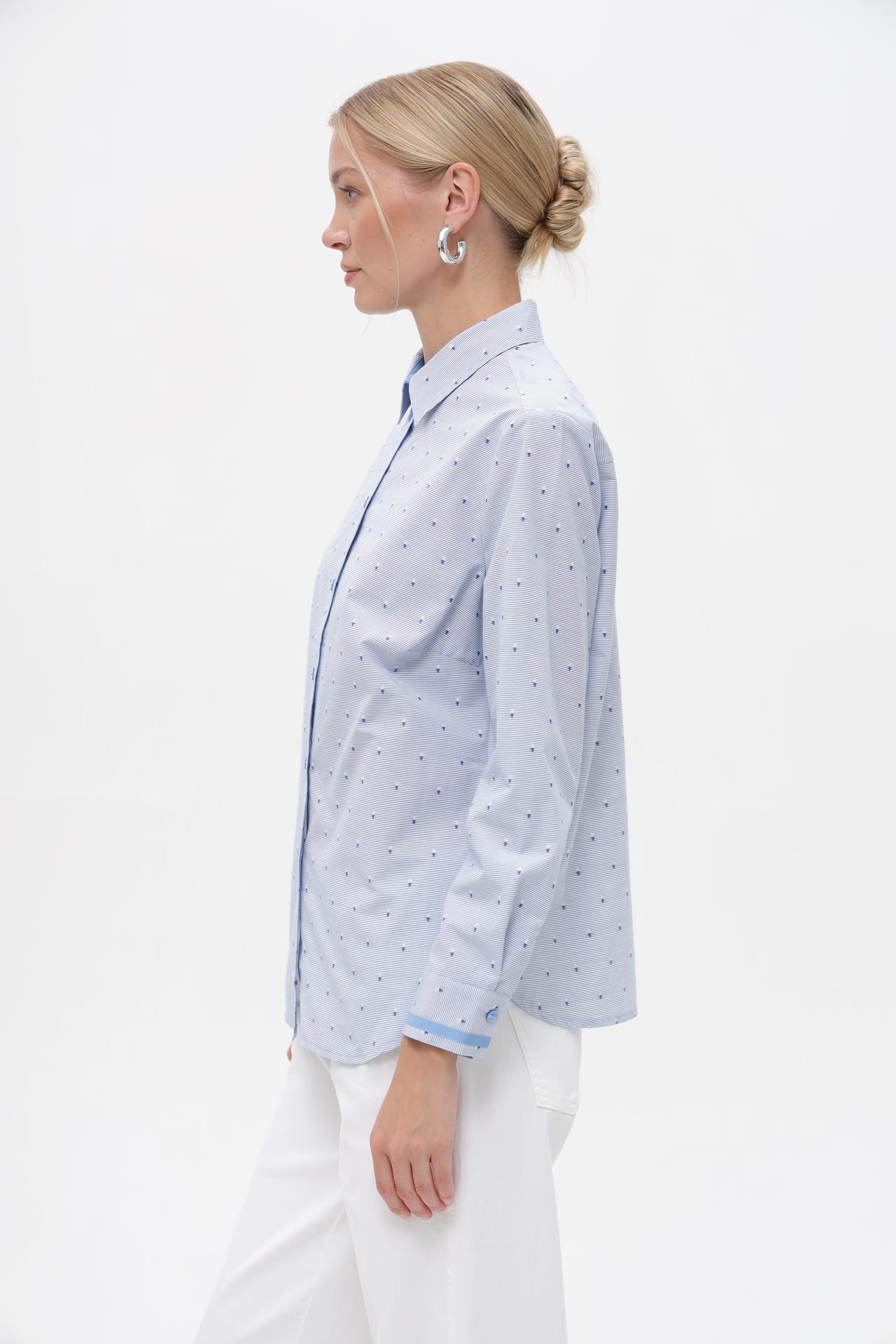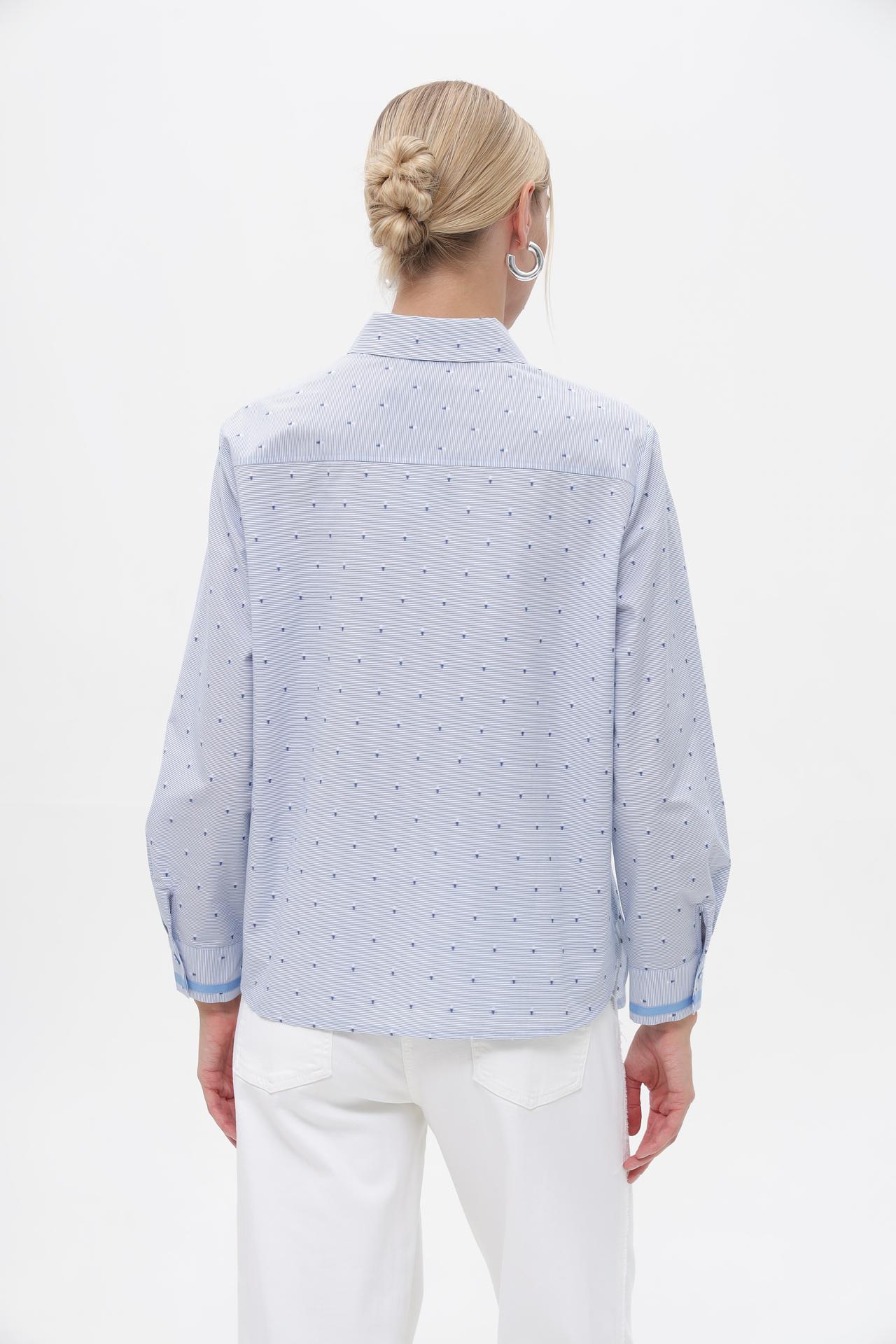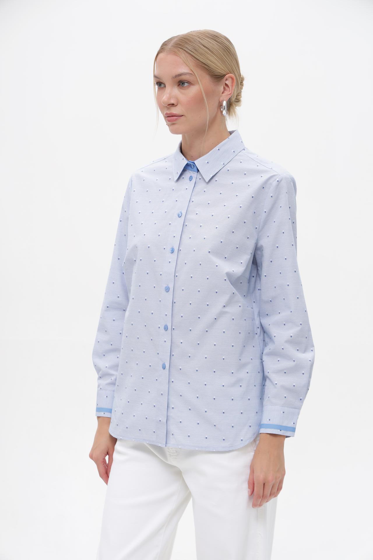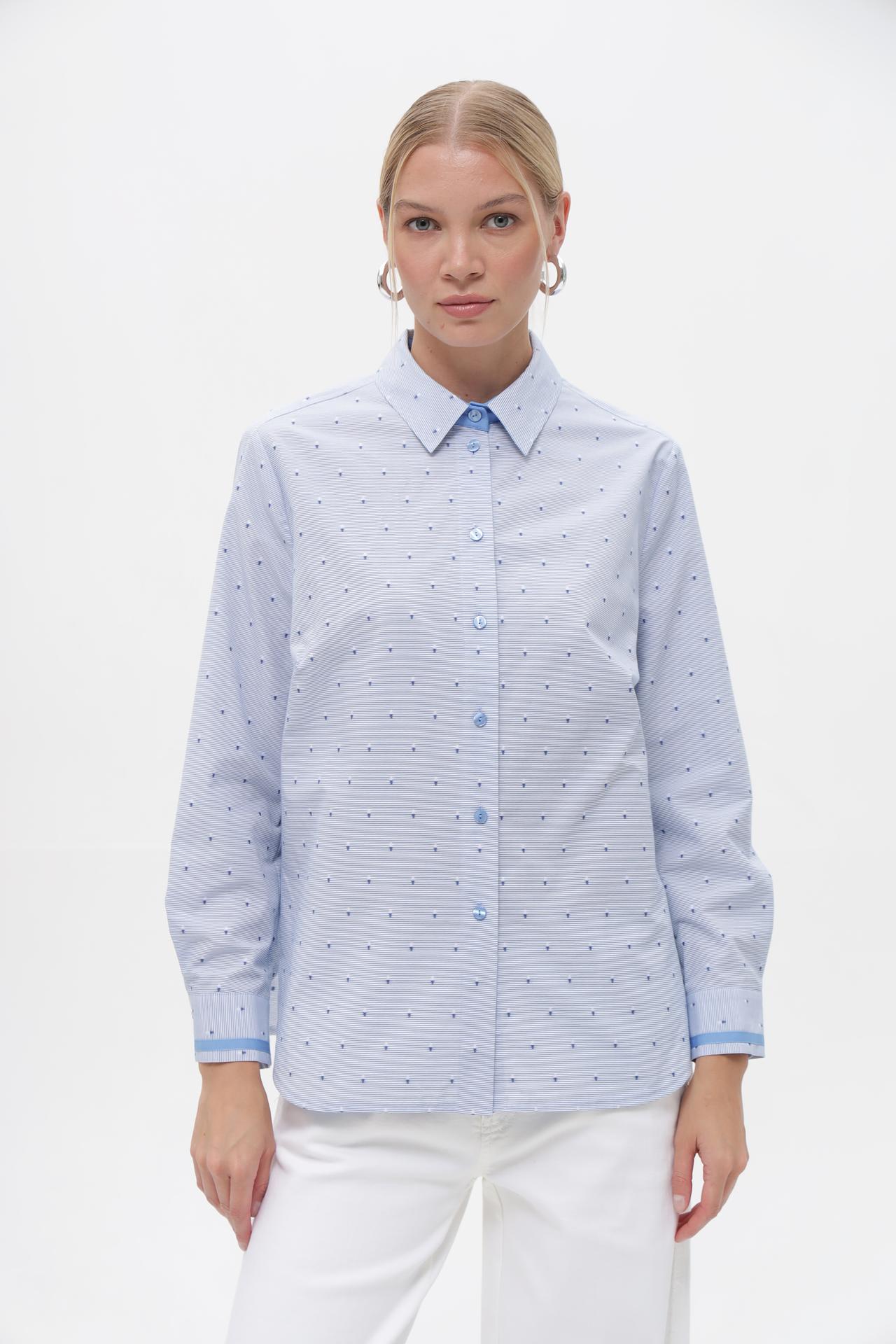 Блуза выполнена в нежном голубом цвете с мелким горошком, что придает ей легкость и женственность. Она идеально подойдет для создания как деловых, так и повседневных образов. Сочетайте ее с брюками, юбками или джинсами для создания своего неповторимого стиля.