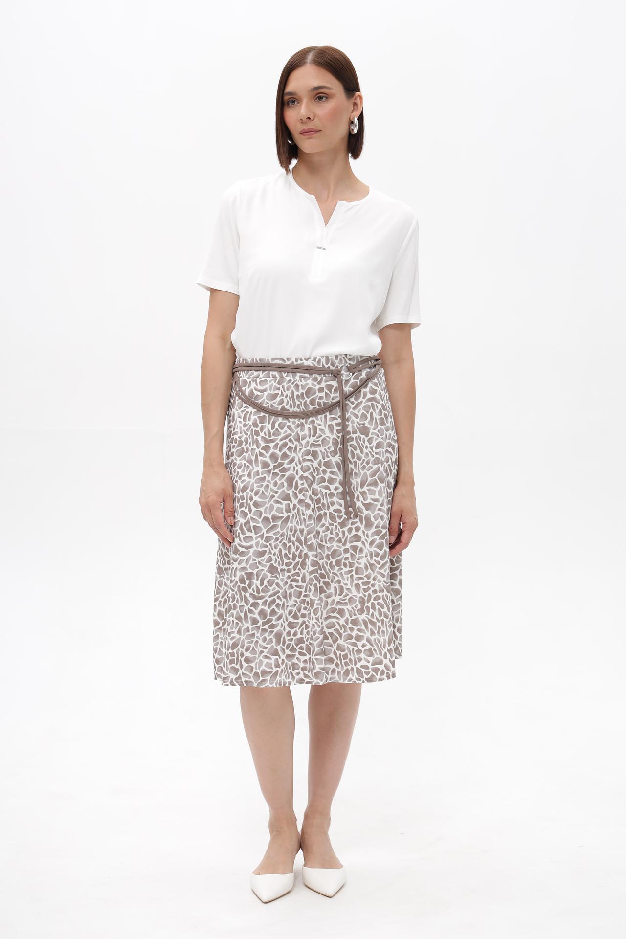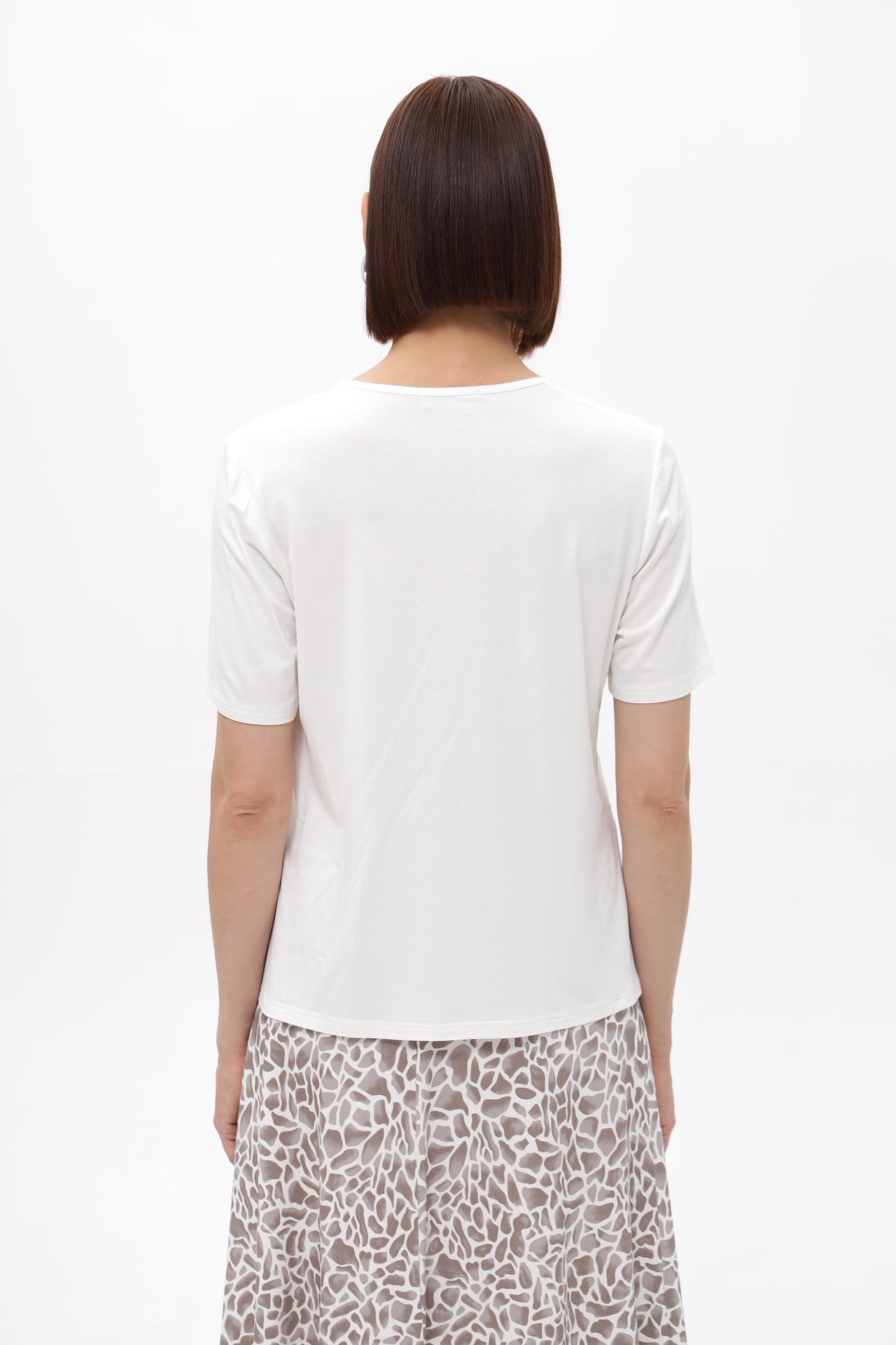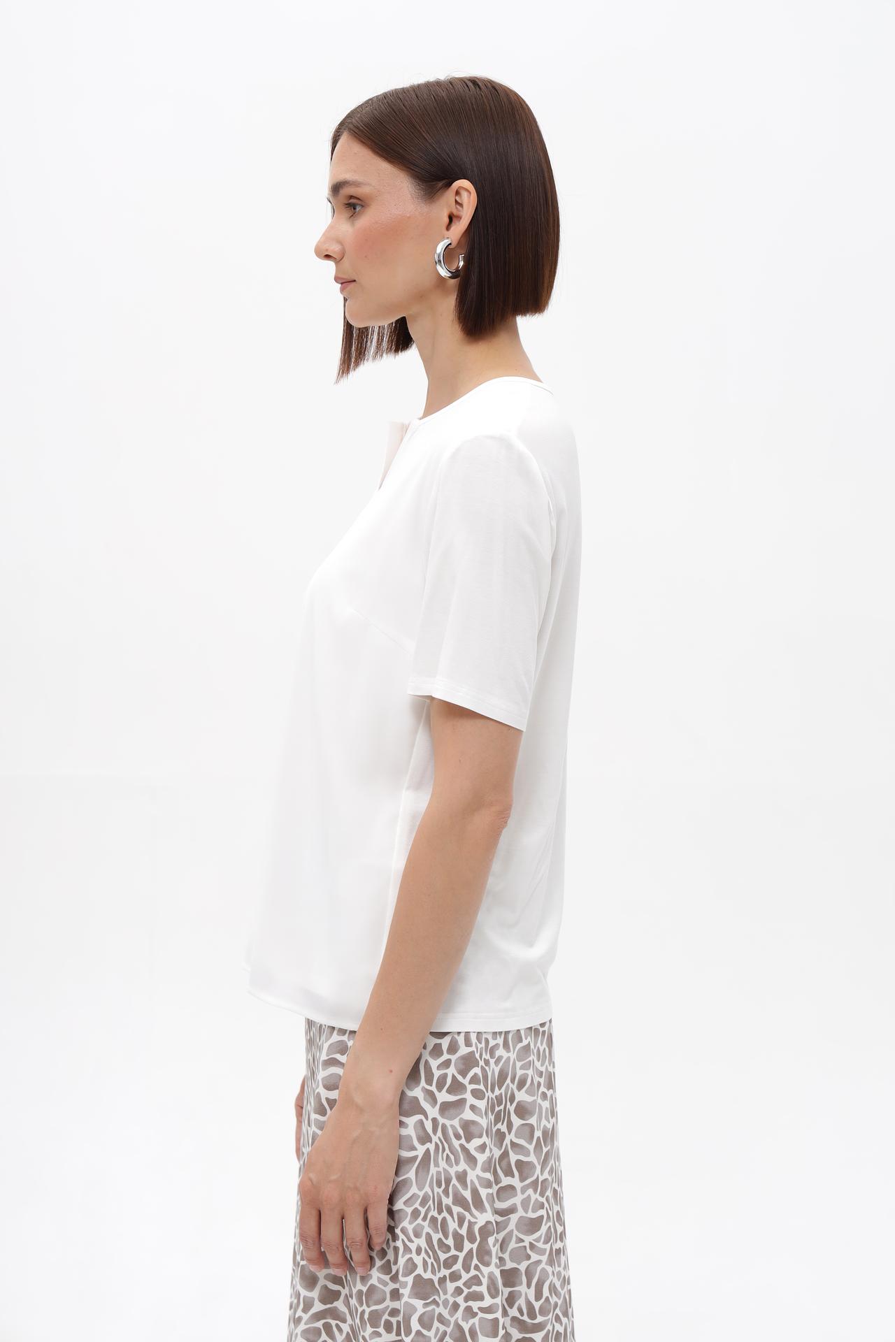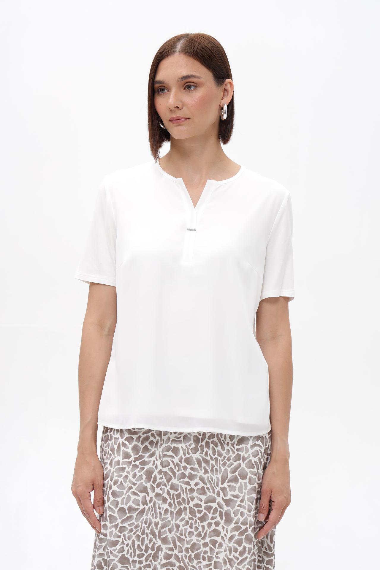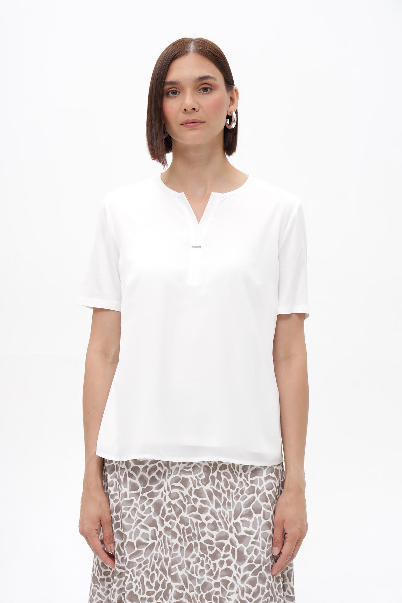 Блуза имеет лаконичный дизайн с небольшим V-образным вырезом и короткие рукава, что делает её универсальной для сочетания с различными элементами гардероба. Декоративная деталь добавляет блузе изюминку, делая образ более запоминающимся и стильным. Благодаря своему крою, блуза отлично садится по фигуре, подчеркивая ее достоинства.