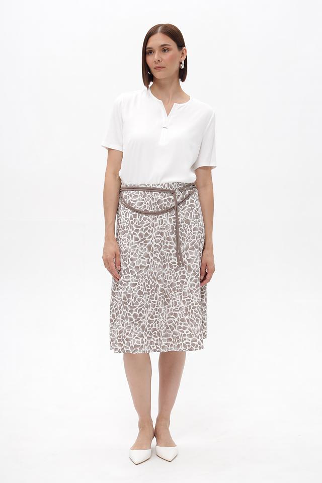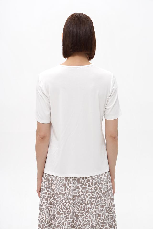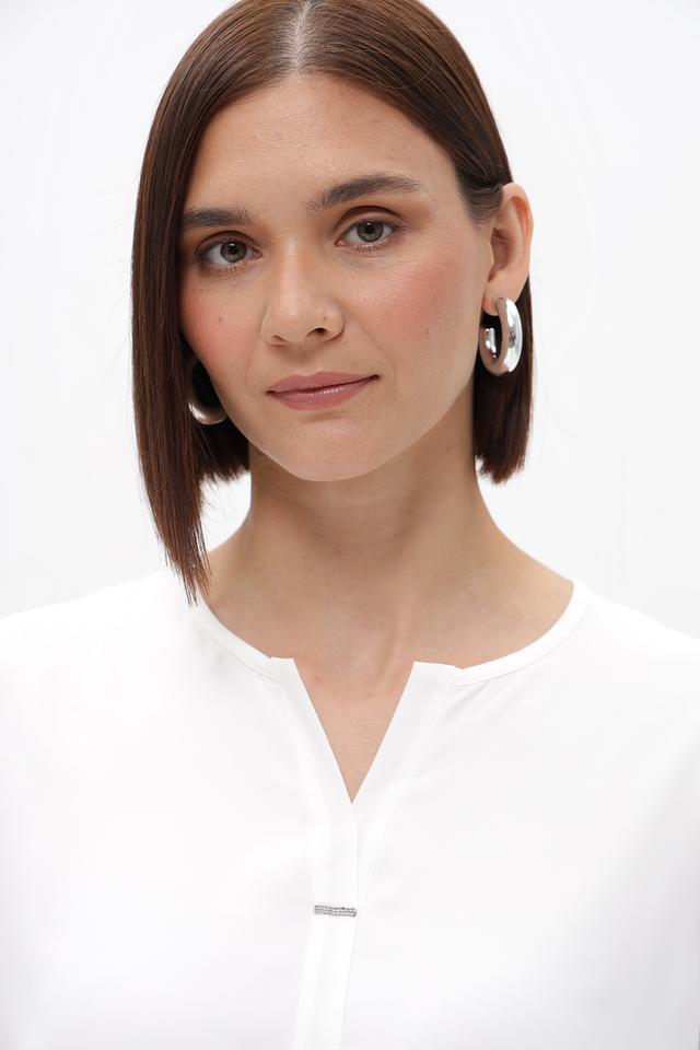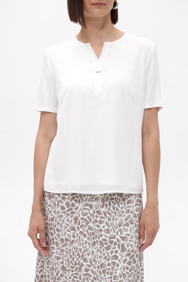 Блузка имеет прямой, слегка свободный крой, который обеспечивает комфортную посадку по фигуре. V-образный вырез деликатно подчеркивает зону декольте, а короткие рукава делают ее идеальным вариантом для теплой погоды.