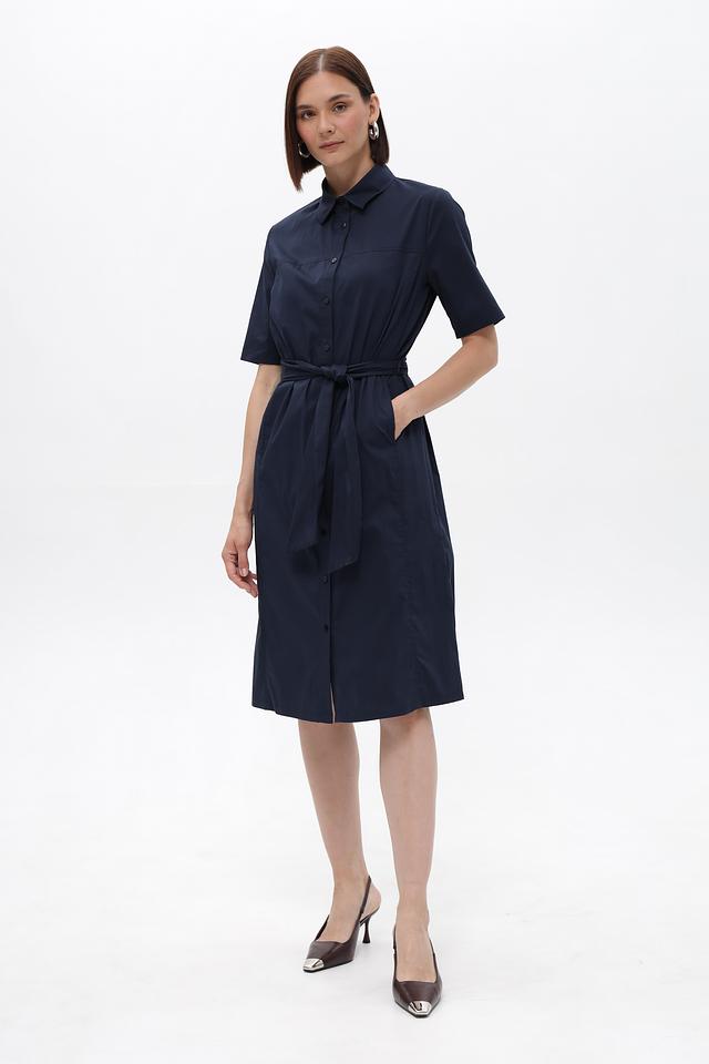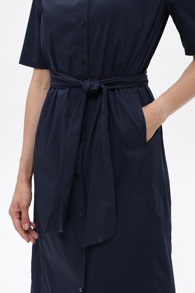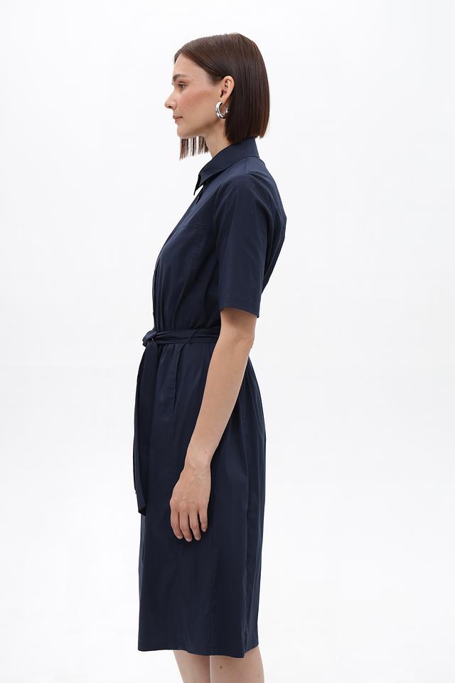 Изделие дополнено поясом в тон, который позволяет выделить талию и создать более женственный силуэт. На передней части платья расположены функциональные боковые карманы. Состав ткани: хлопок 76%, полиамид 22%, эластан 2%.
