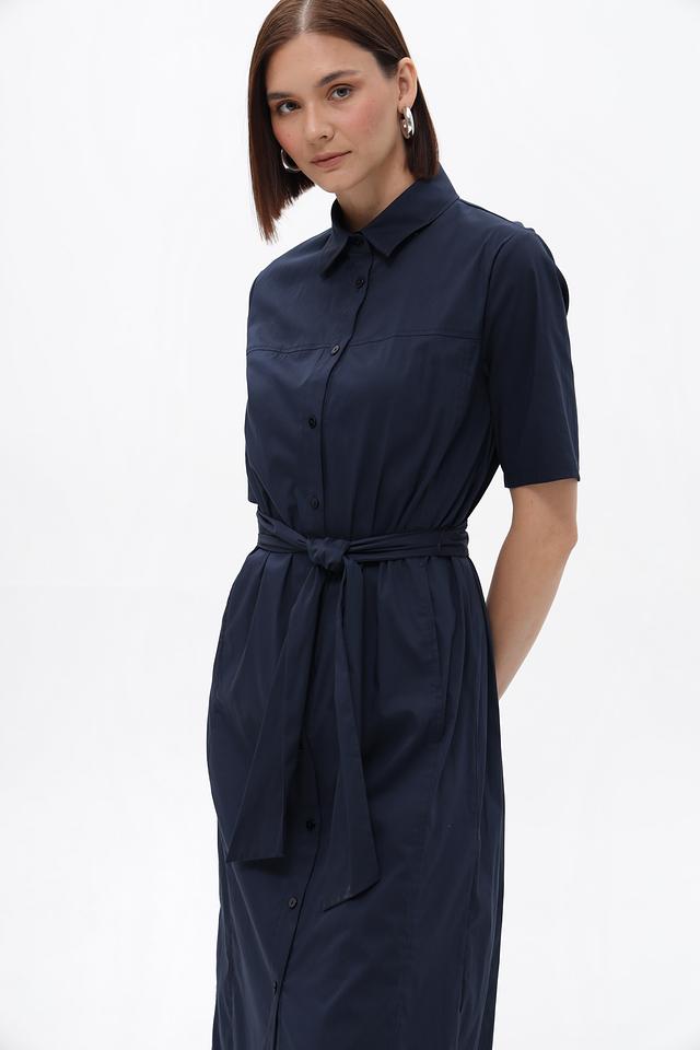Платье имеет приталенный силуэт, который подчеркивает достоинства фигуры. Застежка на пуговицы по всей длине и воротник рубашка придают изделию лаконичный и сдержанный вид. Короткие рукава делают платье идеальным выбором для теплой погоды.