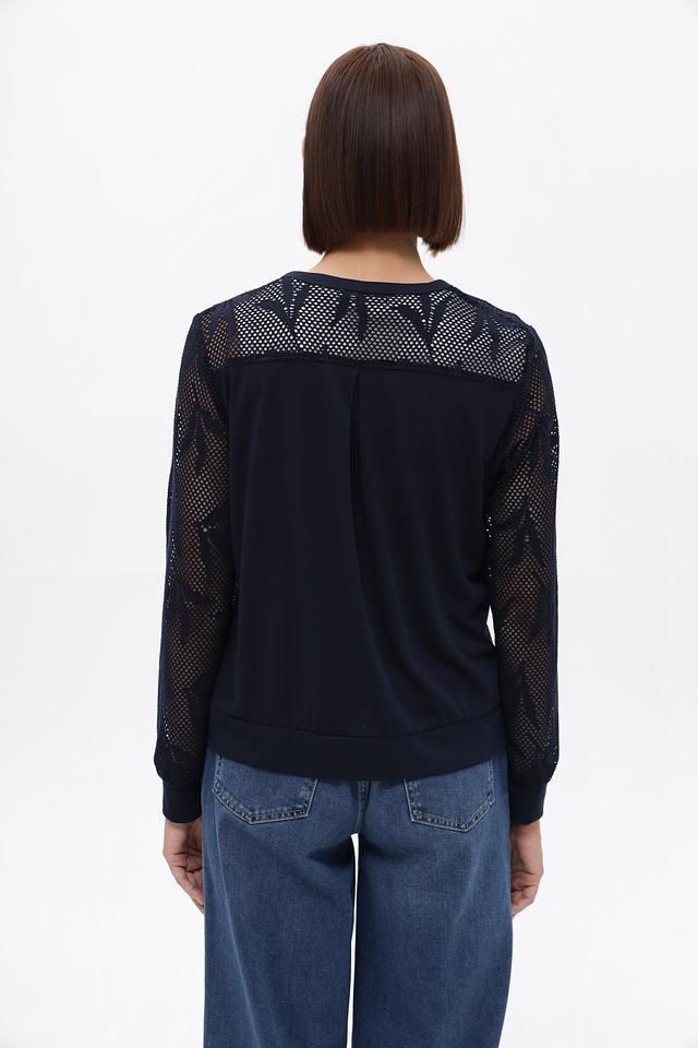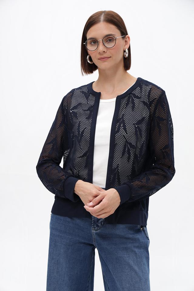 Этот жакет от Frank Walder станет ярким акцентом вашего образа. Модель выполнена в глубоком синем цвете и отличается оригинальным дизайном благодаря кружевной вставке на плечах и рукавах.