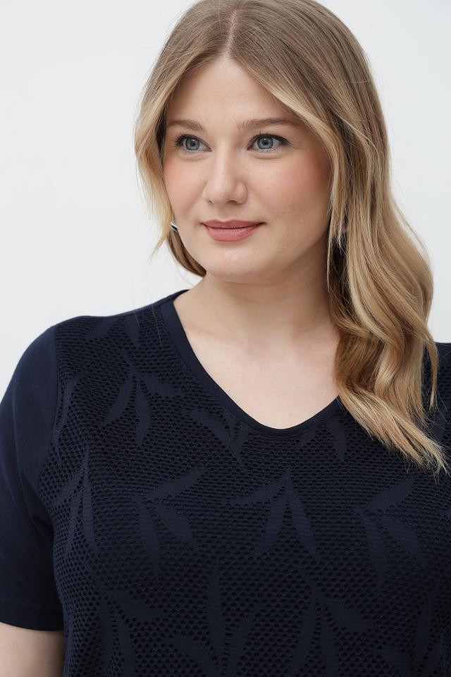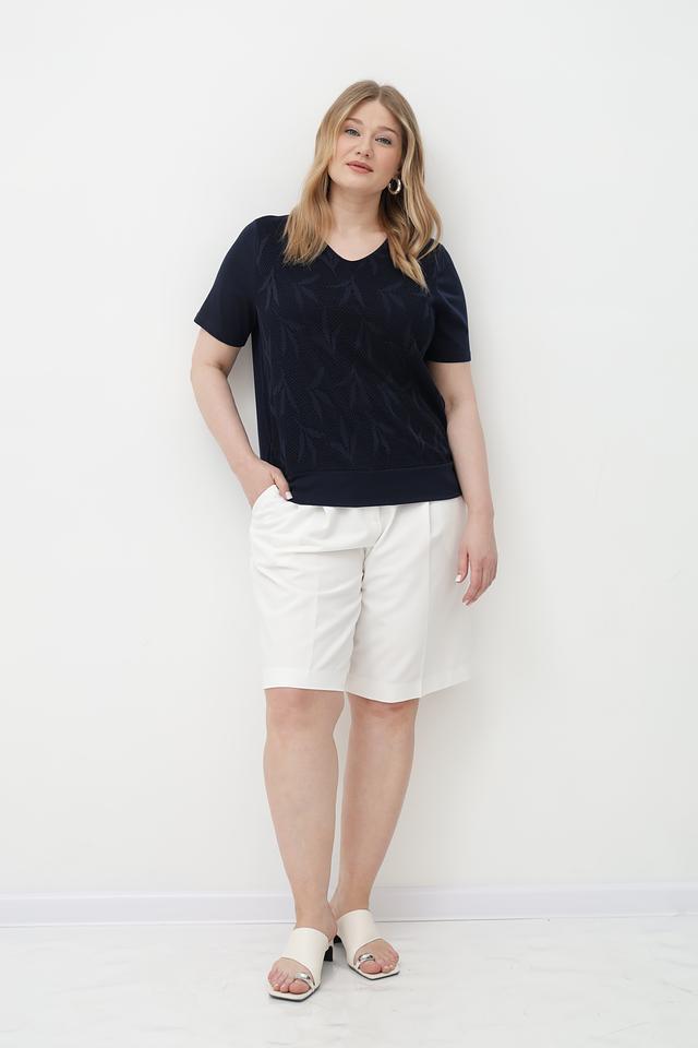 Футболка имеет классический крой с короткими рукавами и V-образным вырезом. Особенностью модели является стильный геометрический узор, выполненный в технике жаккарда, который придает ей изысканность и оригинальность.