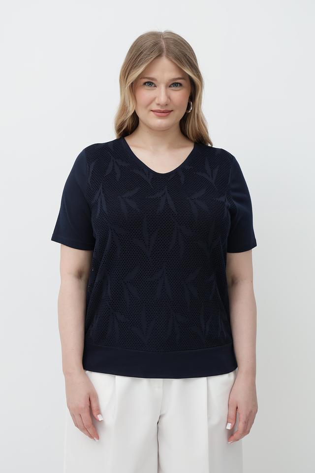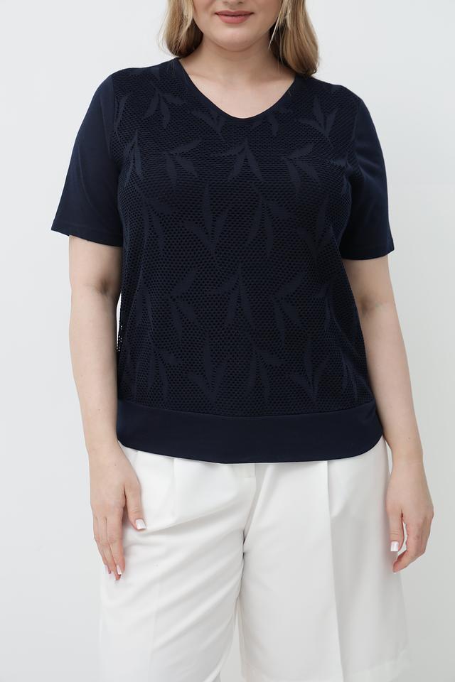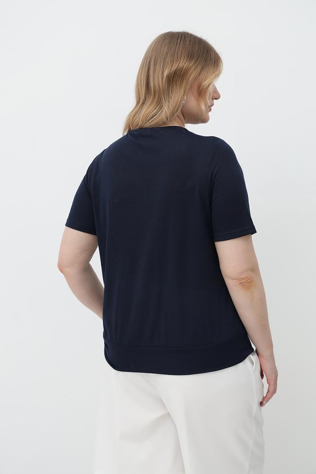 Тёмно-синий цвет футболки универсален и легко сочетается с различными элементами одежды. Она идеально подойдет для создания повседневных образов, а также для более формальных мероприятий в сочетании с жакетом или пиджаком.