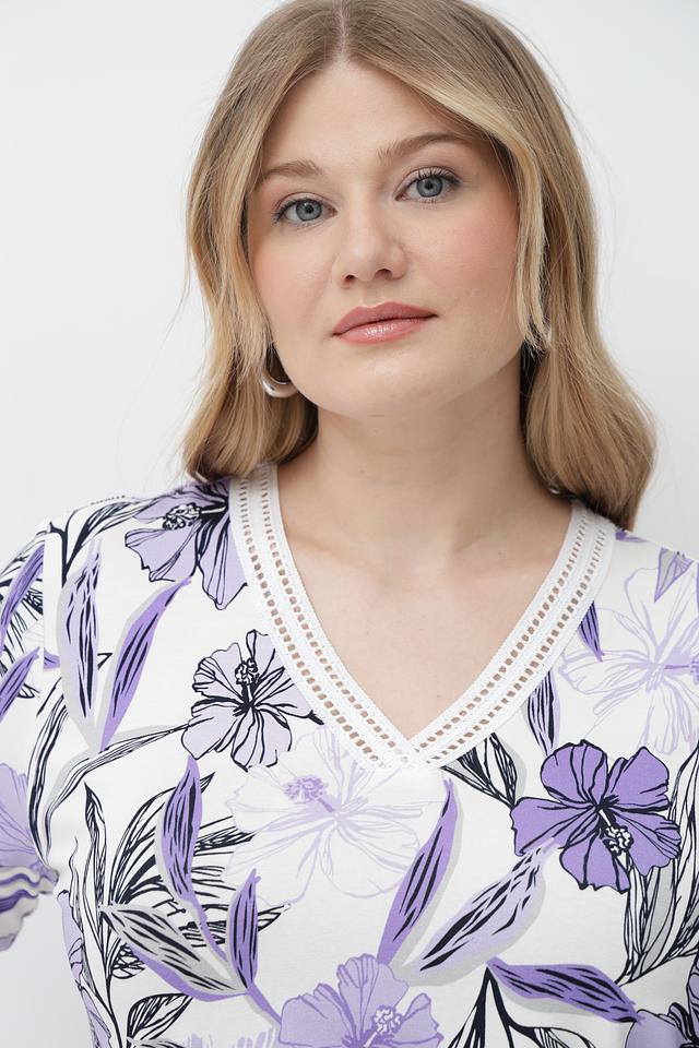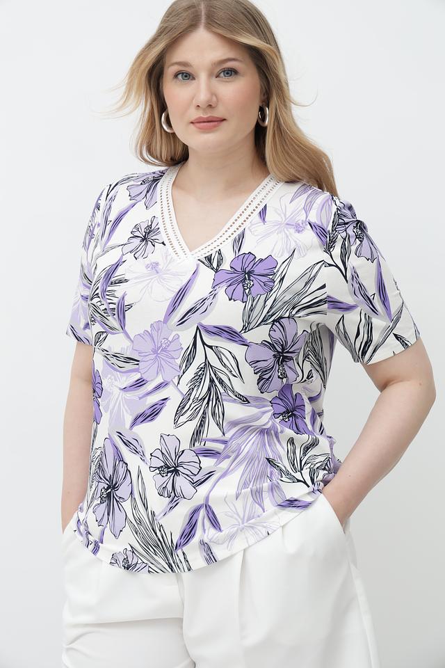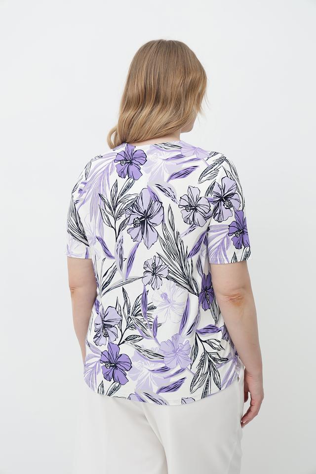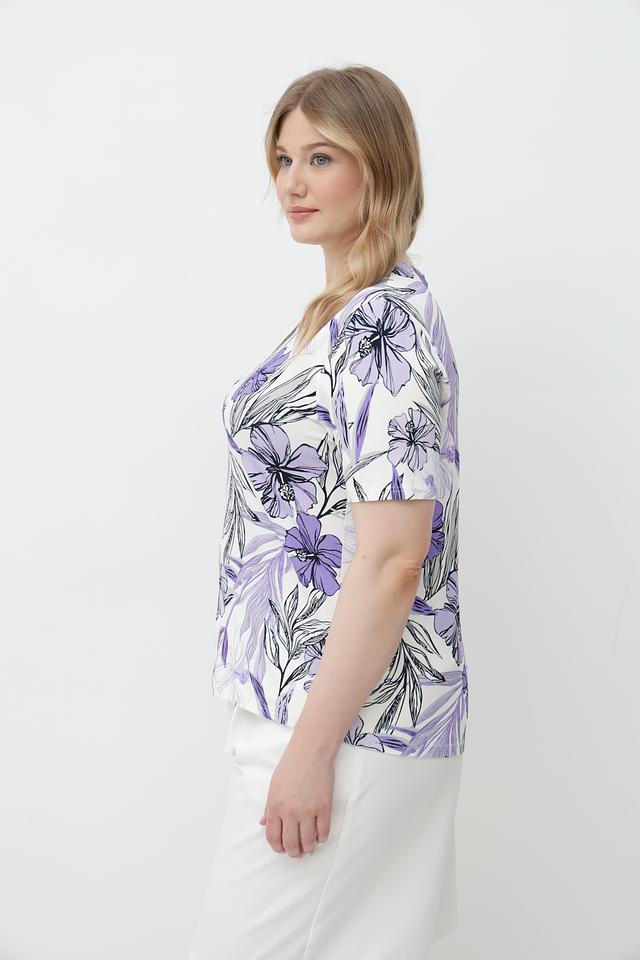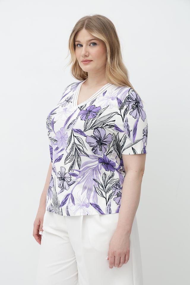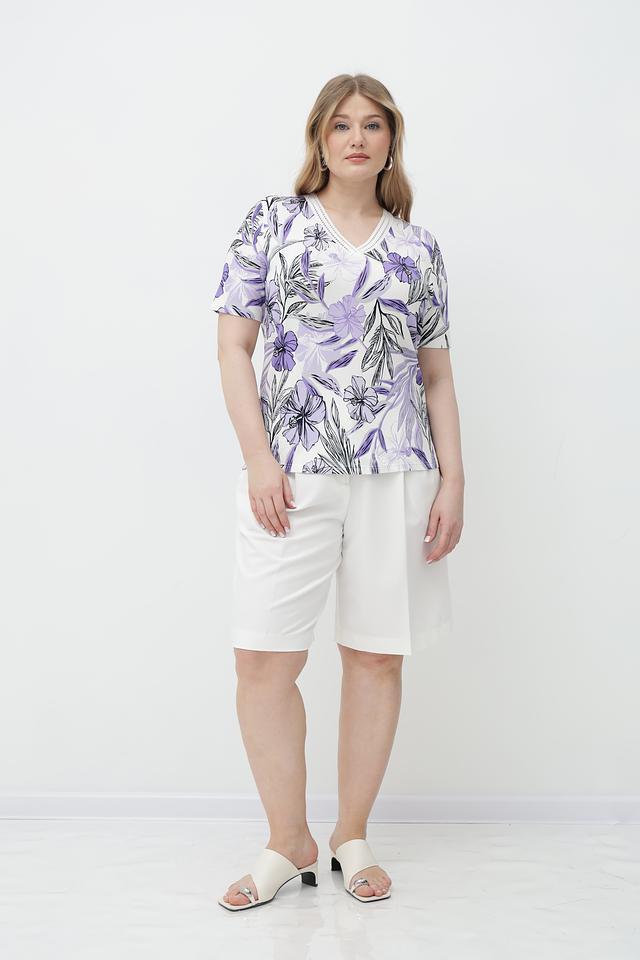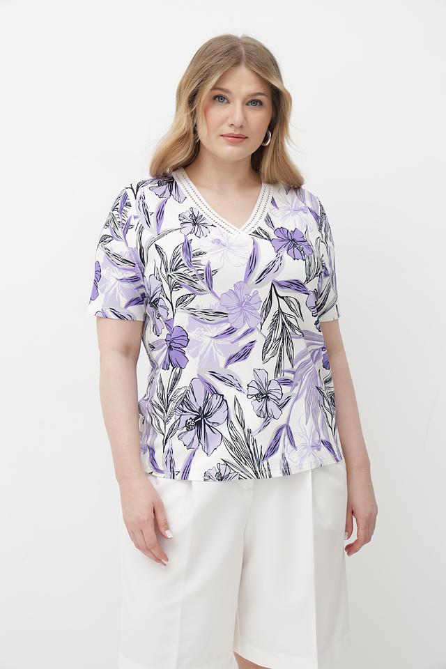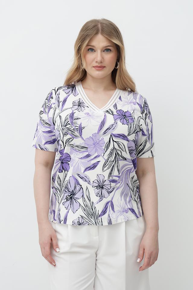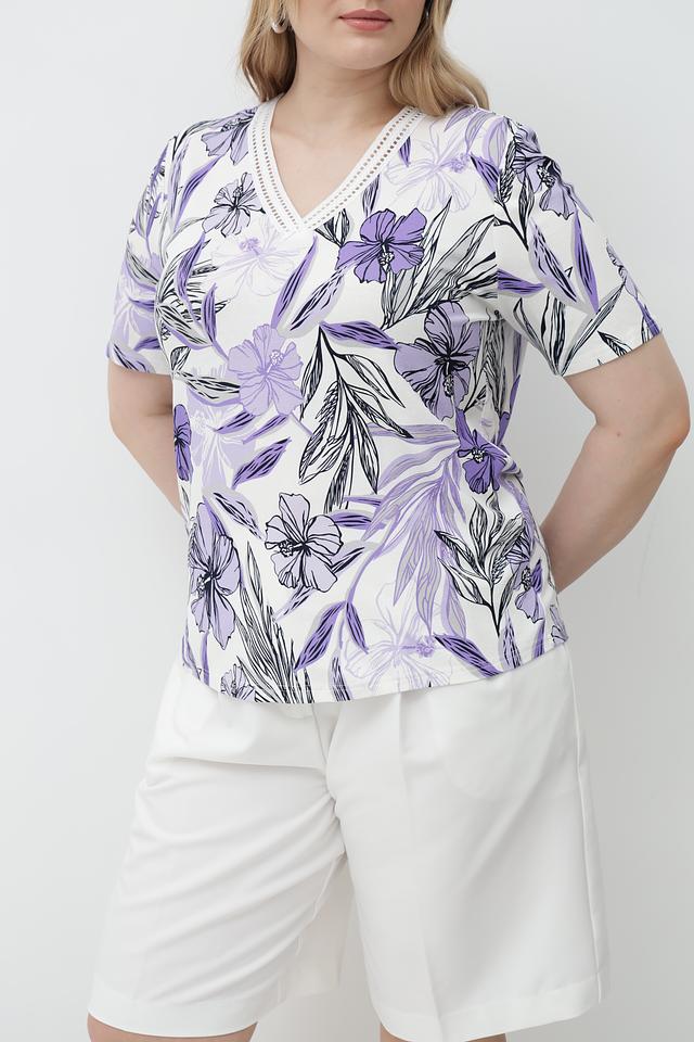 Футболка имеет лавандовый цвет и украшена ярким цветочным принтом, который придает ей женственность и легкость. V-образный вырез подчеркивает линию шеи, а короткие рукава делают ее идеальным выбором для теплой погоды.