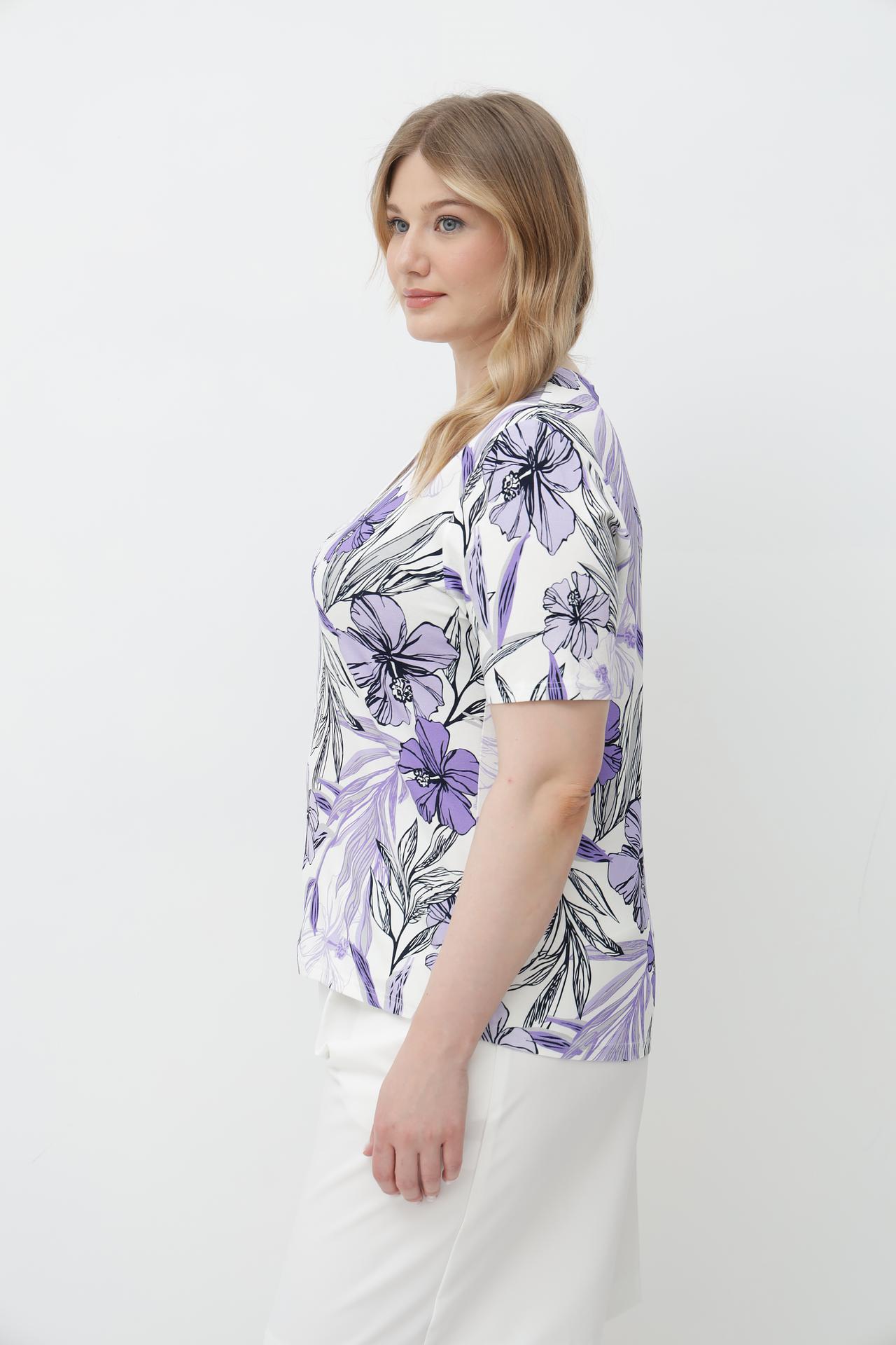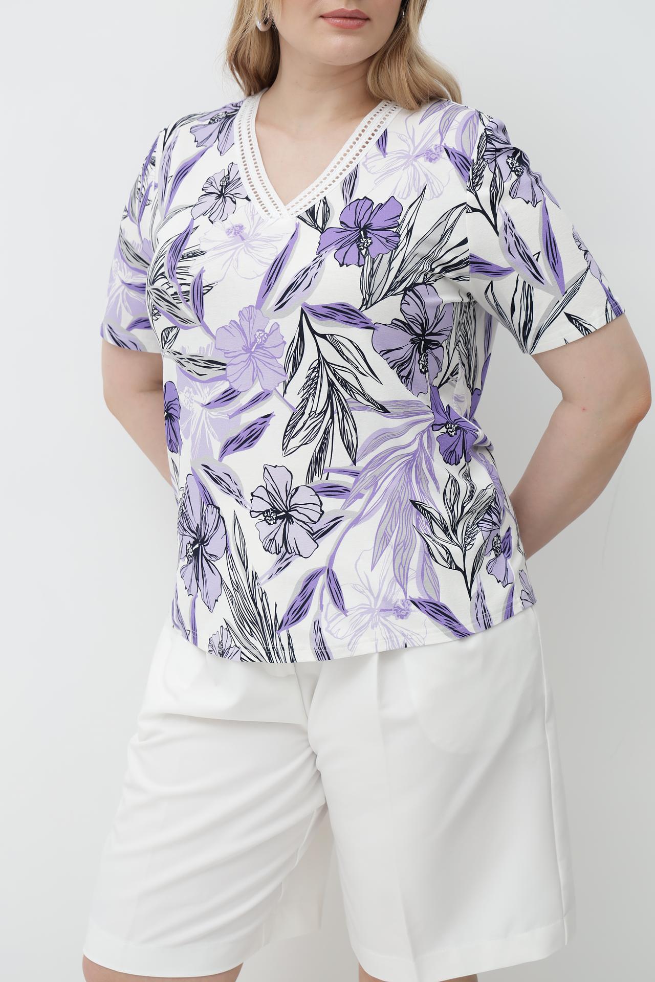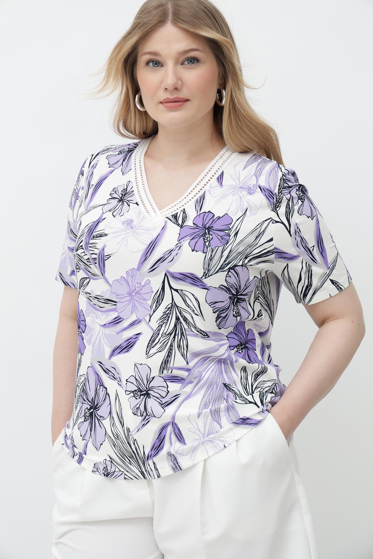 - Элегантный дизайн: Цветочный принт придает образу женственность и свежесть, делая эту футболку отличным выбором для любого случая.