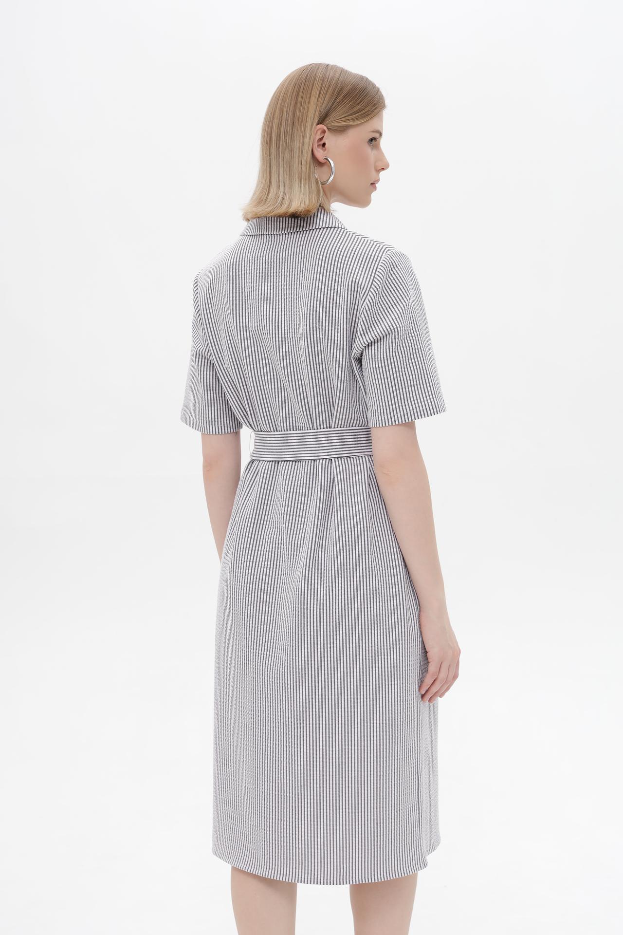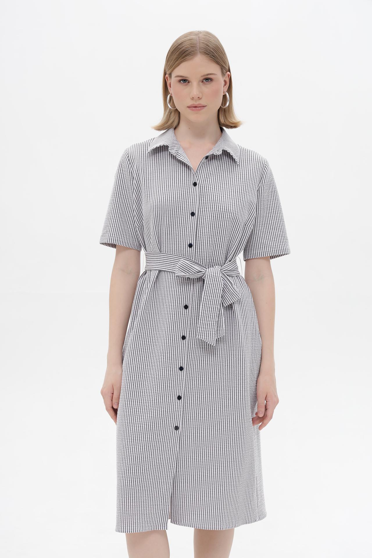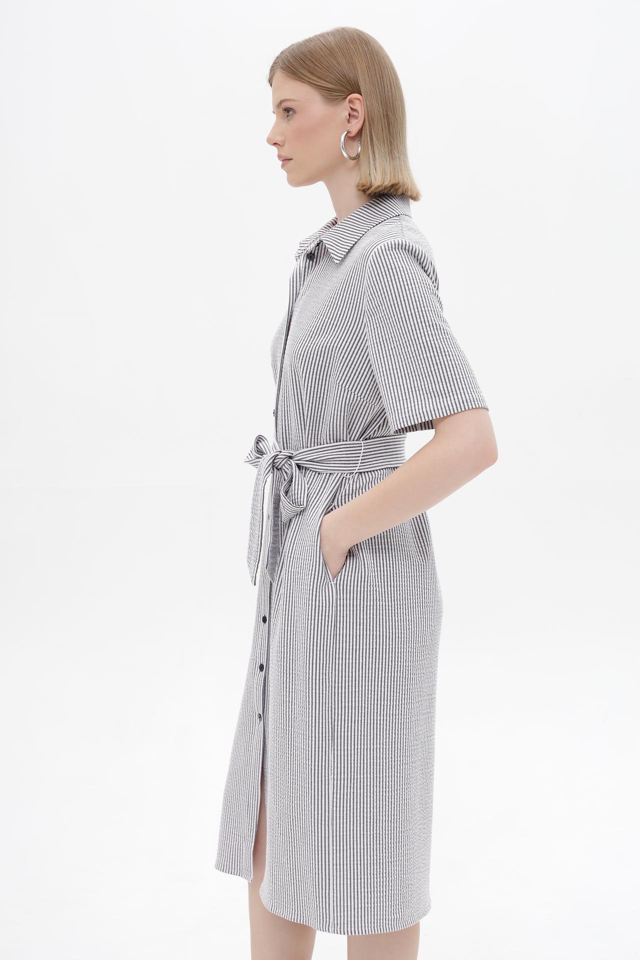 - Дизайн: Классический крой рубашечного платья в мелкую полоску с поясом на талии. Это универсальное решение, которое подходит для любого типа фигуры.