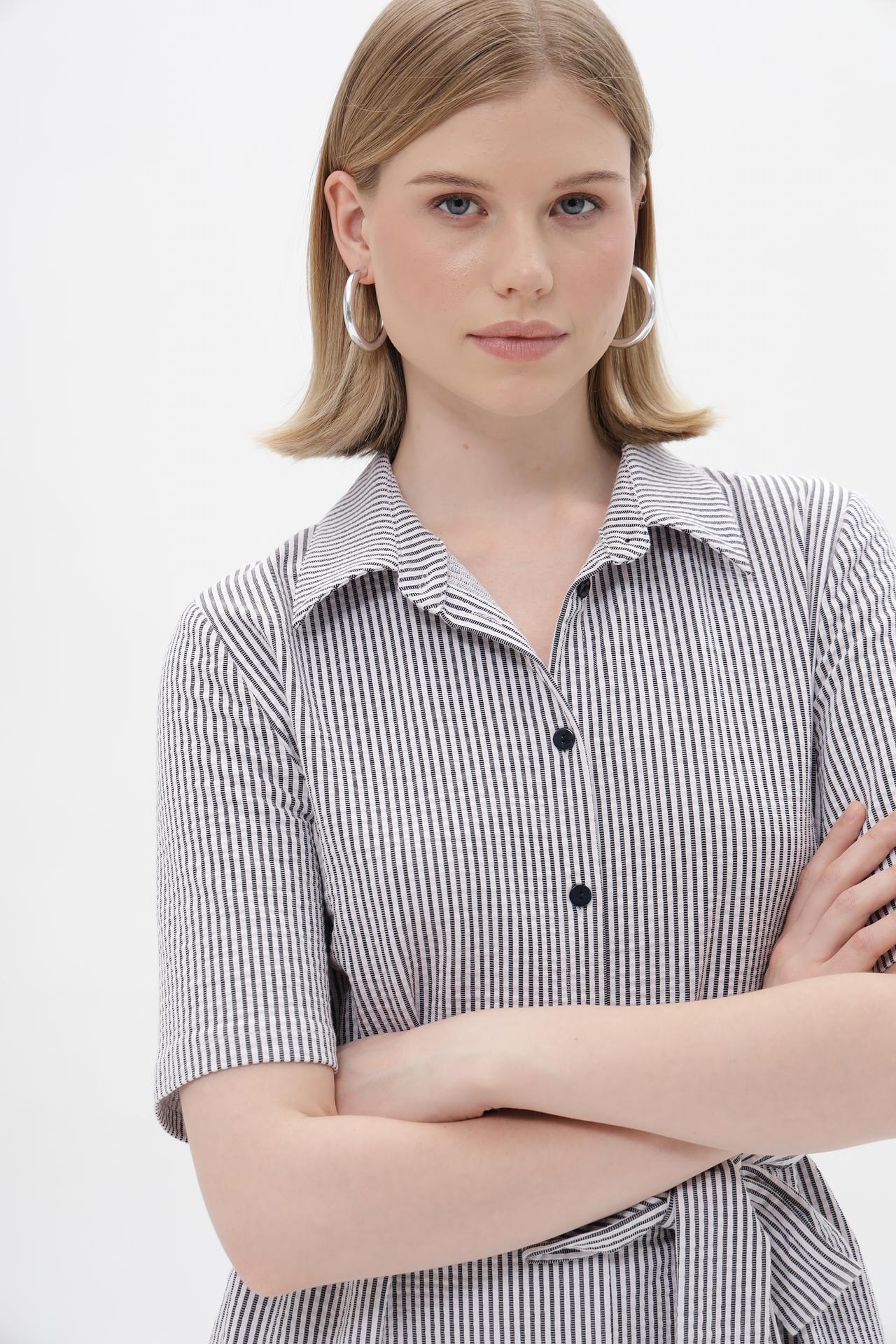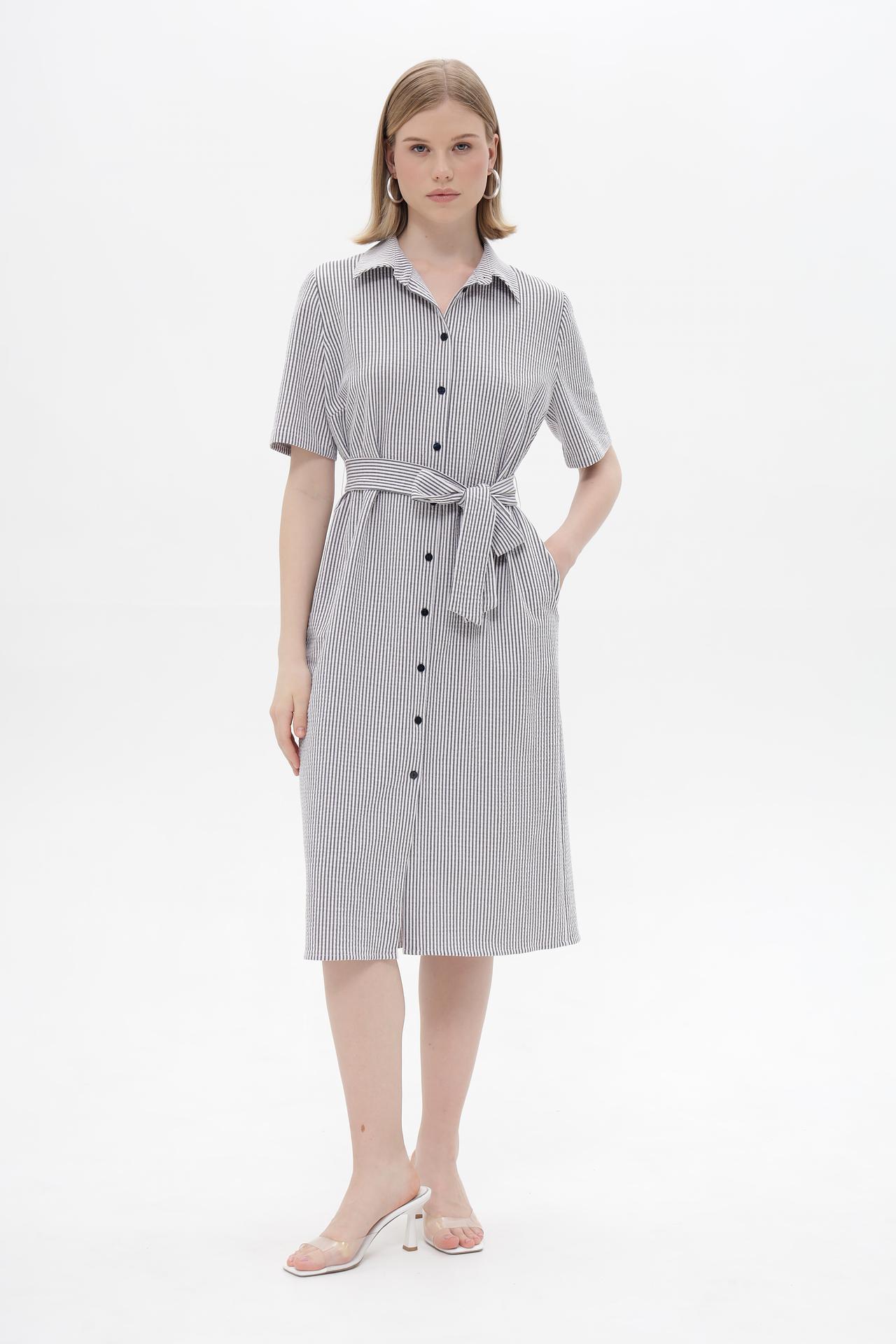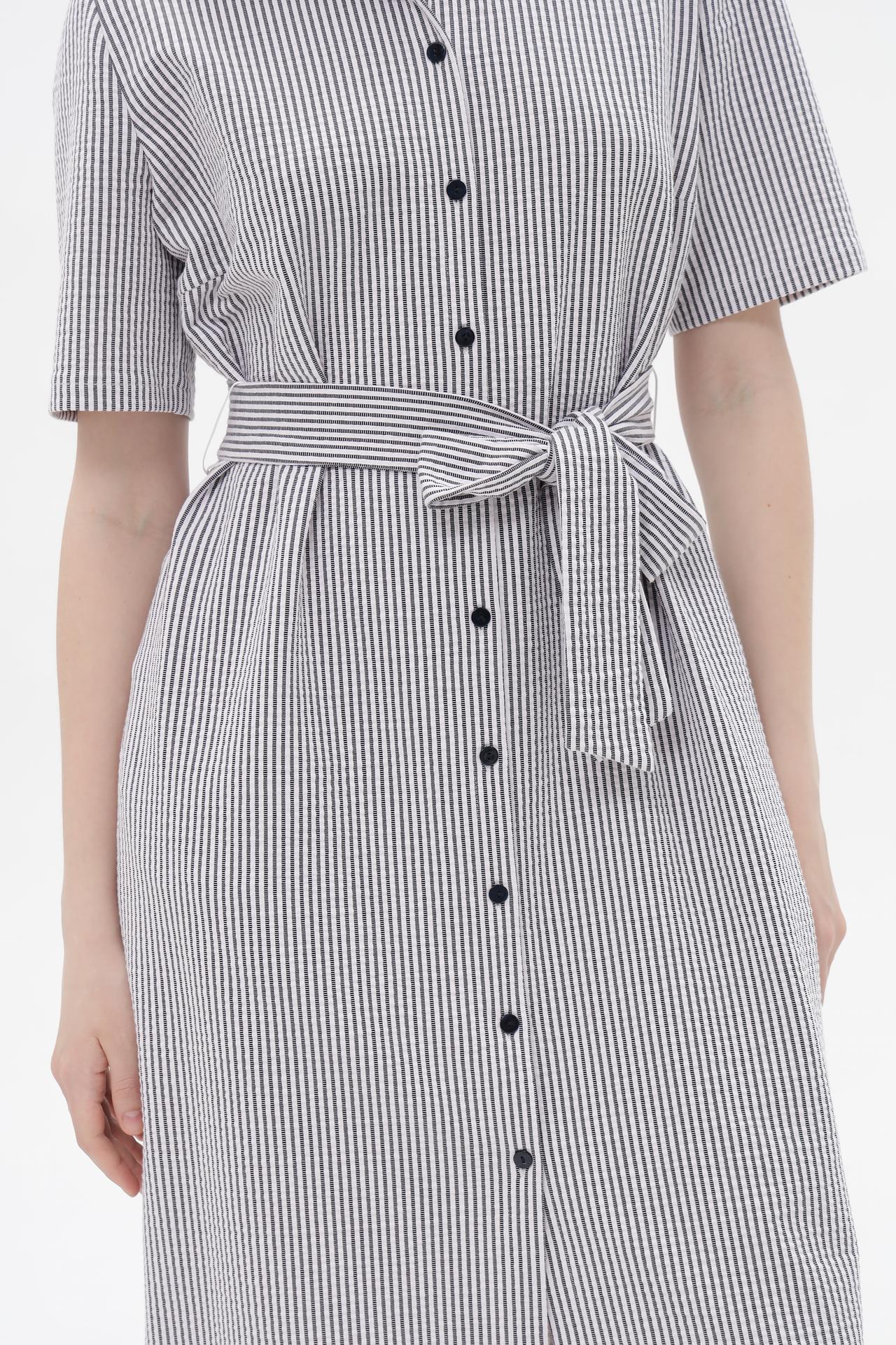 - Дизайн: Классический крой рубашечного платья в мелкую полоску с поясом на талии. Это универсальное решение, которое подходит для любого типа фигуры.