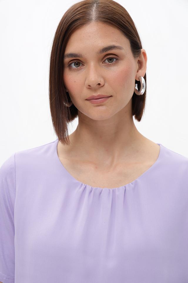Женская блузка от Frank Walder лавандового цвета, выполненная из высококачественной вискозы с добавлением эластана. Модель имеет свободный крой, короткие рукава и округлый вырез горловины, собранный небольшой складкой.