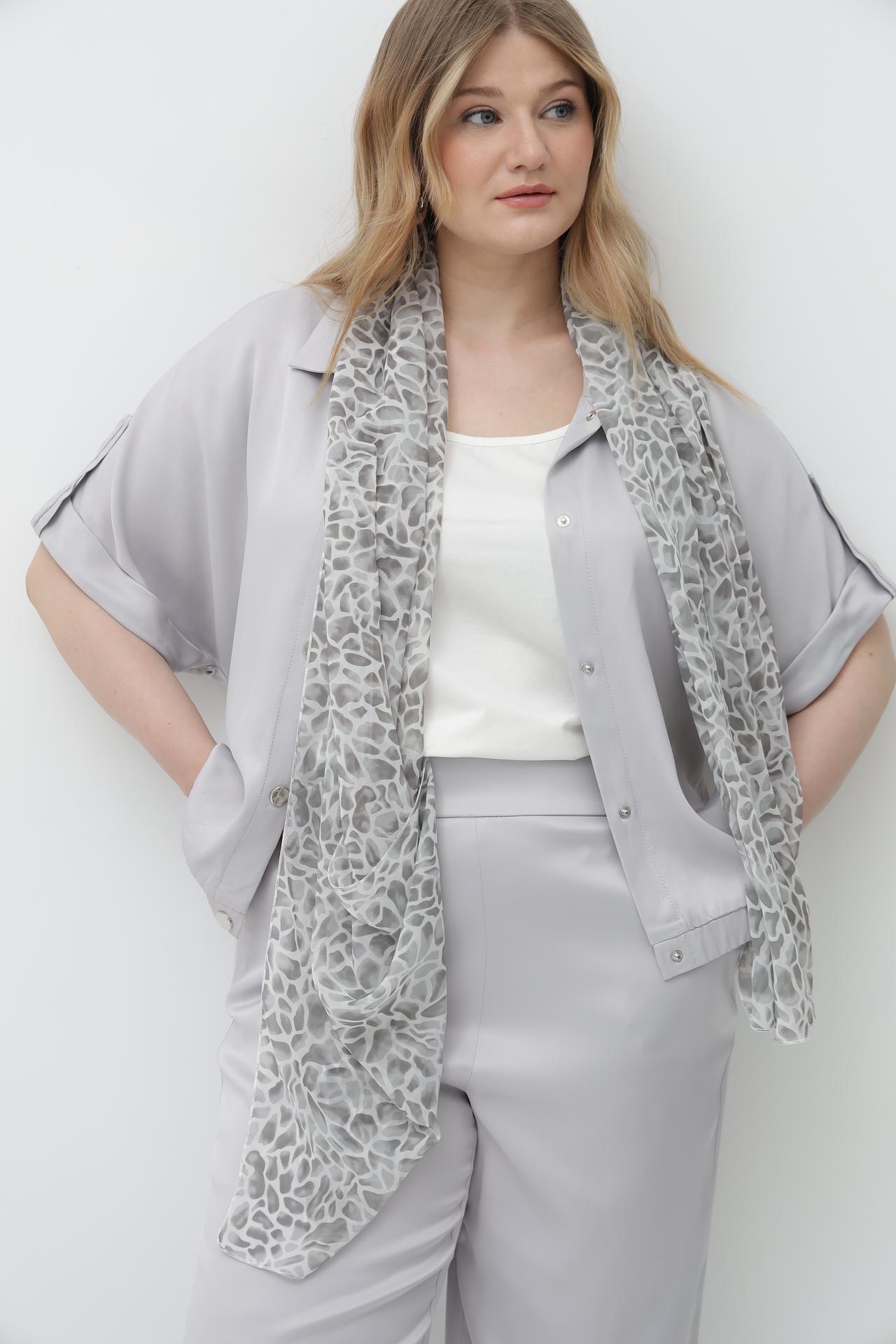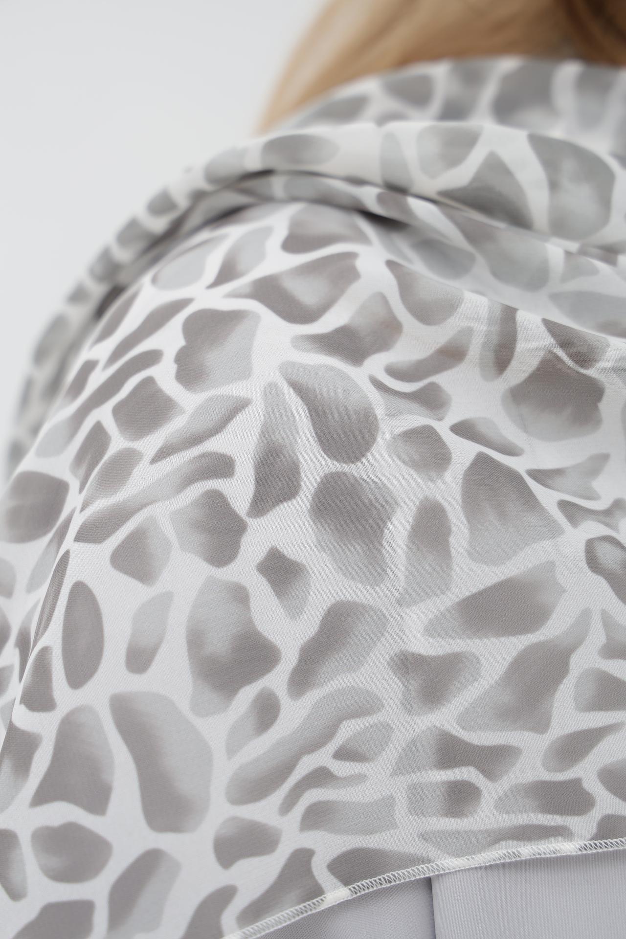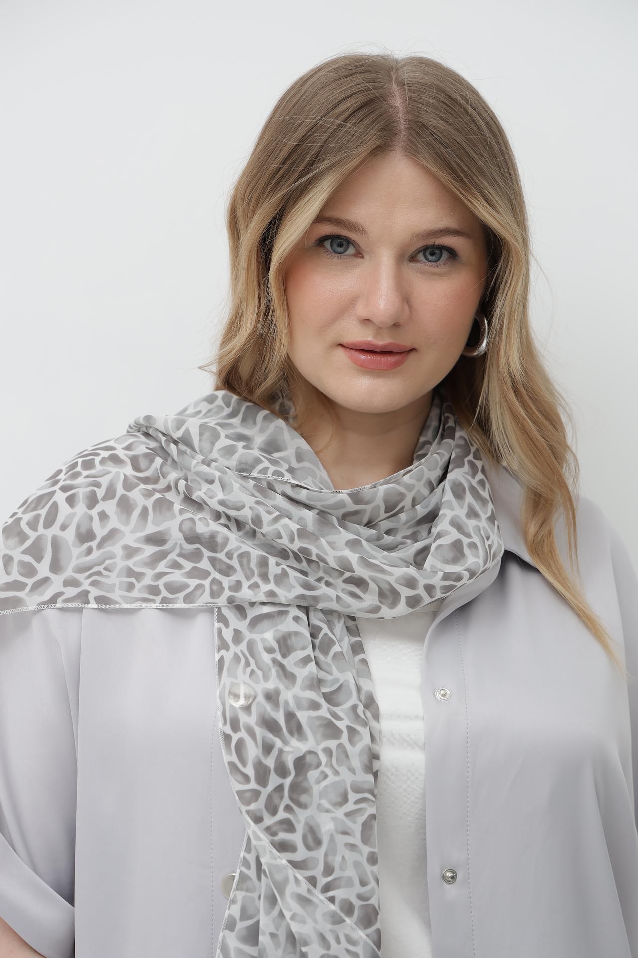 - Дизайн: Шарф украшен стильным абстрактным принтом в серо-белых тонах. Оригинальный узор привлекает внимание и подчеркивает индивидуальность.
