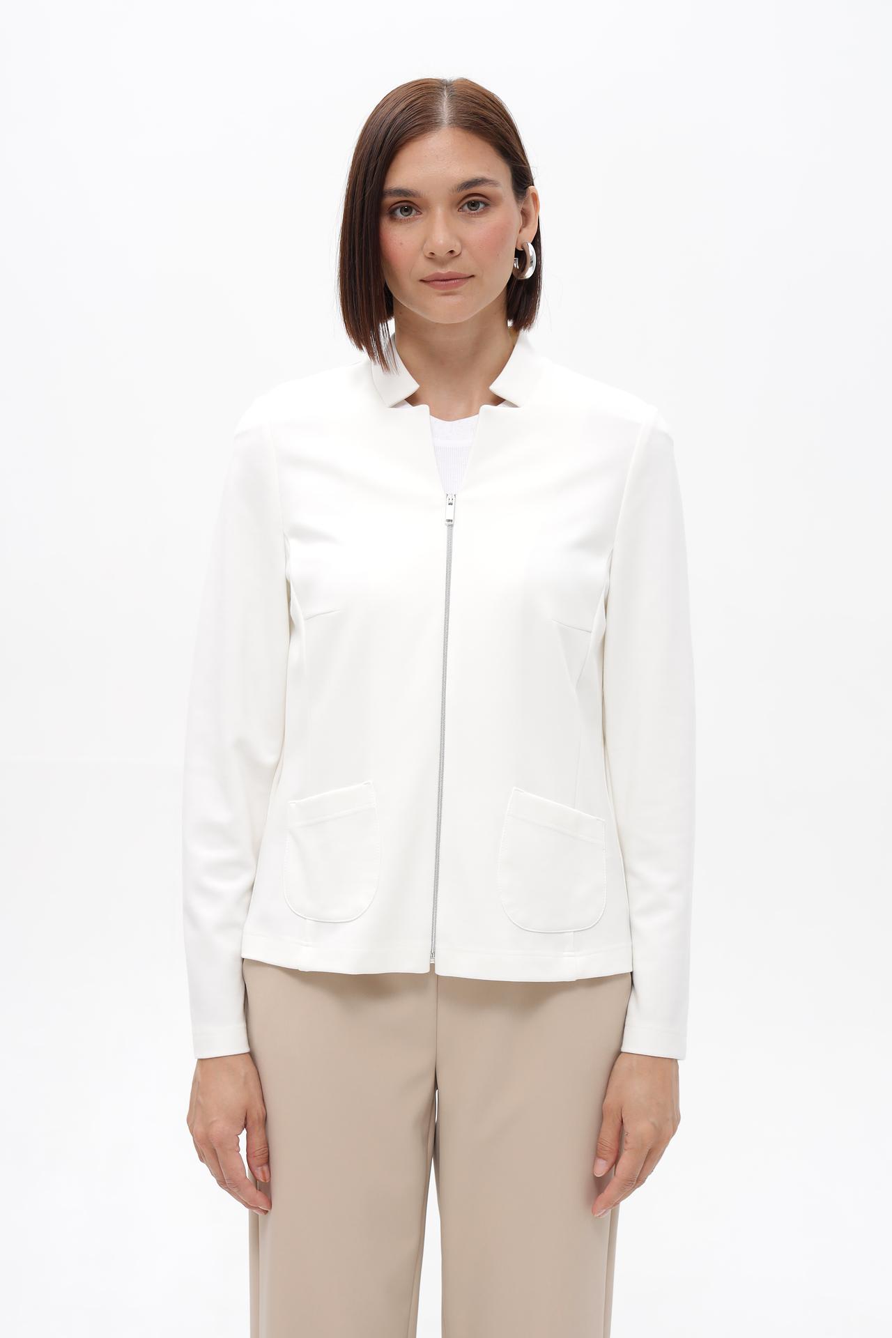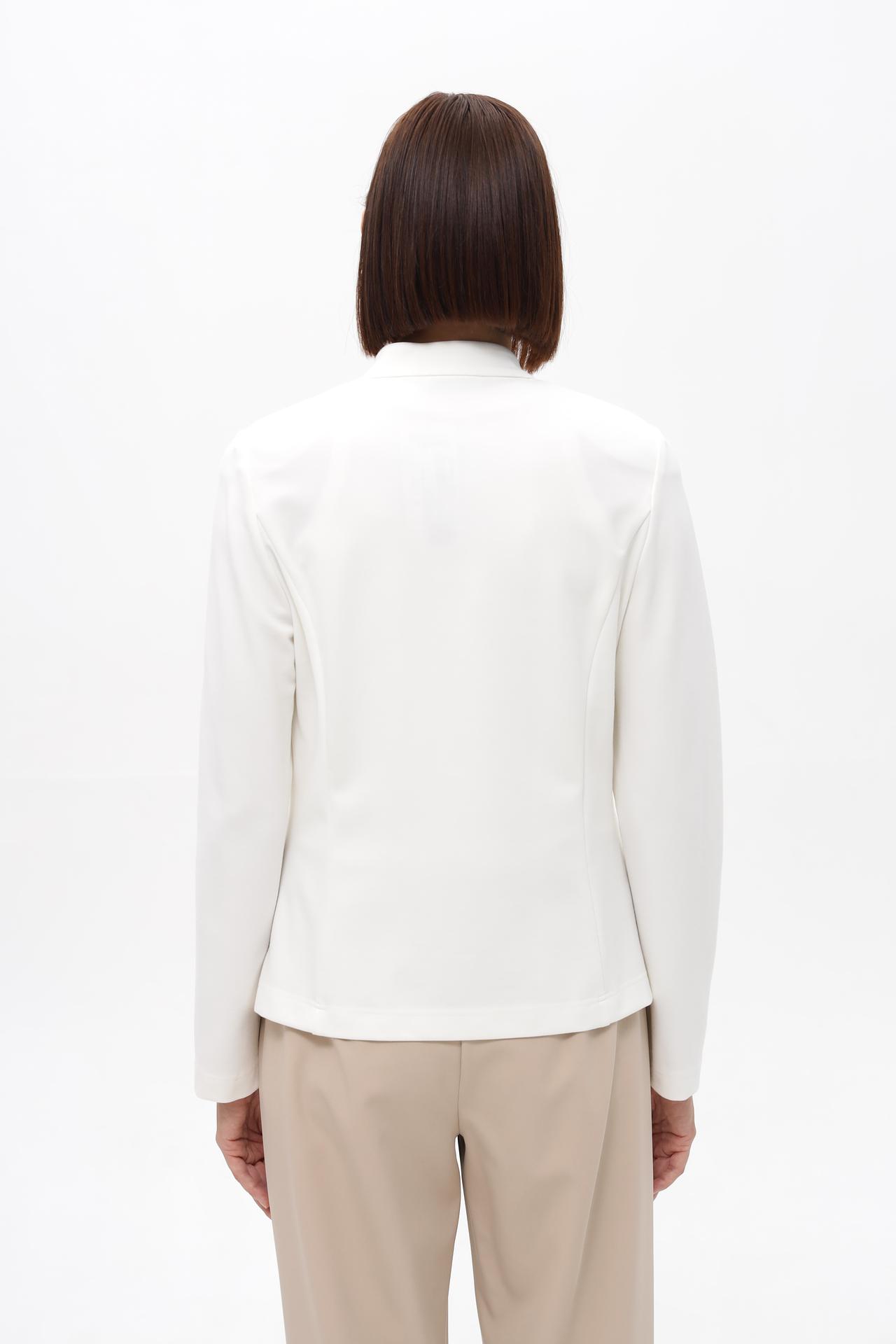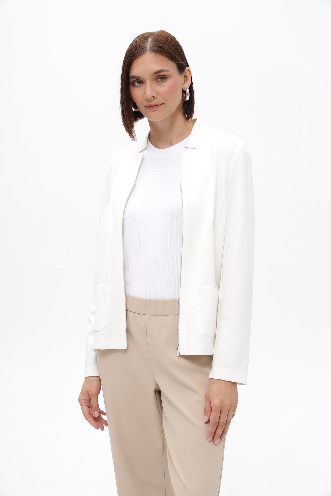 - Универсальность: Белый цвет жакета делает его универсальной базовой вещью, легко сочетающейся с брюками, юбками или платьями любых оттенков. Создавайте классические или более расслабленные ансамбли без усилий.