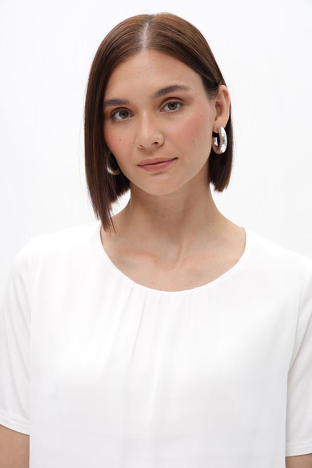 Блузка имеет короткие рукава и круглый вырез горловины. Свободный крой обеспечивает комфортную посадку по фигуре. Изготовлена из высококачественной вискозы с добавлением эластана, что делает ее приятной к телу и устойчивой к сминанию.