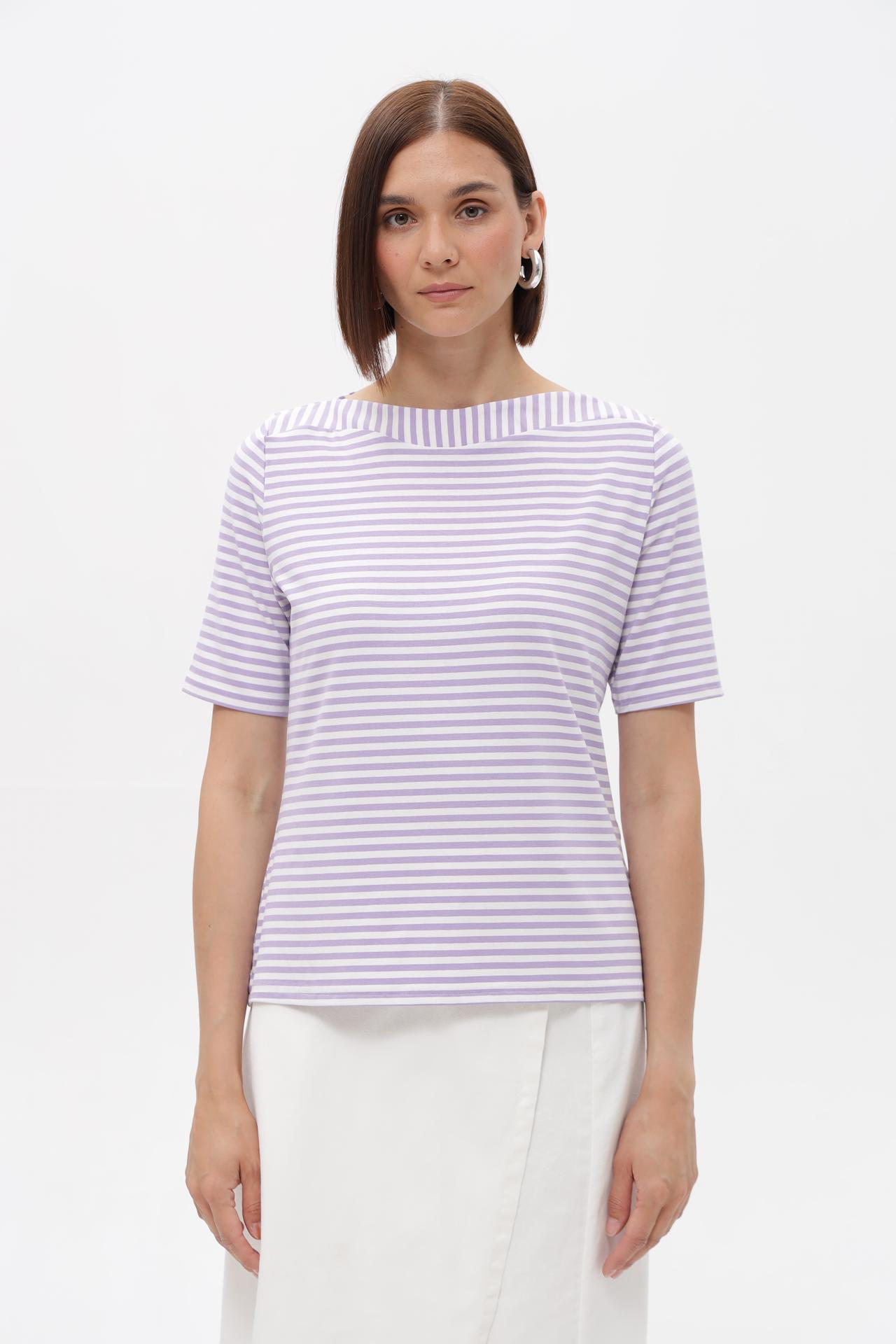 - Классический дизайн. Сиренево-белая полоска придает изделию свежий и актуальный вид, который никогда не выходит из моды. Вырез "лодочка" деликатно открывает ключицы, добавляя нотку изысканности.