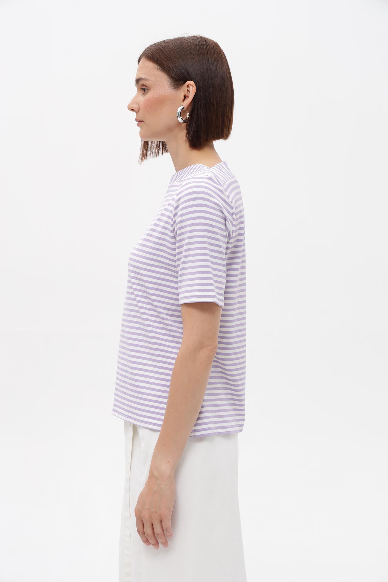 Футболка Frank Walder в сиреневую и белую полоску – идеальный выбор для вашего повседневного и элегантного гардероба. Эта модель женской футболки с классическим горизонтальным принтом и вырезом "лодочка" подчеркнет ваш утонченный стиль. Короткие рукава обеспечивают комфорт в теплую погоду, делая ее универсальной базой для летних и демисезонных образов.