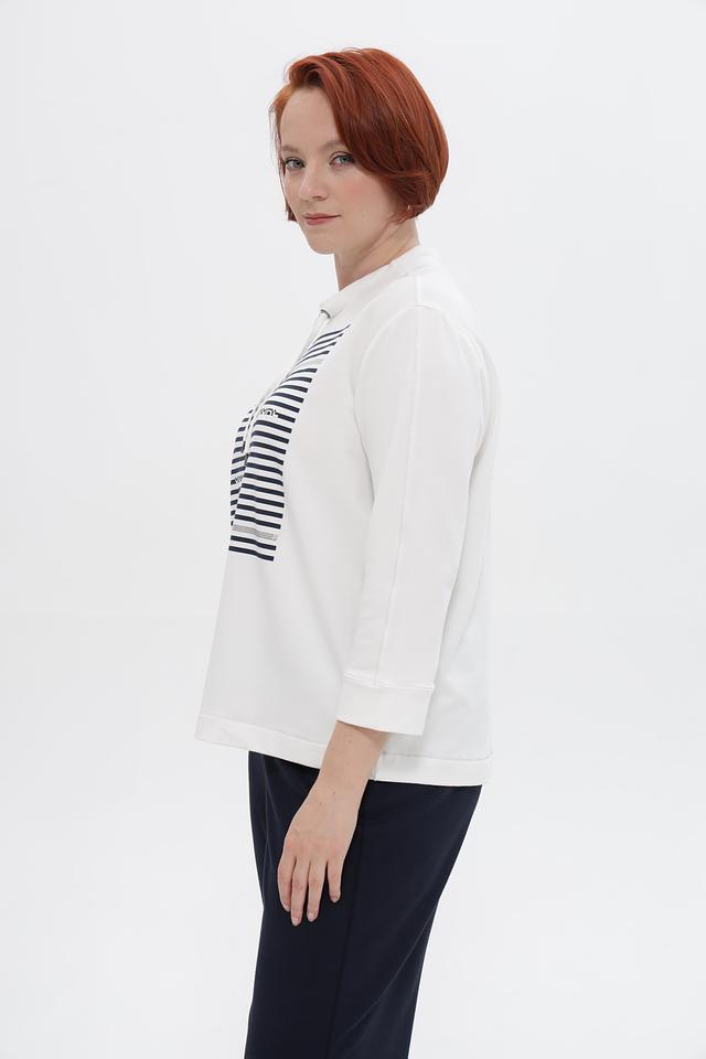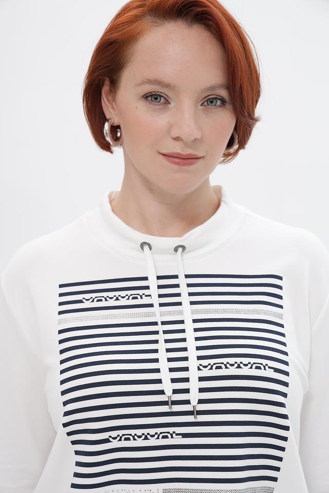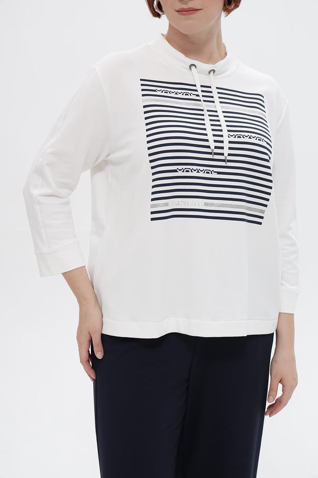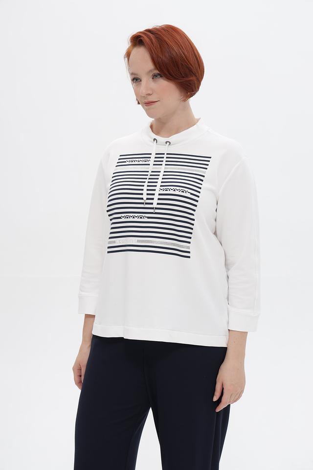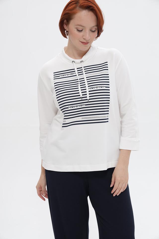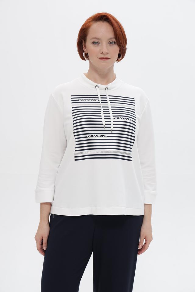 Женский пуловер от Frank Walder выполнен в белом цвете и украшен широкой полосой в сине-белую полоску на груди. Модель имеет свободный крой, что обеспечивает комфорт в носке.