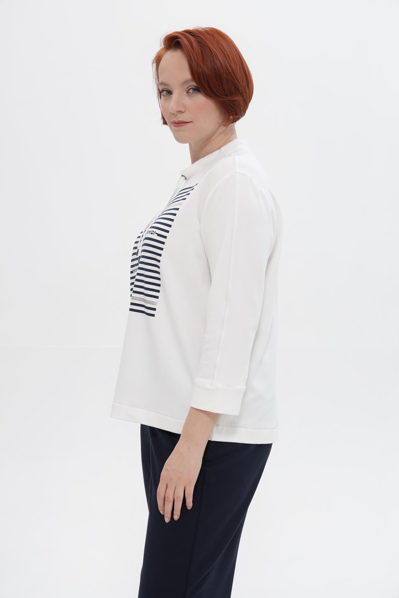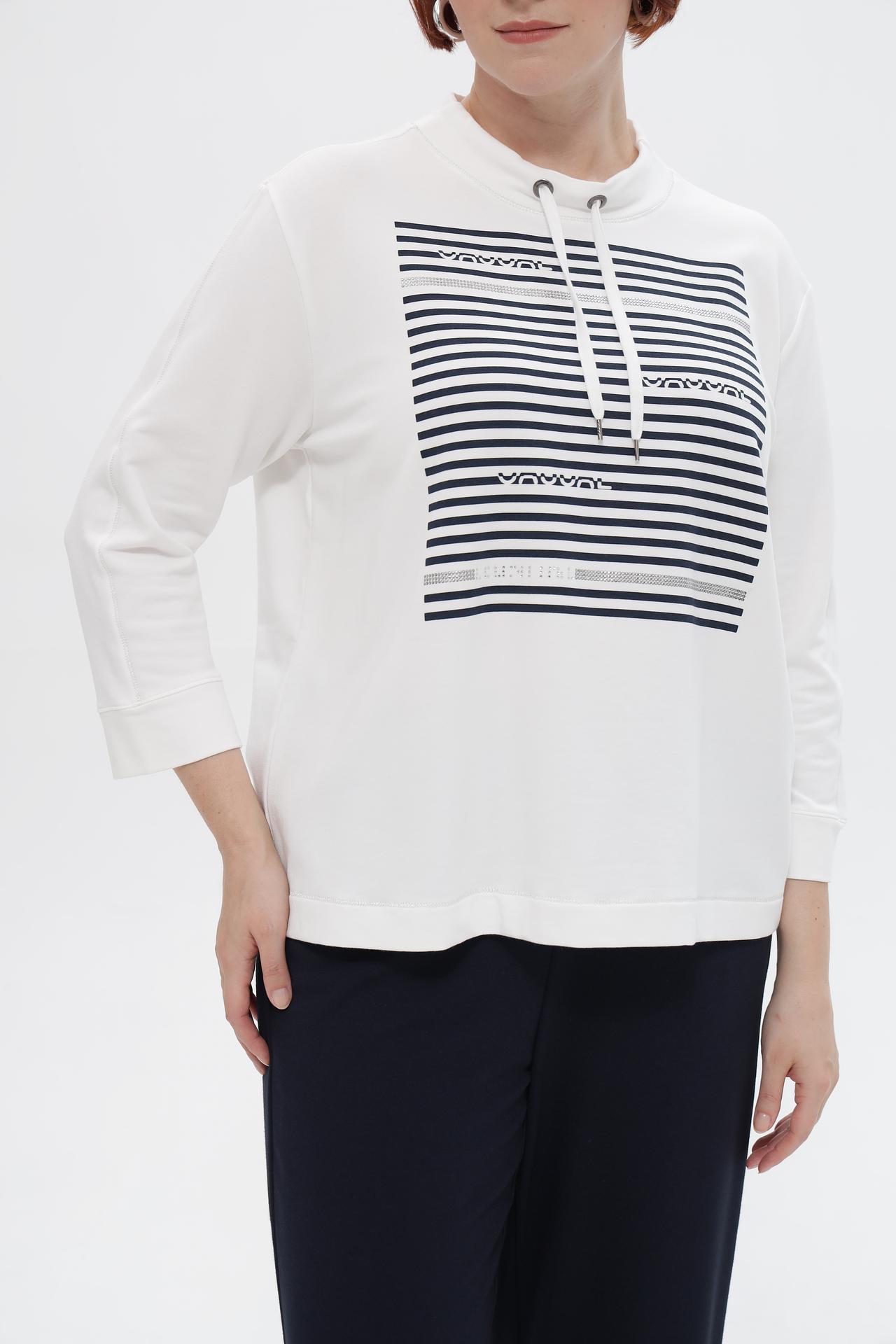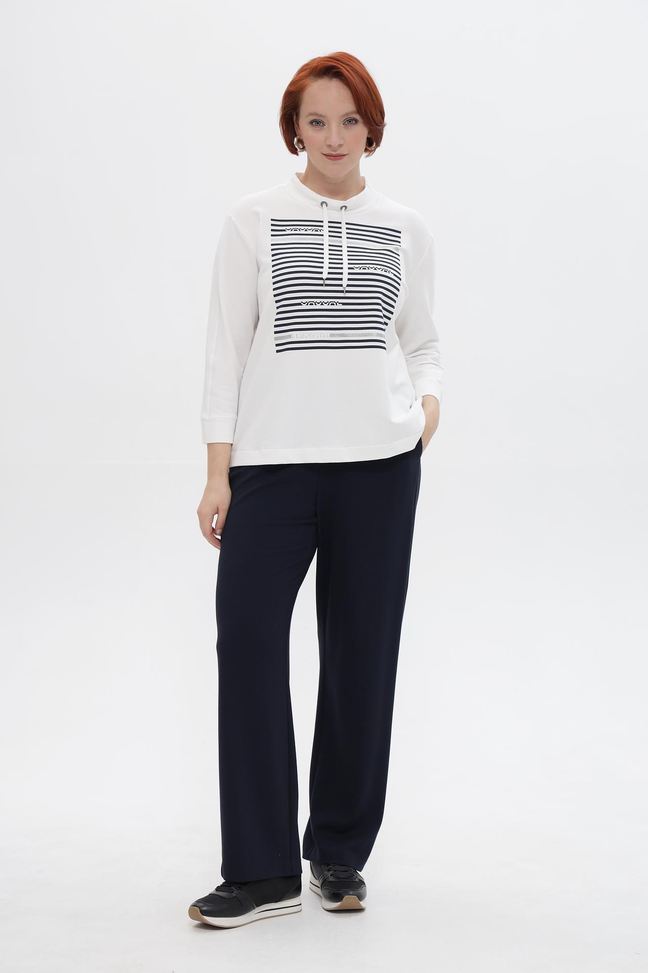 - Цвет: Классический белый цвет делает пуловер универсальным элементом, который легко сочетается с различными предметами гардероба. Принт в темно-синих и серых тонах добавляет контраста и динамики.
