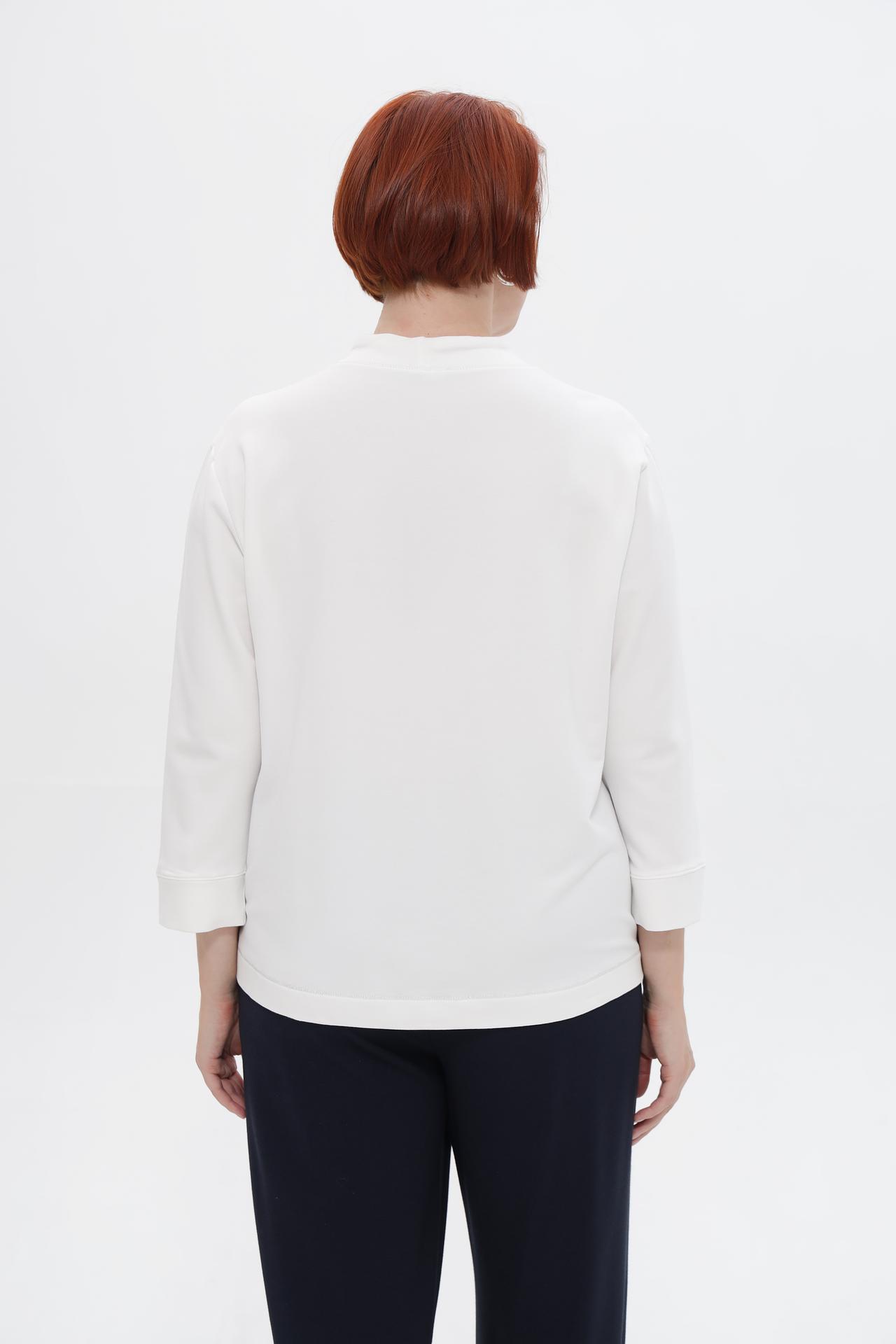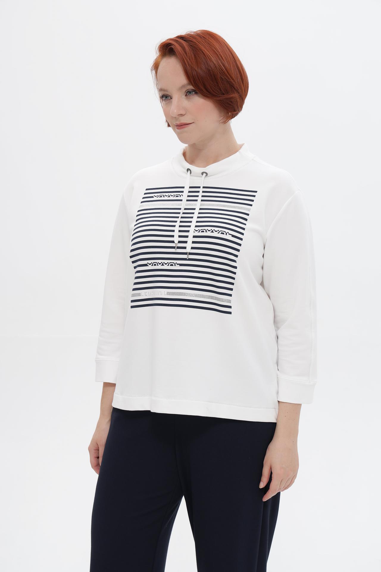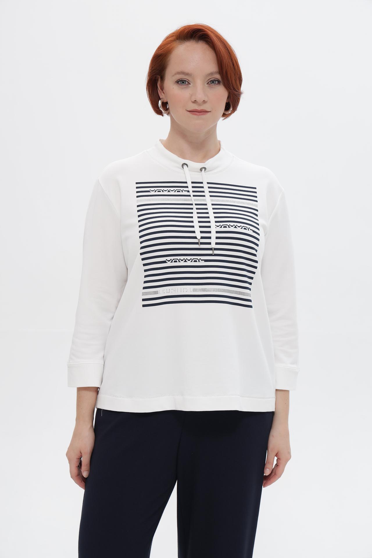 - Цвет: Классический белый цвет делает пуловер универсальным элементом, который легко сочетается с различными предметами гардероба. Принт в темно-синих и серых тонах добавляет контраста и динамики.