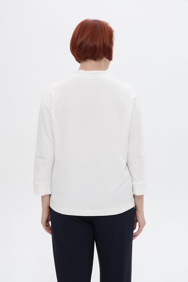 Состав ткани включает 47% хлопок, 47% модал и 6% эластан, что обеспечивает мягкость, приятные тактильные ощущения и хорошую посадку по фигуре. Пуловер легко стирается и не требует особого ухода.