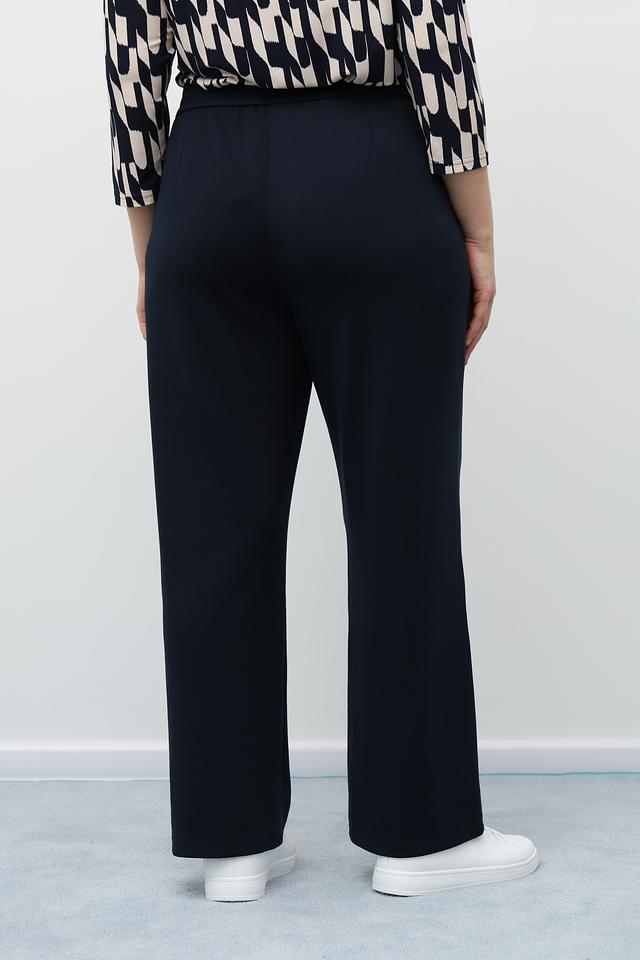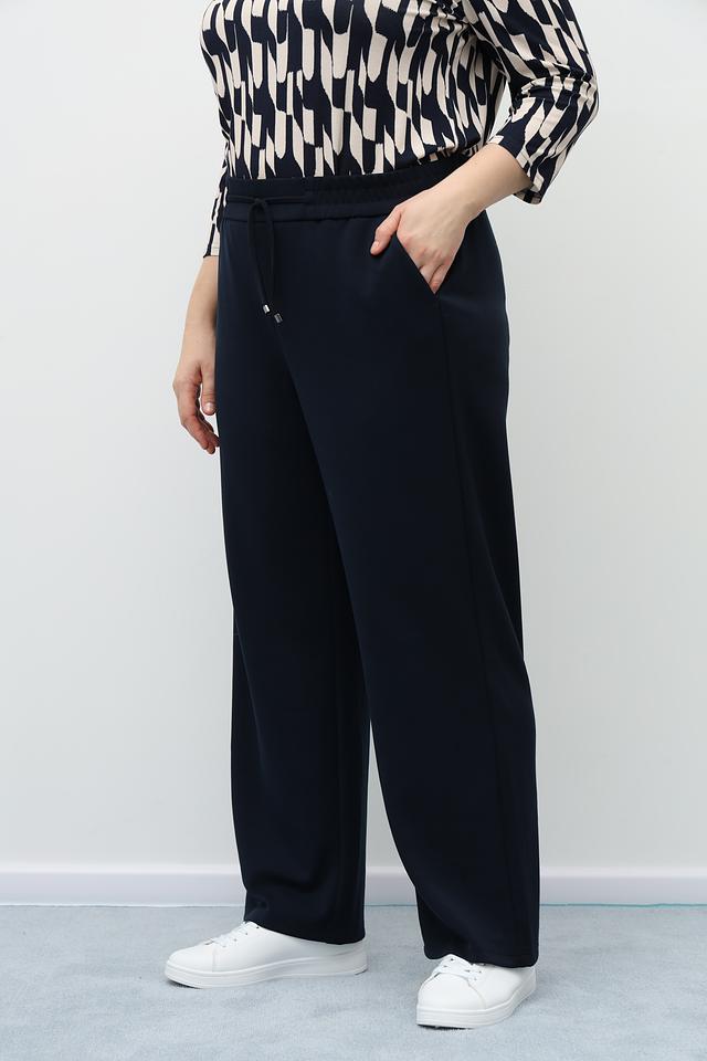 Брюки имеют прямой крой и широкую штанину, обеспечивающие свободу движений и комфорт в носке. Эластичный пояс дополнен шнурком для регулировки посадки. По бокам предусмотрены удобные карманы.