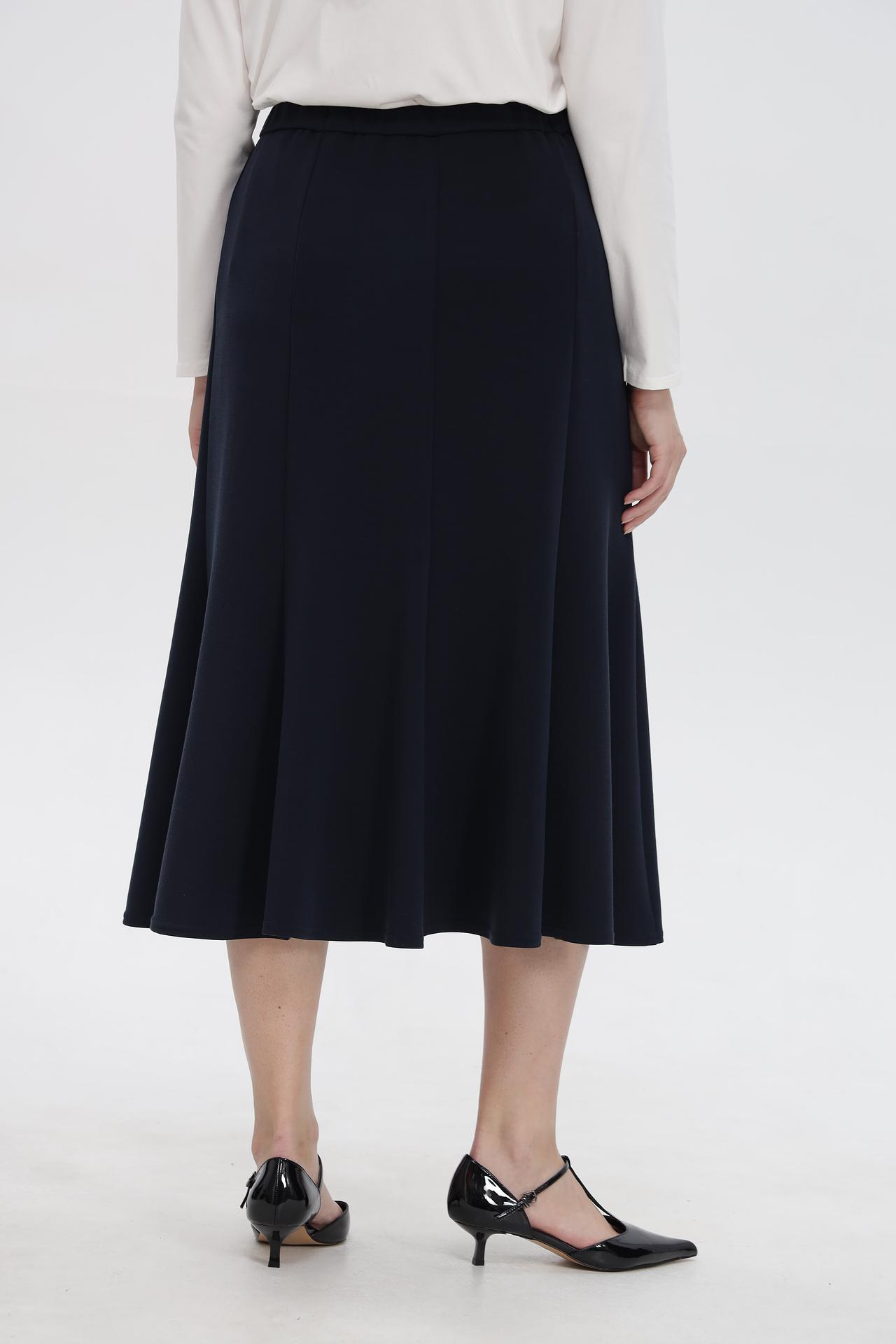 Лаконичный дизайн и универсальный темно-синий цвет позволяют сочетать ее с различными блузами, рубашками и жакетами, создавая как деловые, так и повседневные комплекты. Модель средней длины с расклешенным силуэтом визуально стройнит фигуру и обеспечивает комфорт в течение всего дня. Тщательно подобранный состав ткани гарантирует приятные тактильные ощущения и отличную посадку.