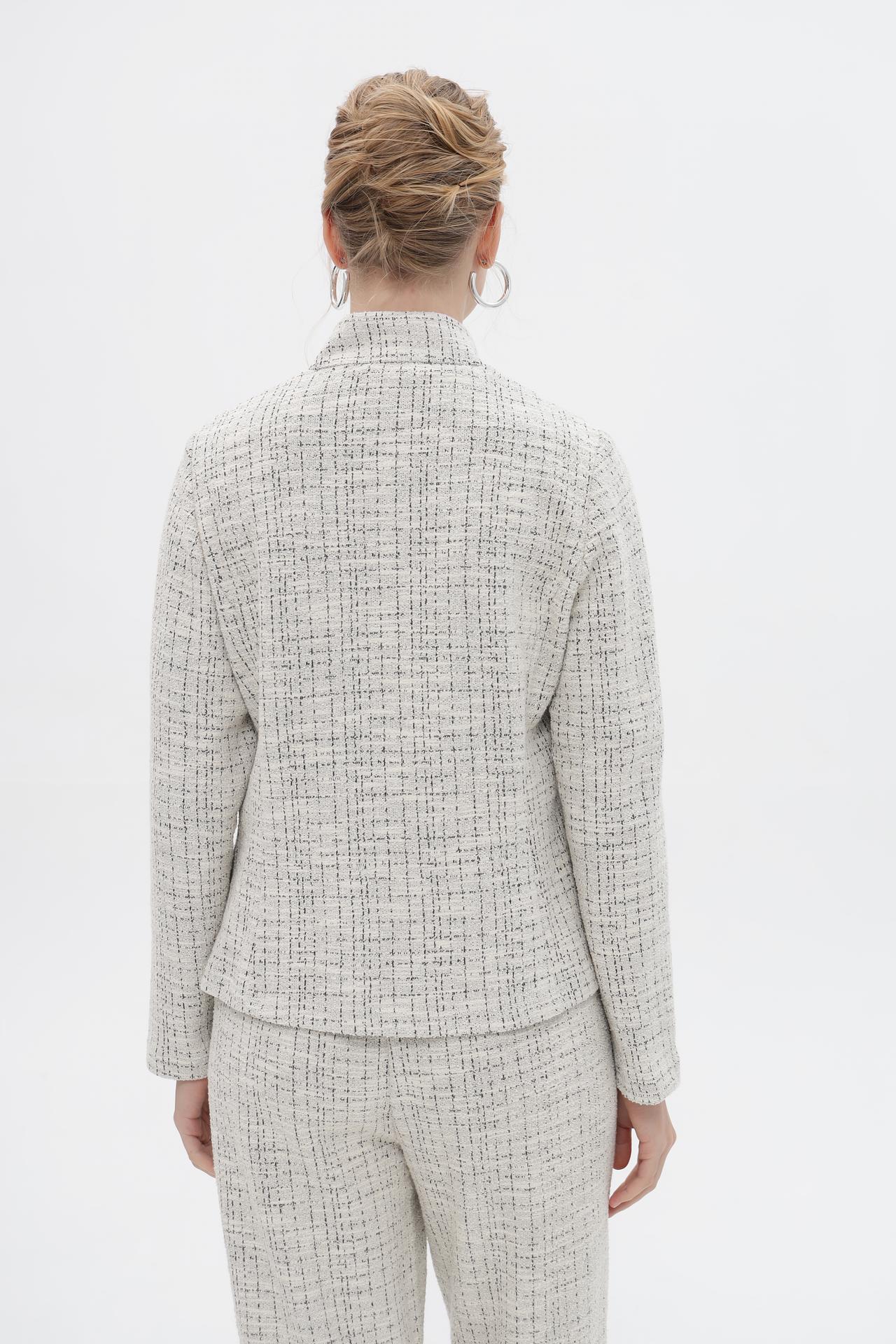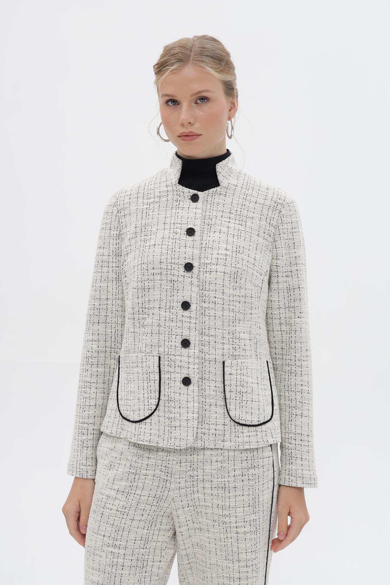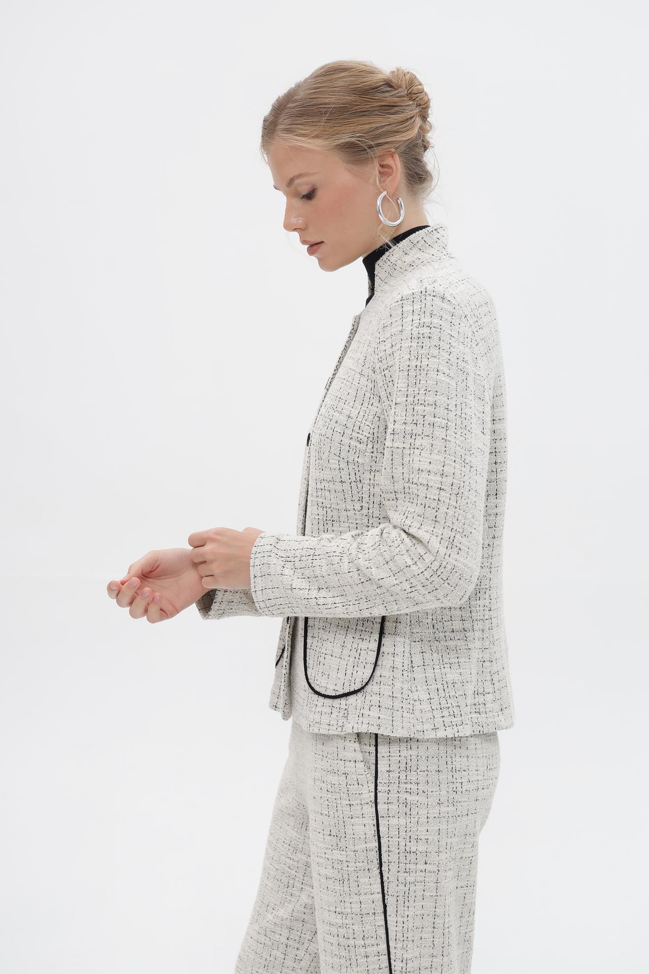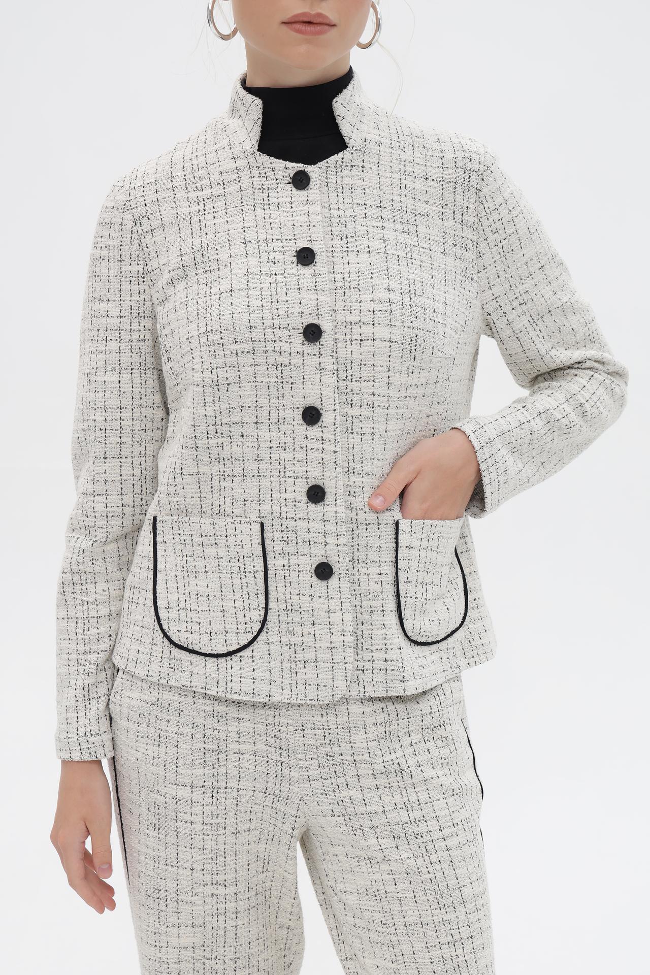 - Дизайн: Жакет выполнен в классическом стиле с круглым вырезом и застежкой на пуговицы. Акцентные накладные карманы с контрастной окантовкой добавляют изысканности.