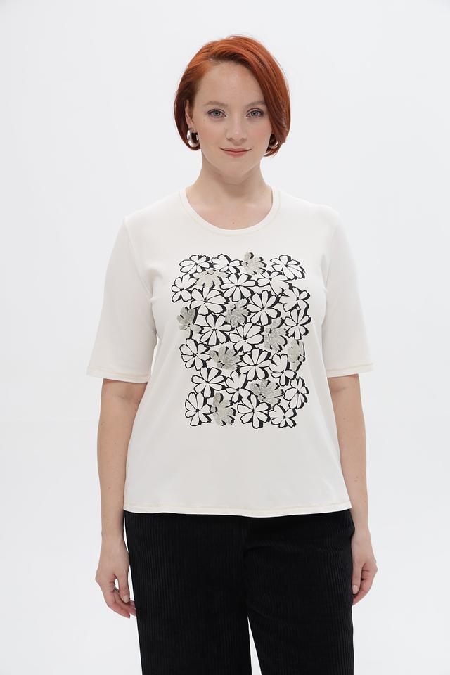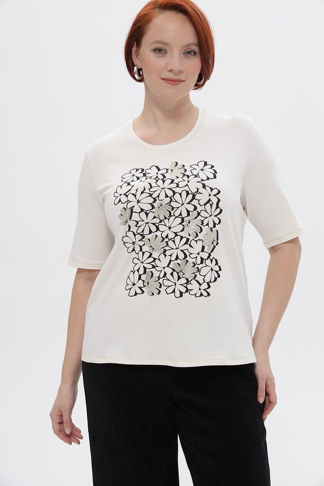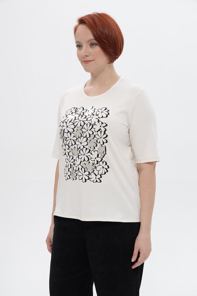 Женская футболка Frank Walder белого цвета с оригинальным цветочным принтом. Изготовлена из мягкого и приятного к телу материала на основе хлопка и модала. Состав: хлопок 45%, модал 45%, эластан 10%