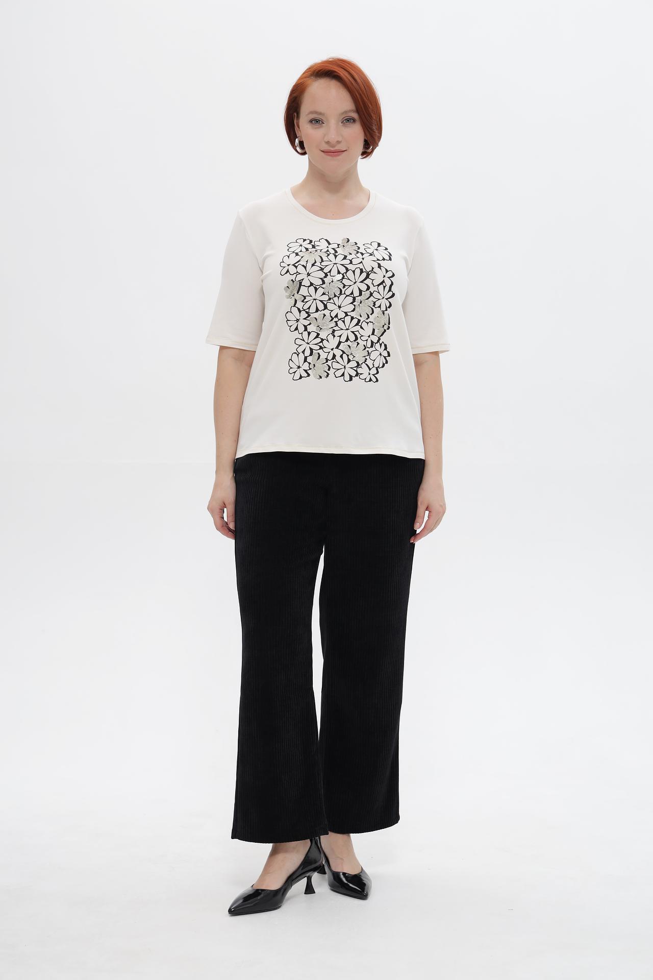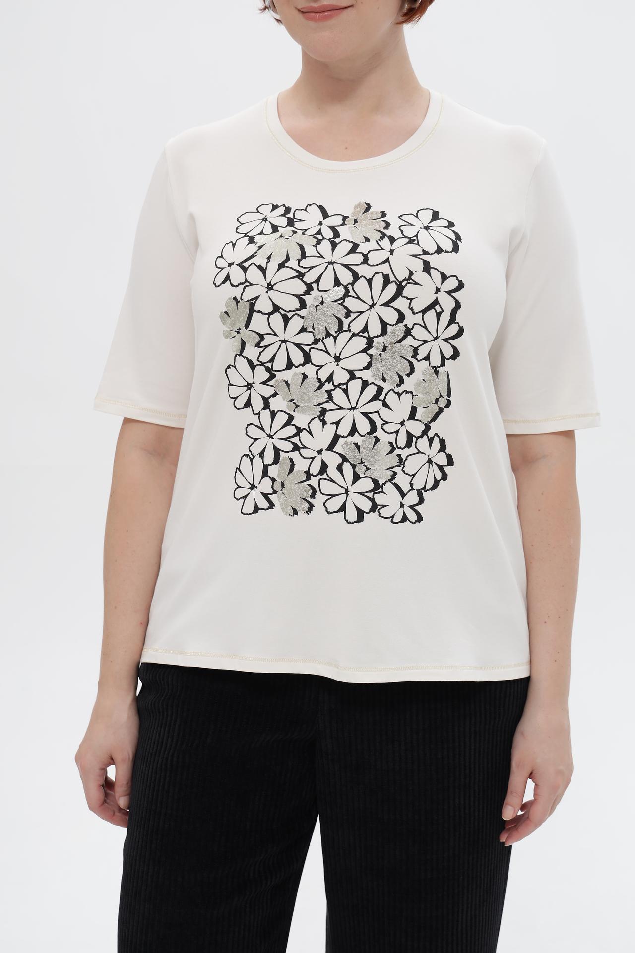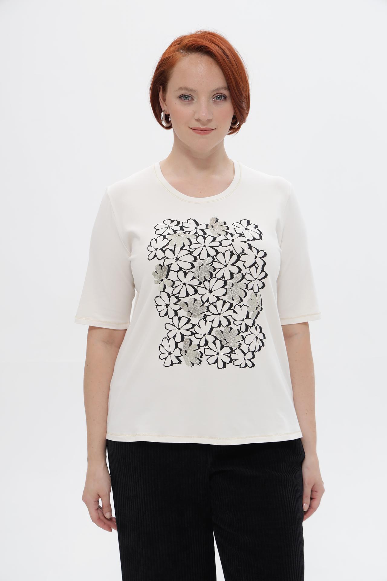 Модель украшена оригинальным принтом из цветов, выполненным в контрастных черно-белых тонах с добавлением мерцающих серебристых акцентов. Принт расположен в центре изделия, привлекая внимание и делая образ более женственным и изысканным. Классический круглый вырез горловины и короткие рукава-реглан создают лаконичный и стильный силуэт.