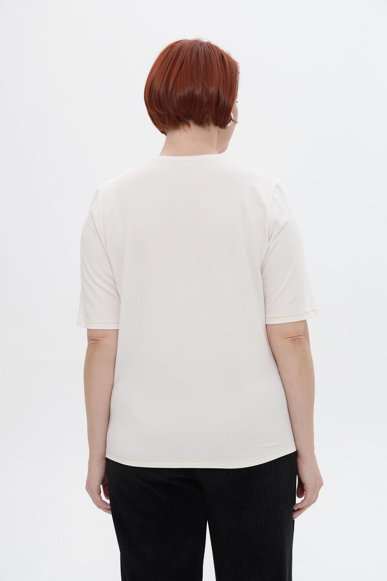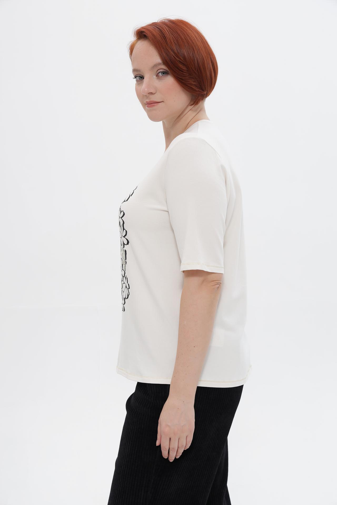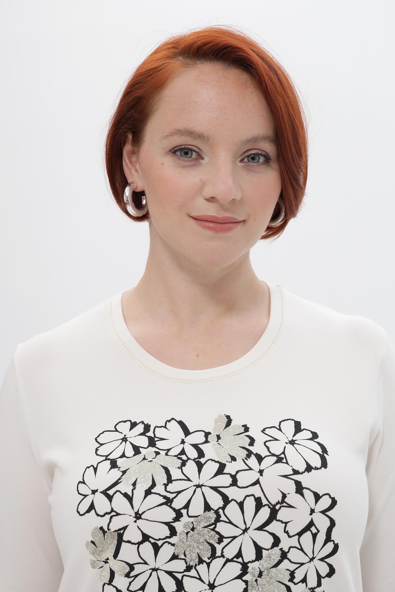 Модель украшена оригинальным принтом из цветов, выполненным в контрастных черно-белых тонах с добавлением мерцающих серебристых акцентов. Принт расположен в центре изделия, привлекая внимание и делая образ более женственным и изысканным. Классический круглый вырез горловины и короткие рукава-реглан создают лаконичный и стильный силуэт.