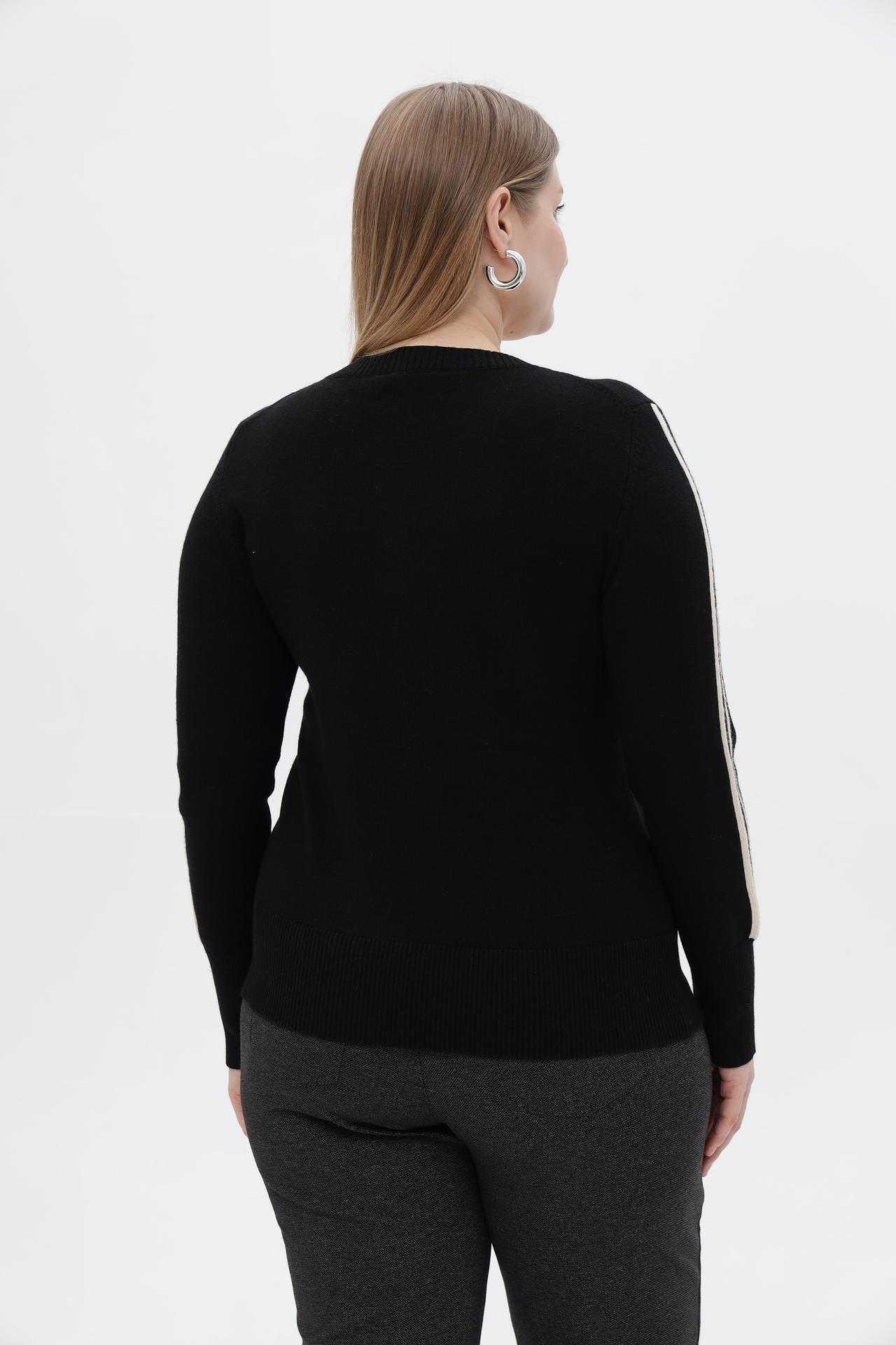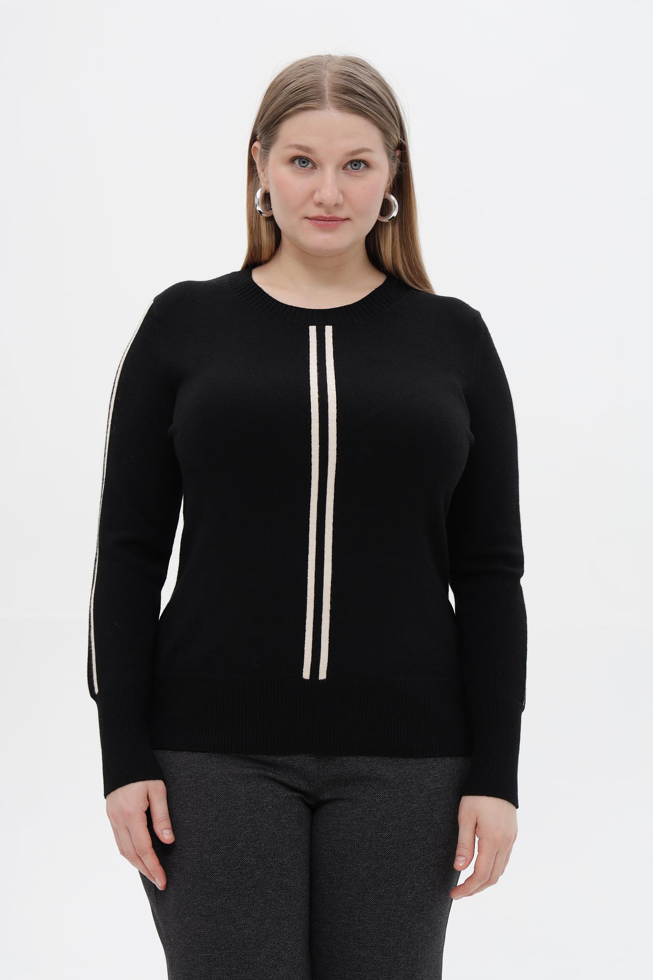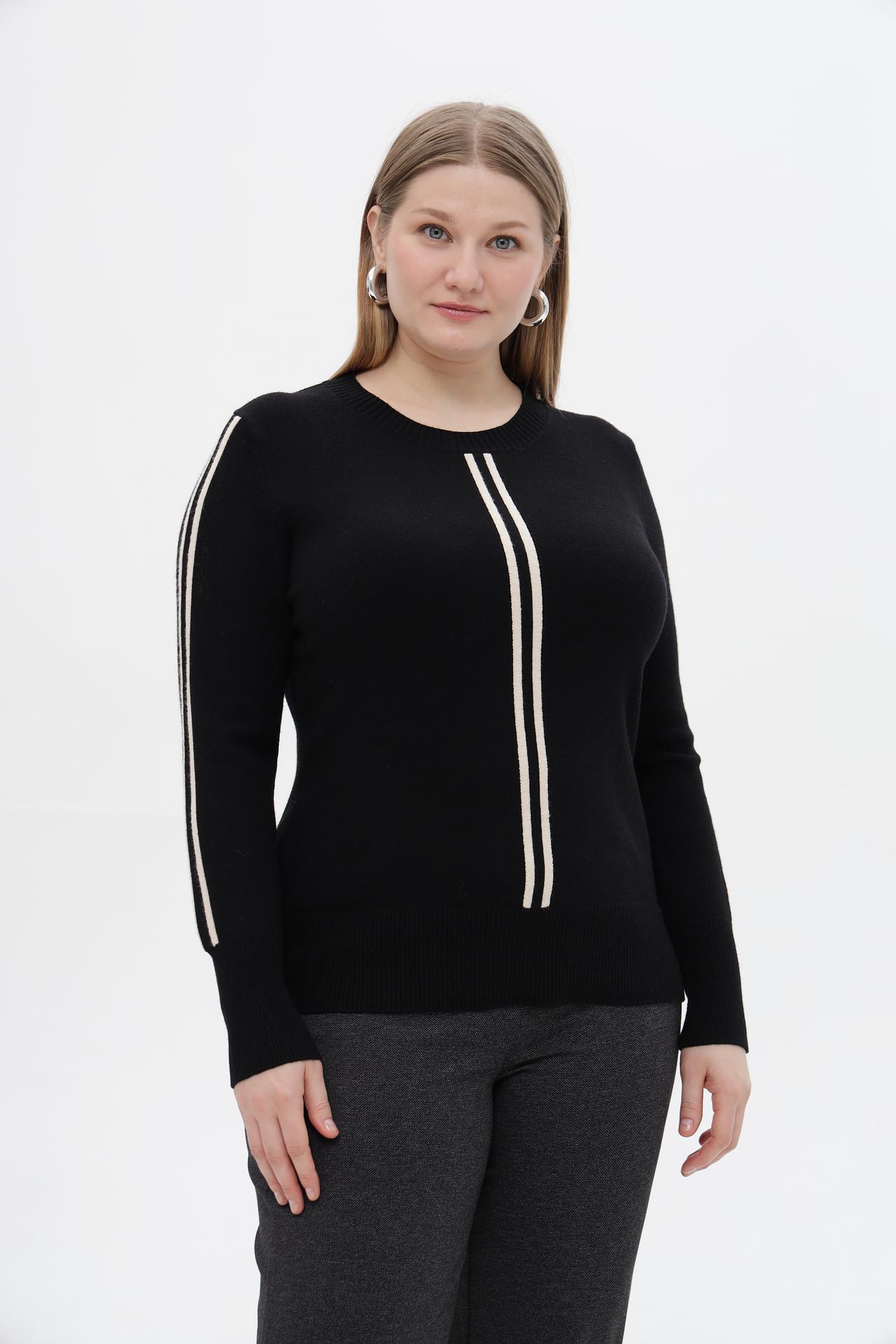 - Дизайн: Круглый вырез горловины и длинные рукава. Пуловер украшен вертикальными белыми полосами по центру груди и лампасами на рукавах, создавая динамичный и модный силуэт.