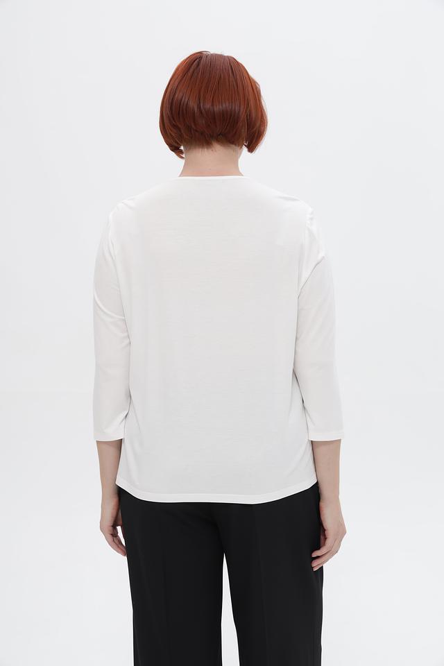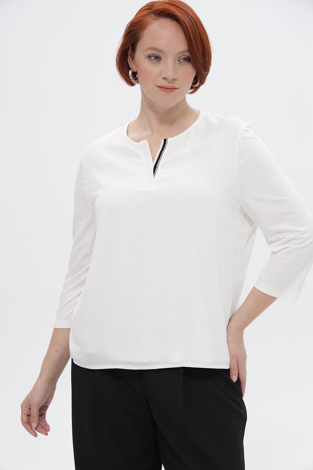 Блузка имеет V-образный вырез горловины, украшенный черной тесьмой, которая добавляет изделию изысканности и оригинальности. Рукава длиной 3/4 делают ее универсальной для любого времени года.