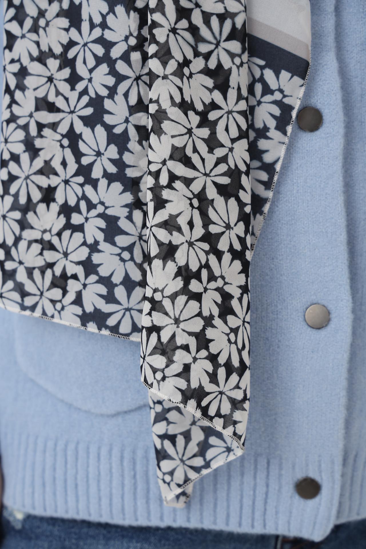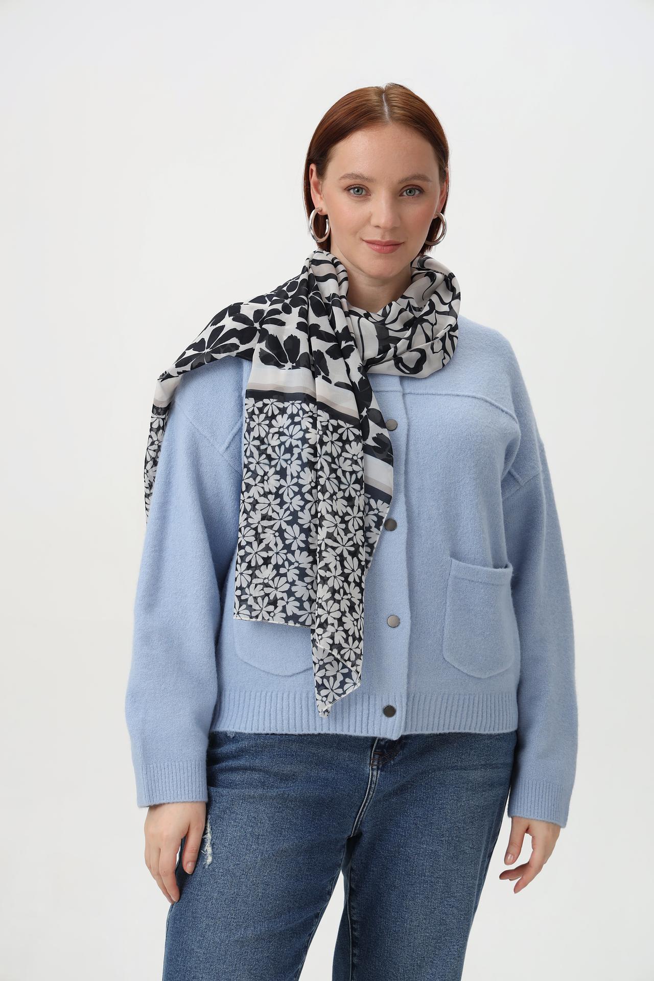 - Дизайн: Оригинальный принт с крупными и мелкими цветами в контрастной черно-белой гамме создает выразительный визуальный акцент. Комбинация различных узоров по всей длине шарфа придает ему динамичность и завершенность.