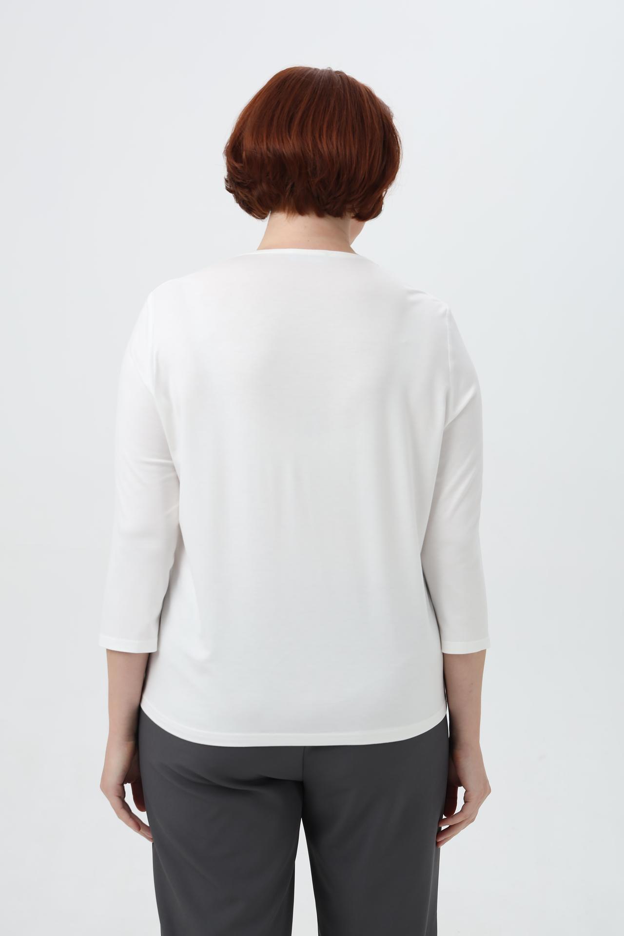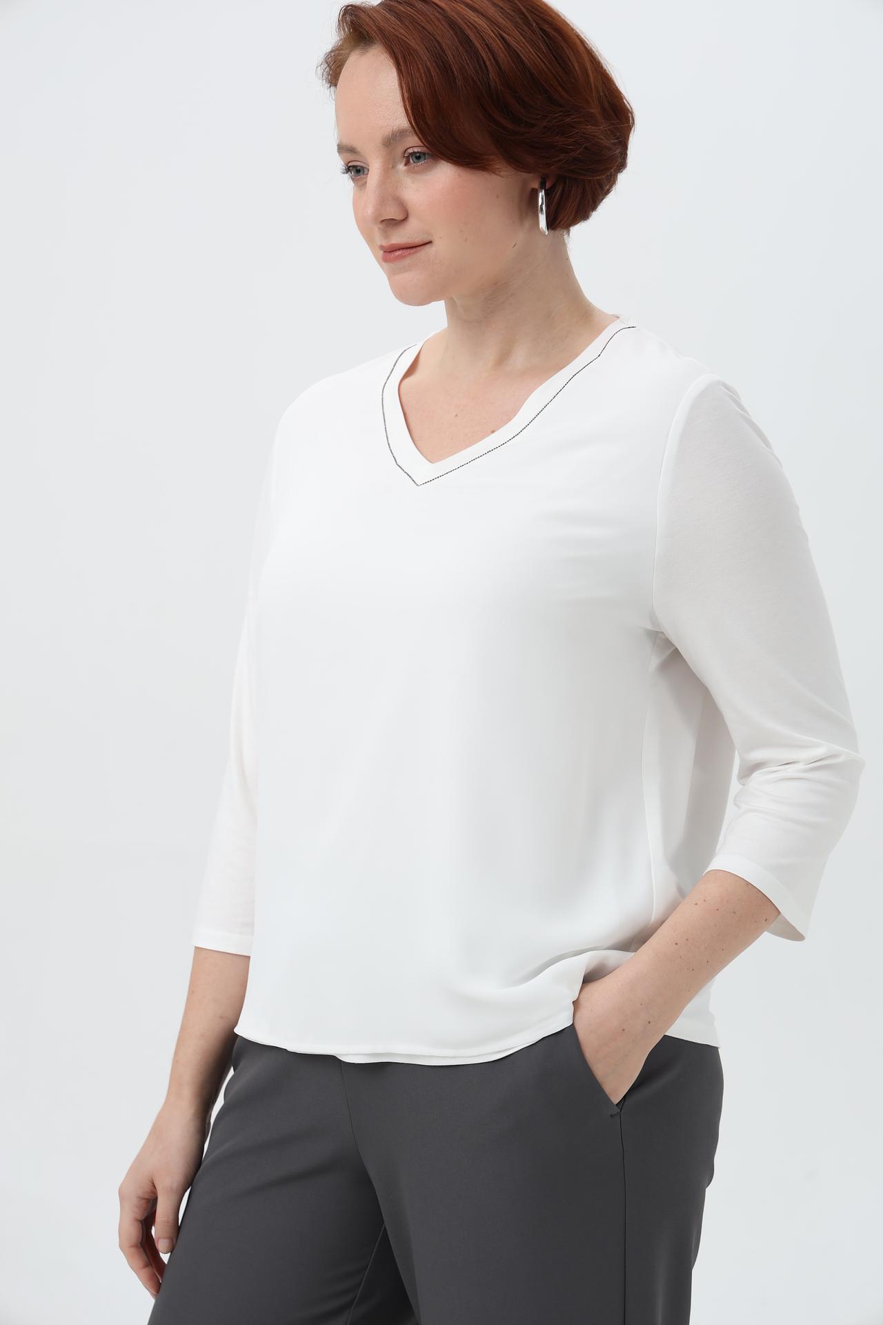 - Дизайн: V-образный вырез горловины, отделанный тонкой декоративной строчкой, придает блузе изысканность. Рукав ¾ добавляет образу легкости и непринужденности.
