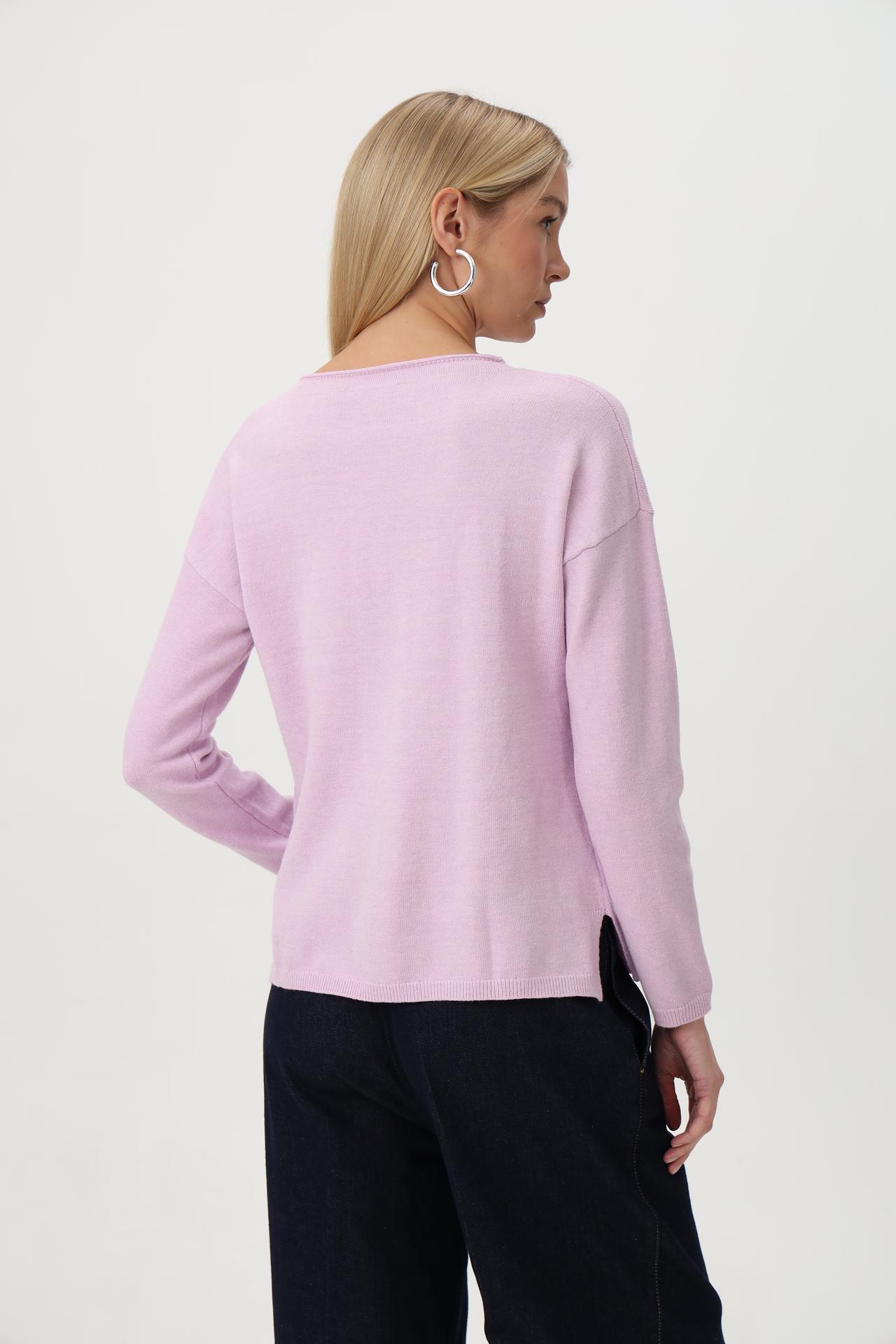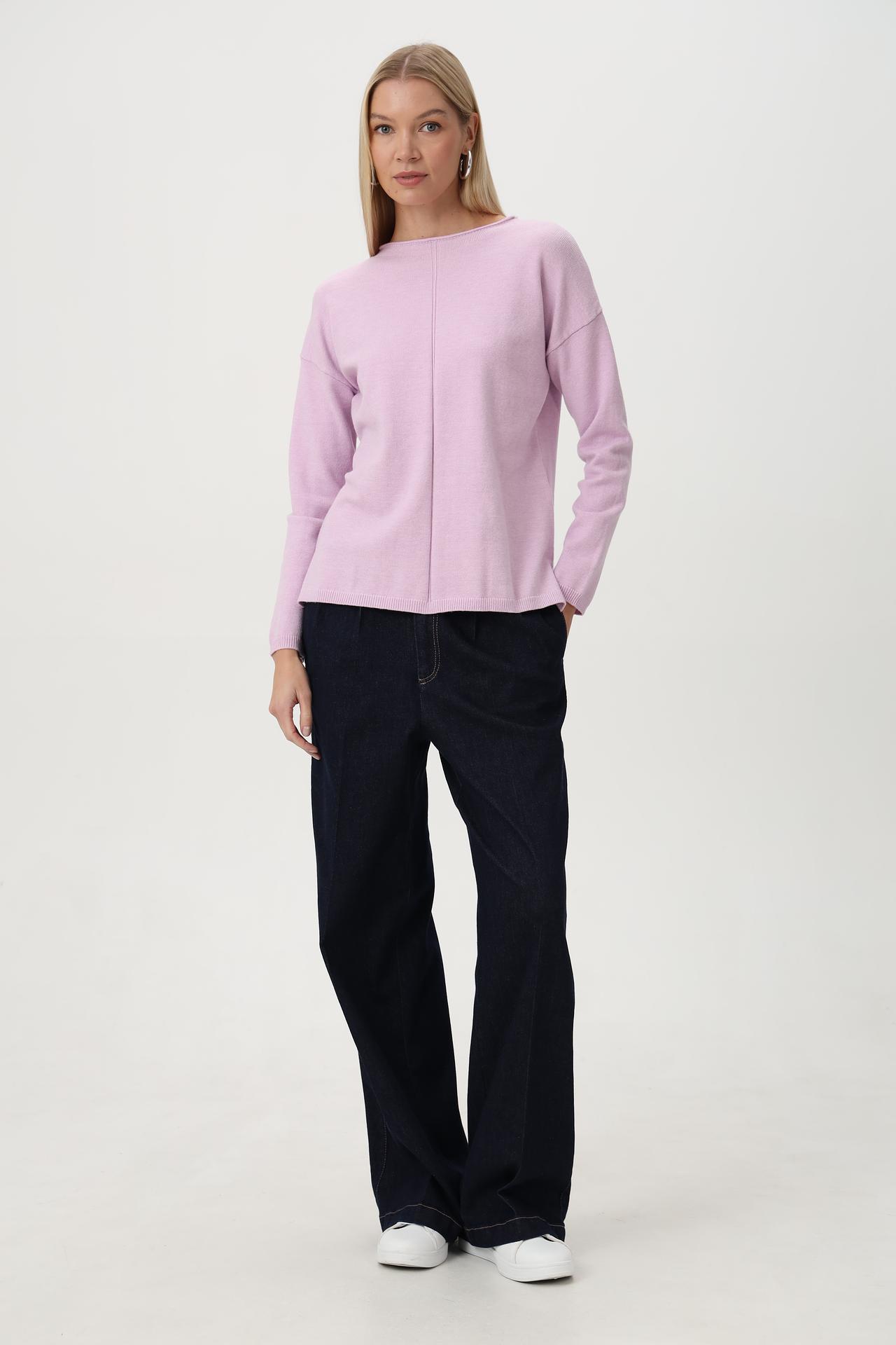 Пуловер имеет классический прямой крой, дополненный аккуратным швом по центру переда, что придает ему изысканный вид. Длинные рукава и округлый вырез горловины делают эту модель универсальной для любого случая.