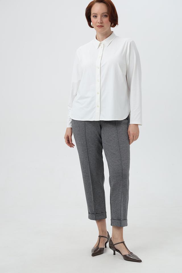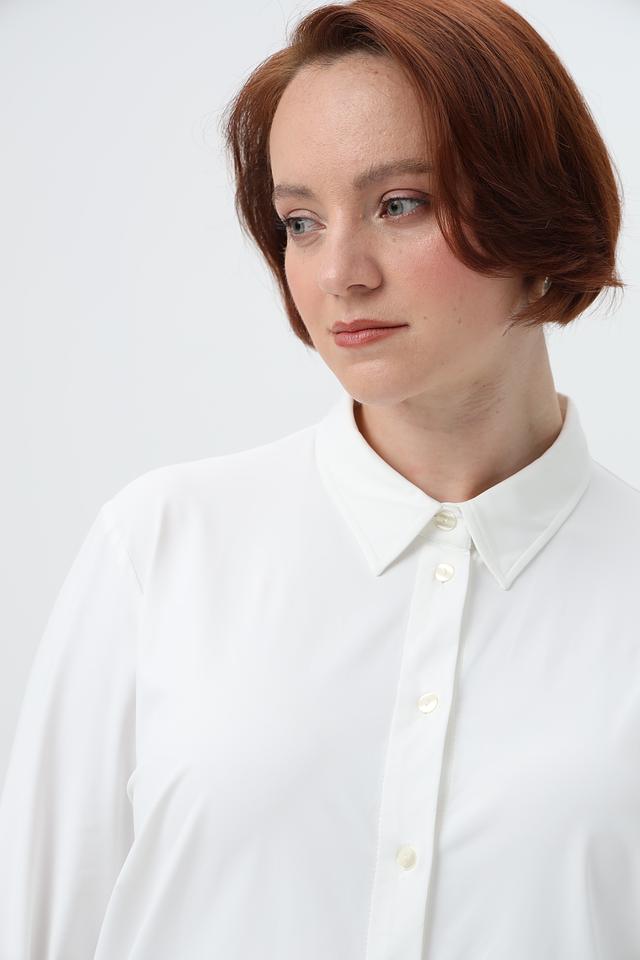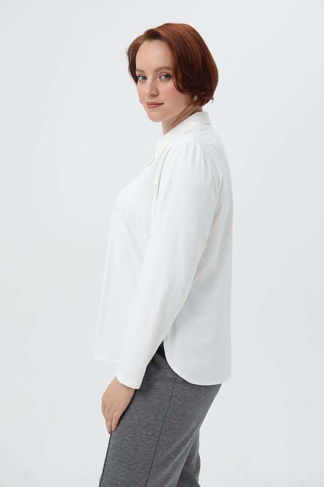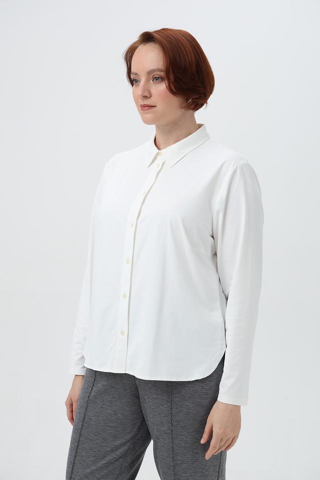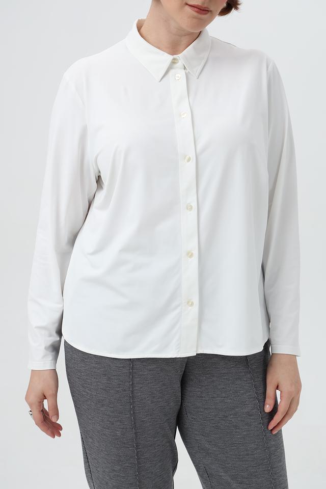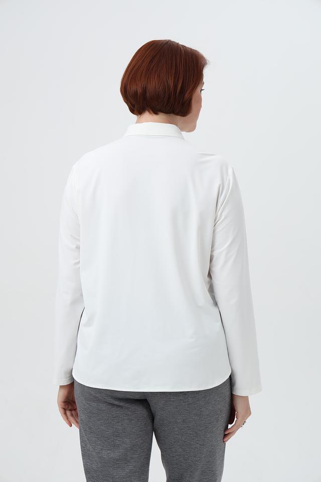 Модель имеет прямой крой, который обеспечивает комфортную посадку по фигуре. Воротник рубашечного типа придает блузке деловой вид. Застежка на пуговицы по всей длине.