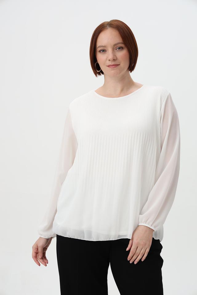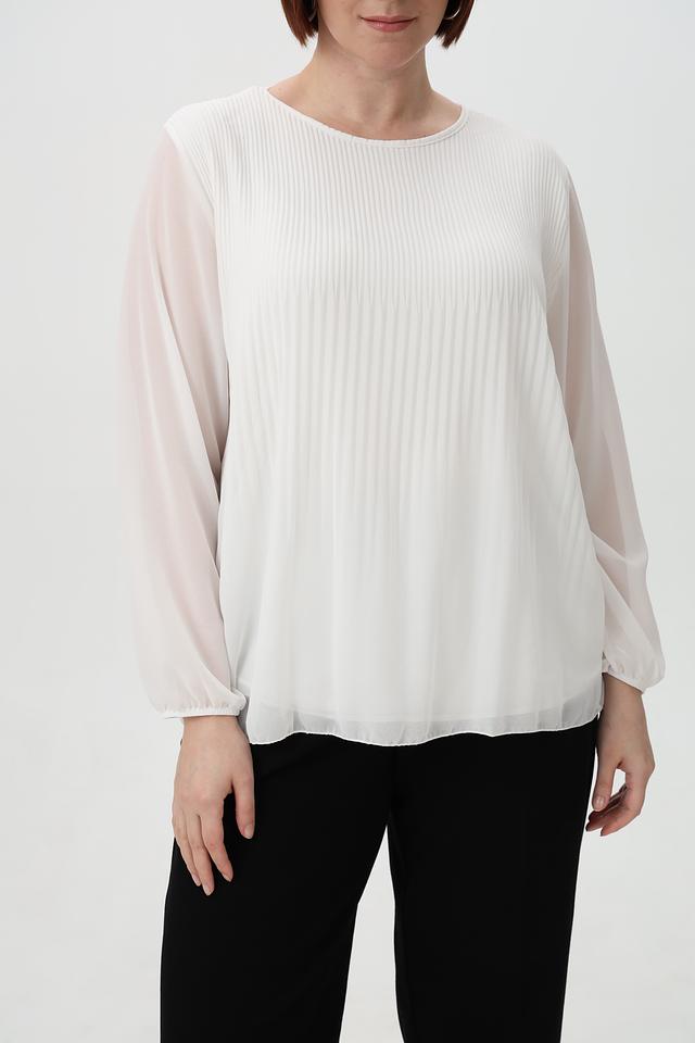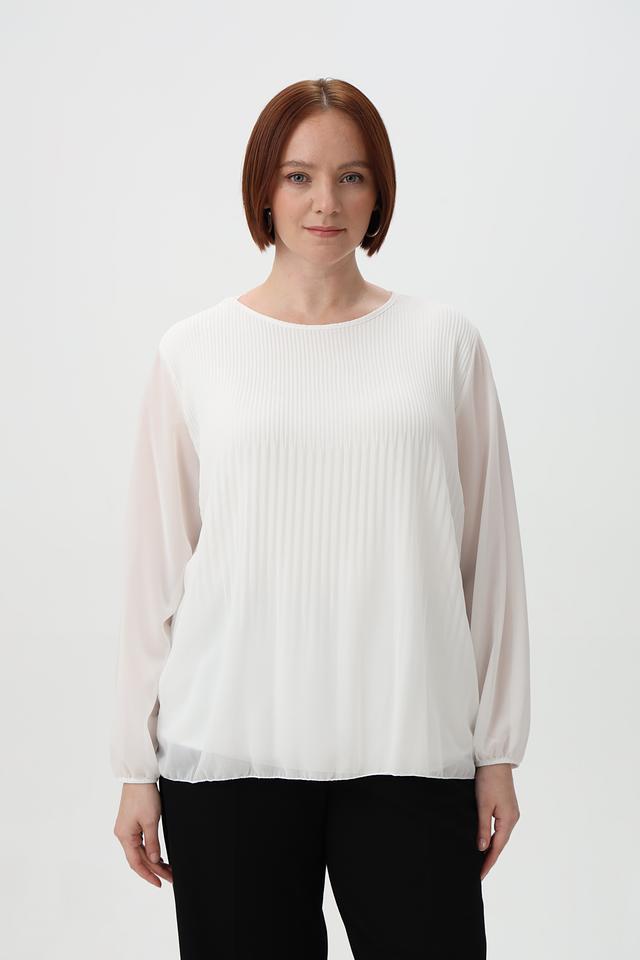 Модель отличается плиссированным передним полотном, которое придает ей элегантный и женственный вид. Рукава блузки длинные, слегка расклешенные к запястью, выполнены из полупрозрачной ткани.