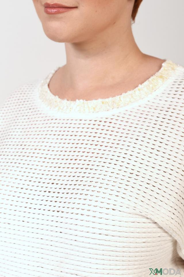 Особенностью данной модели является ажурная текстура, которая придает ей легкость и воздушность. Короткие рукава и округлый вырез горловины делают блузу идеальной для теплой погоды. Отделка горловины выполнена в виде небольшого кружева, добавляющего изящества.