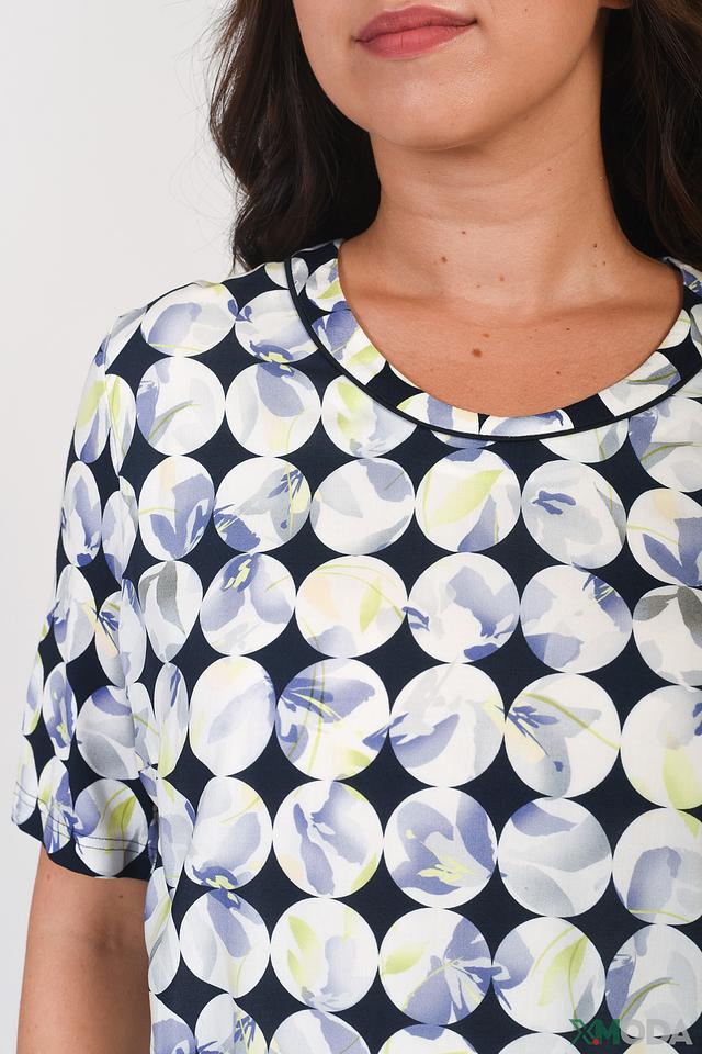 Особенностью данной модели является яркий и оригинальный цветочный принт, выполненный в синих, белых и желтых тонах. Круглый вырез горловины и короткие рукава делают блузу идеальным выбором для теплого времени года.