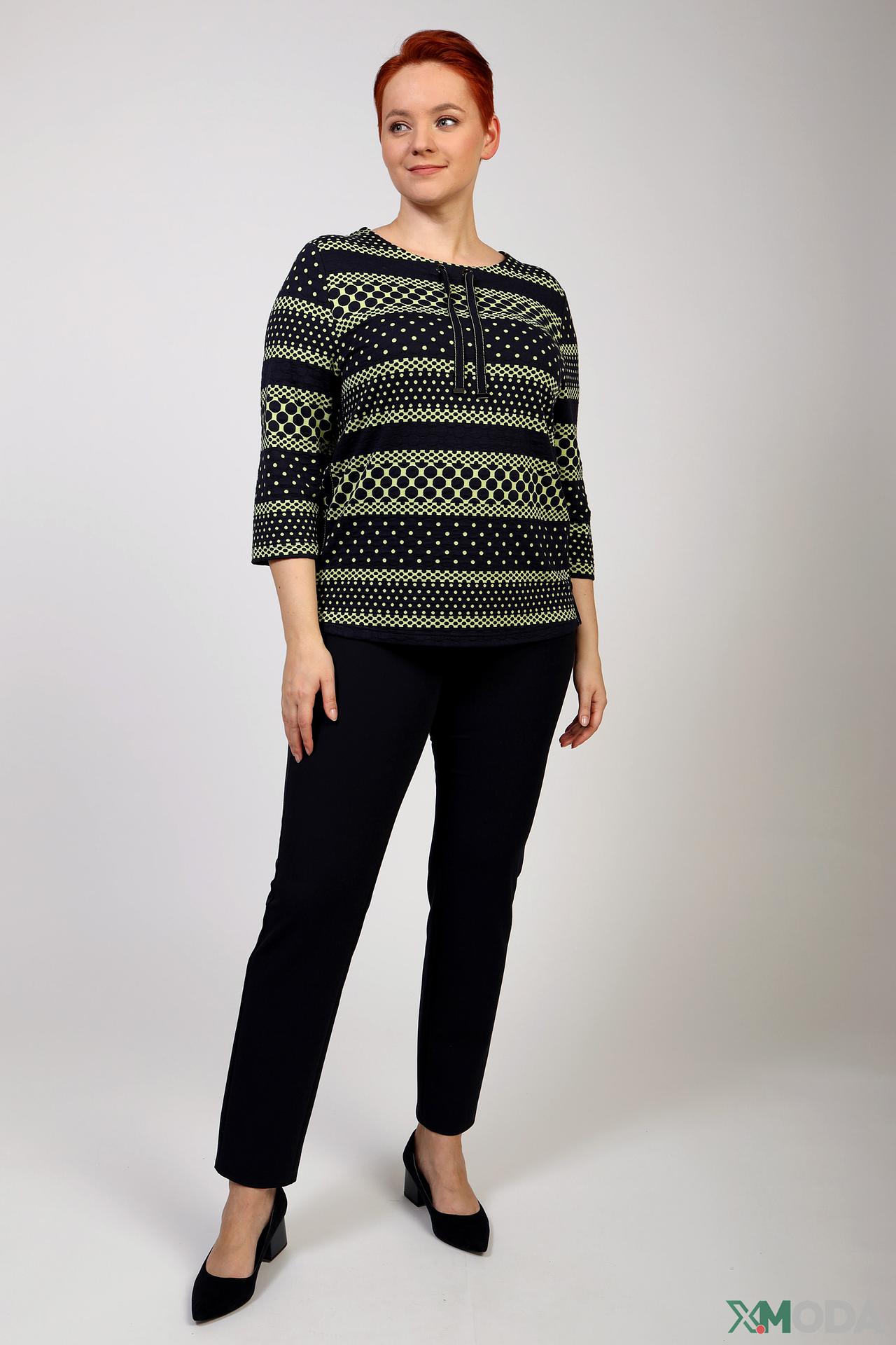 Пуловер выполнен в темно-синем цвете с оригинальным принтом из горизонтальных полос с разным геометрическим узором: горошек, мелкие квадраты и рельефная текстура. Рукав ¾ и округлый вырез горловины с декоративной шнуровкой добавляют образу женственности и комфорта. Этот пуловер прекрасно сочетается с брюками и юбками, создавая элегантные и современные образы.