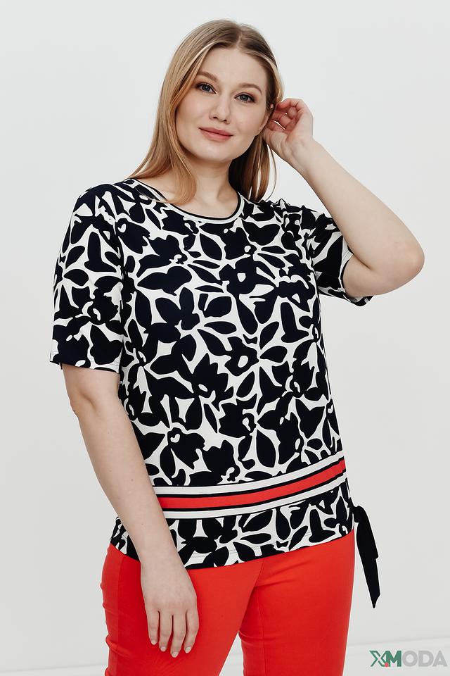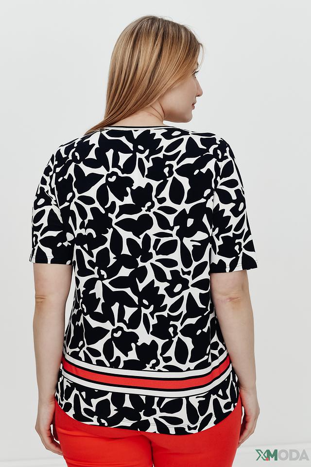 Блуза имеет оригинальный принт в виде абстрактных цветов чёрного цвета на белом фоне. Нижняя часть блузы украшена широкой красной полосой, которая добавляет образу яркости и динамики.