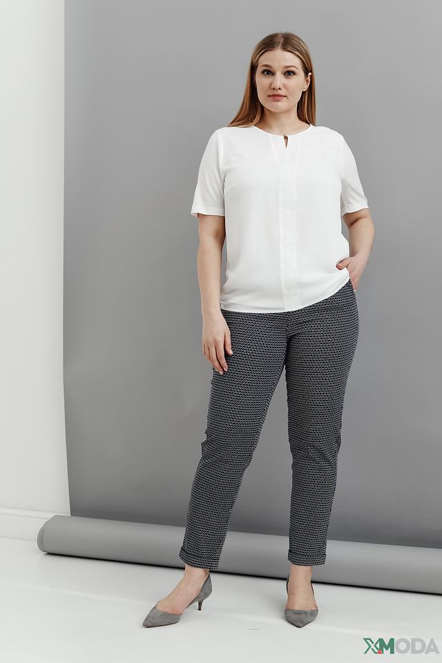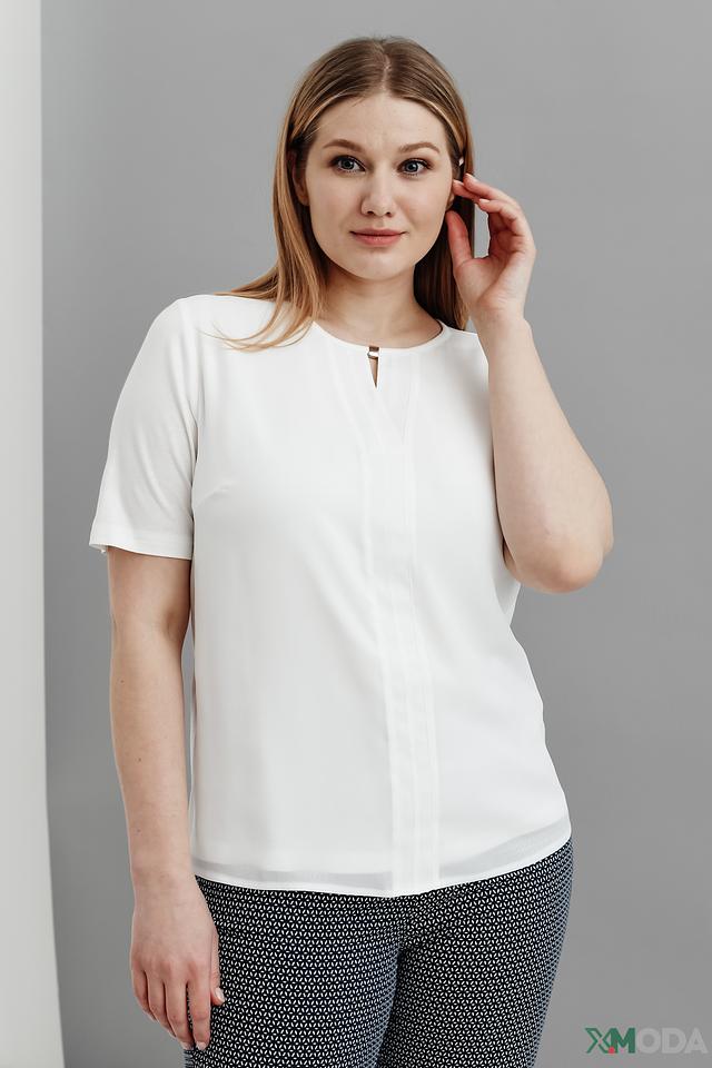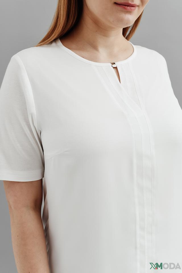 Модель имеет прямой крой, короткие рукава и V-образный вырез с небольшой декоративной вставкой. Блуза выполнена из высококачественной вискозы с добавлением эластана (93% вискоза, 7% эластан), что обеспечивает мягкость, комфорт и хорошую посадку по фигуре.