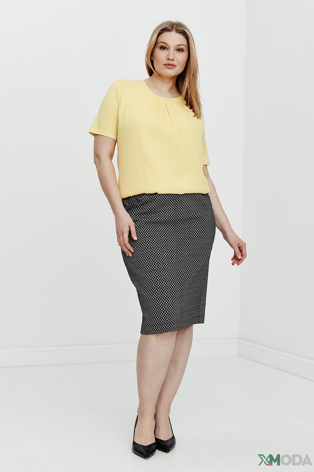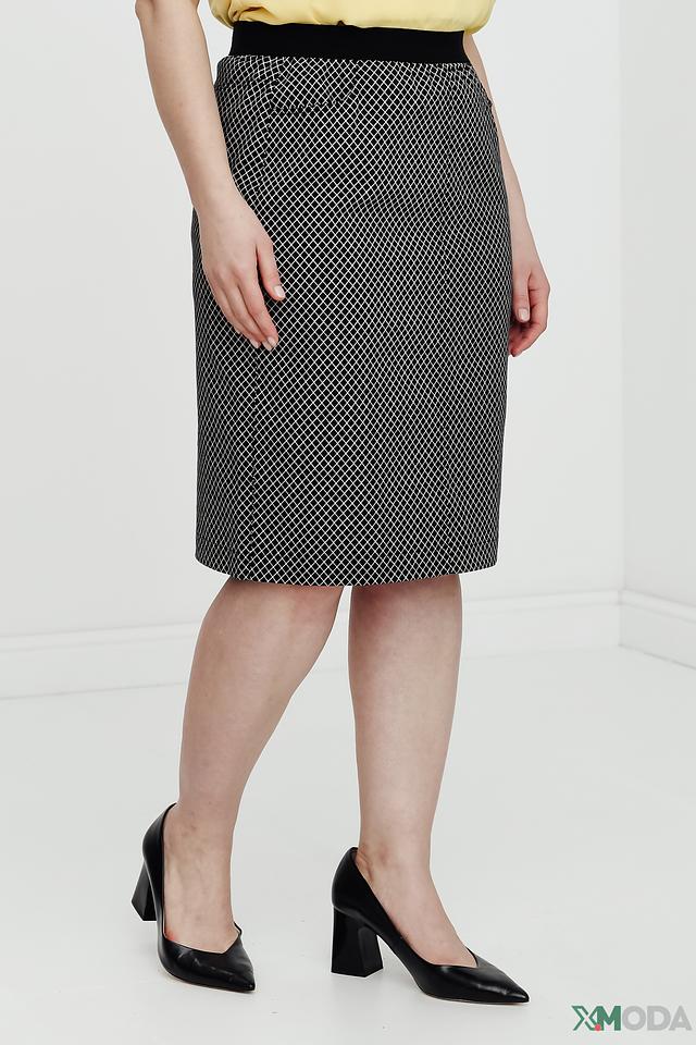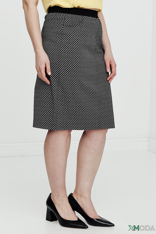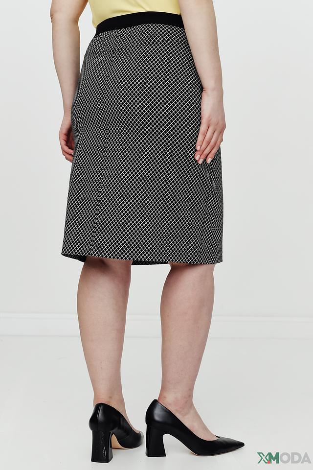 Юбка имеет классический крой и длину миди, что делает её подходящей для различных случаев – от офиса до вечерней прогулки. Чёрный цвет с геометрическим рисунком в виде клетки придаёт юбке элегантность и универсальность.