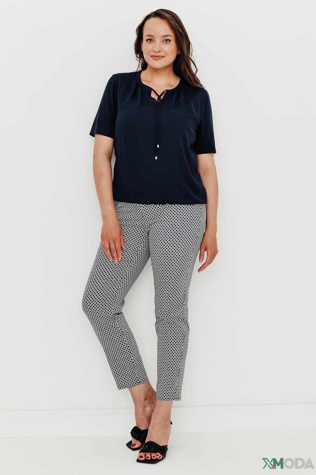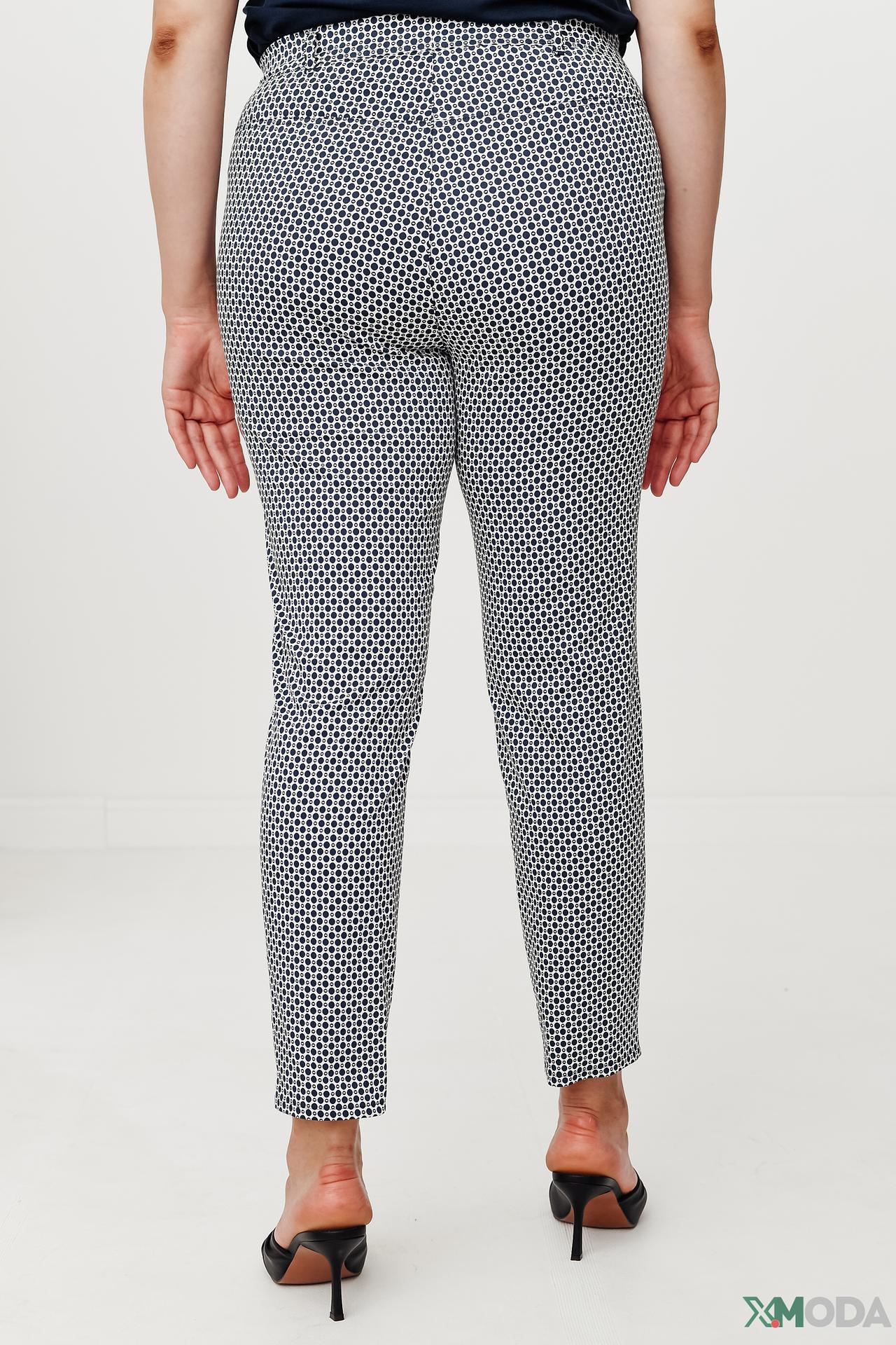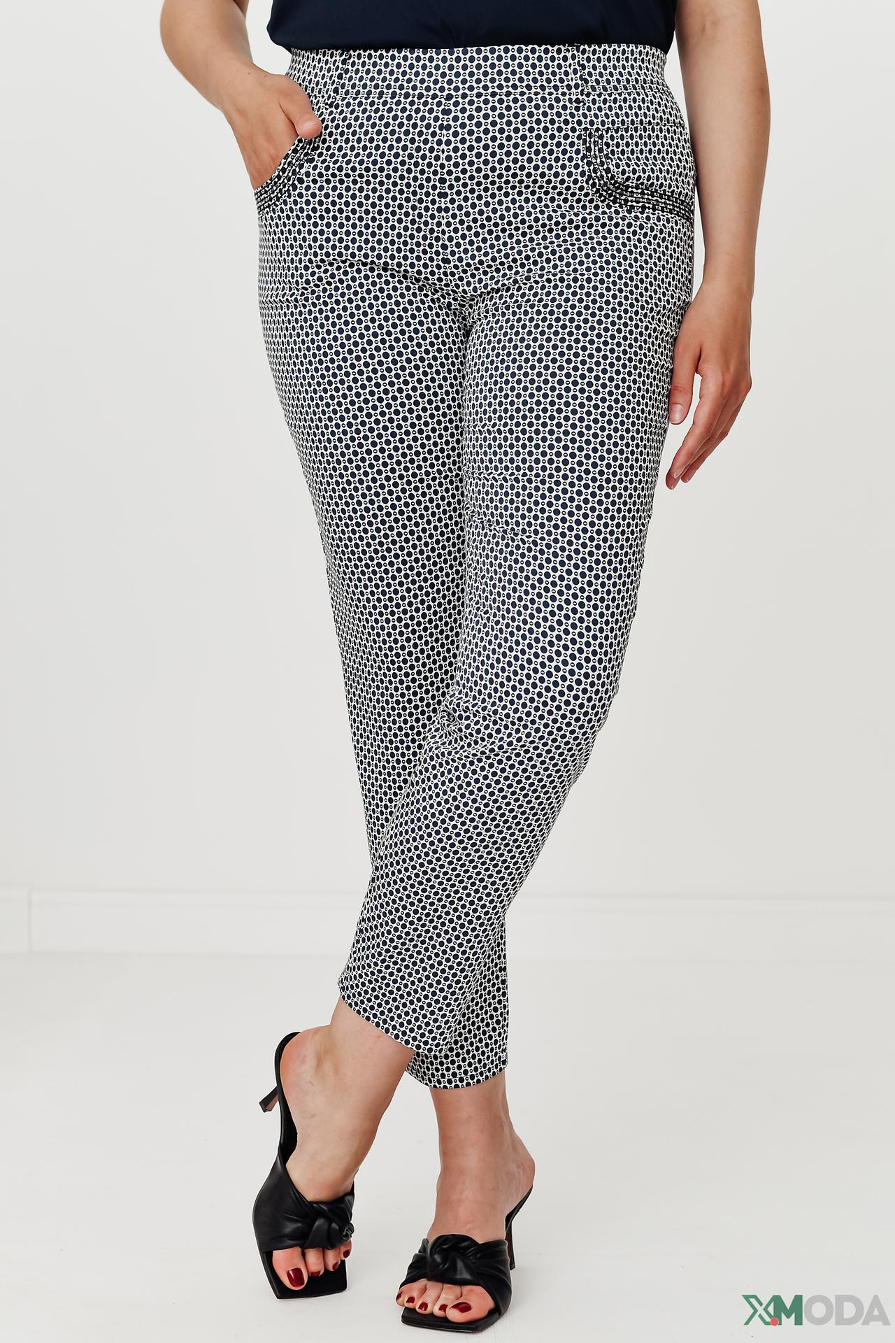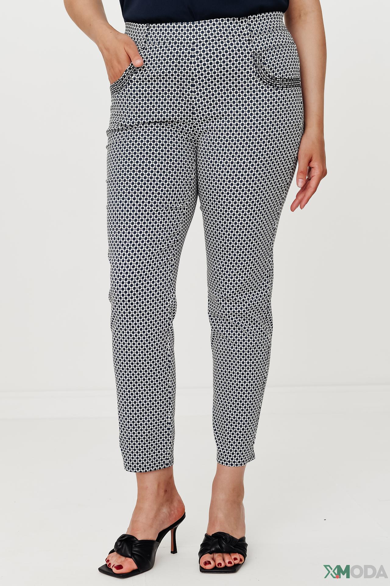 - Дизайн: Классический прямой крой, дополненный актуальным принтом в виде мелких кругов. Брюки имеют удобные боковые карманы и аккуратные задние карманы, а также декоративную отстрочку.