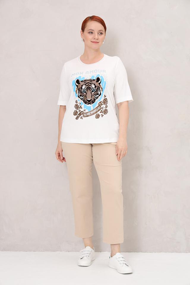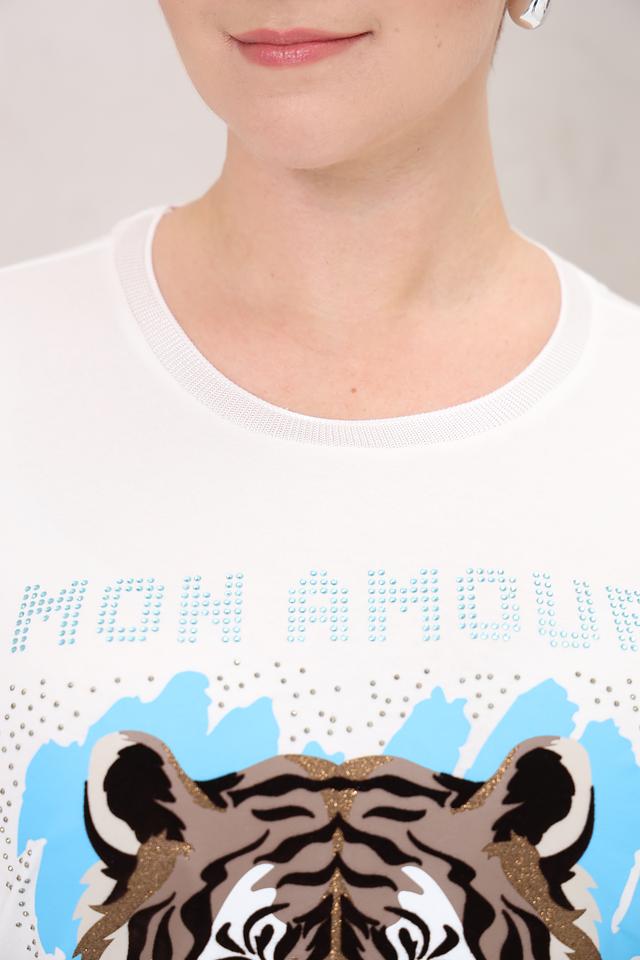 Белая футболка Frapp с ярким принтом тигра и надписью "Mon Amour". Модель выполнена из мягкой вискозы с добавлением эластана для комфортной посадки и свободы движений. Состав: вискоза 90%, эластан 10%