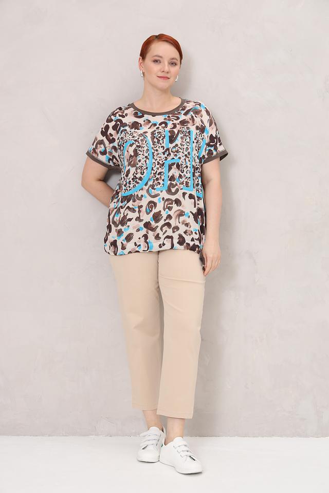Женская футболка Frapp бежевого цвета с ярким леопардовым принтом и оригинальным дизайном. Модель свободного кроя выполнена из мягкой вискозы с добавлением эластана для комфорта и удобства. Состав: вискоза 90%, эластан 10%