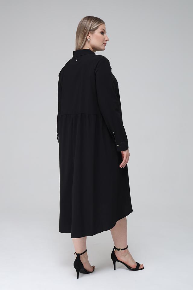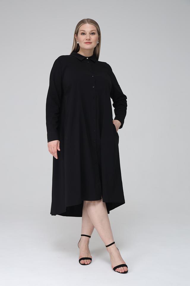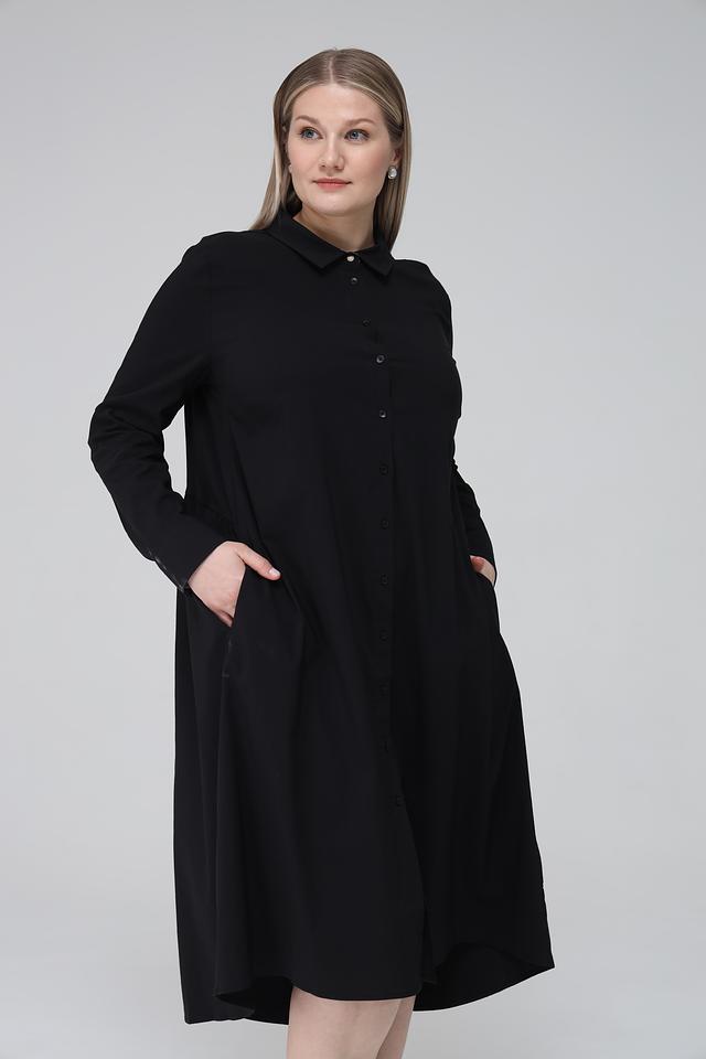 Платье имеет прямой силуэт, длинный рукав и воротник рубашечного типа. Застёжка на пуговицы по всей длине позволяет регулировать степень прилегания и создавать различные образы.