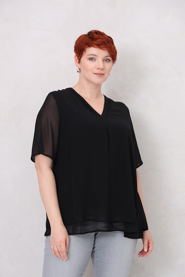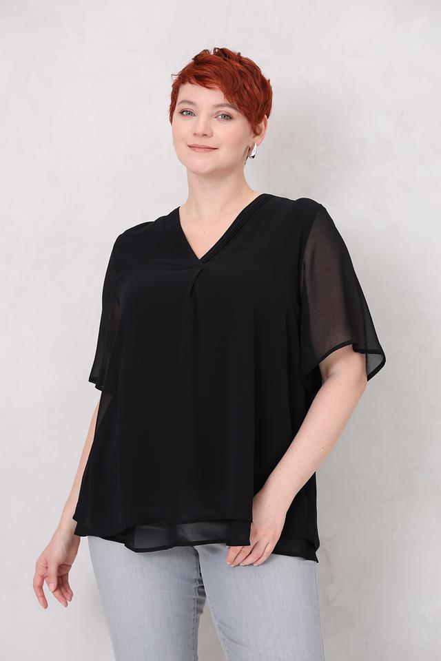 Чёрная блуза Frapp свободного кроя с короткими рукавами-воланами. Модель выполнена из лёгкой ткани и имеет V-образный вырез горловины, что придает ей элегантный и женственный вид. Состав: полиэстер 100%