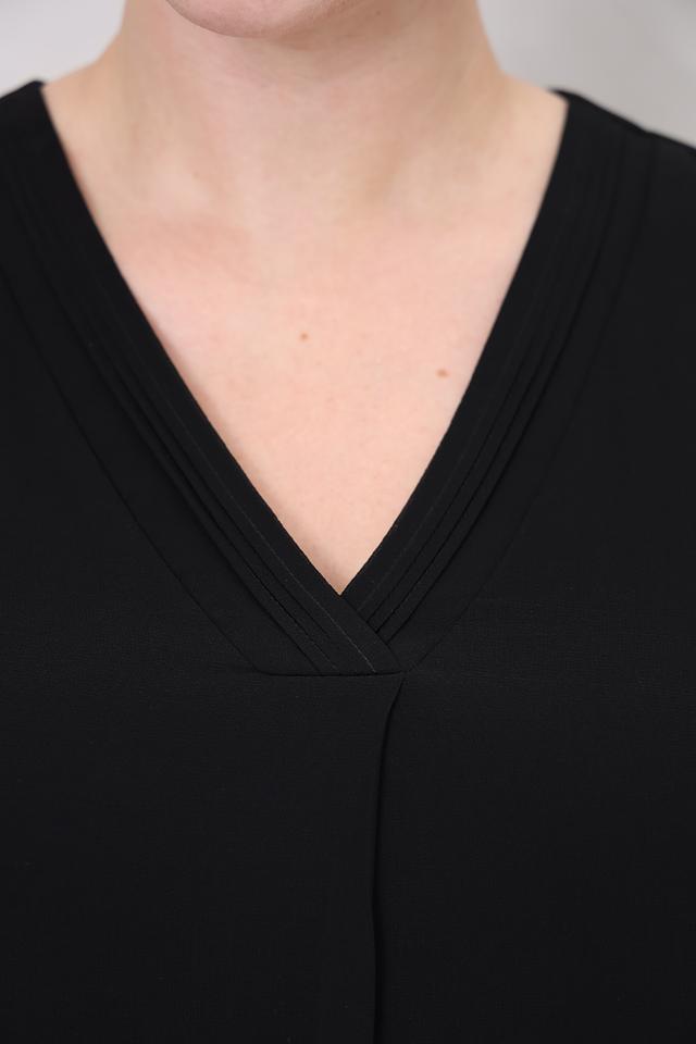 Блуза имеет свободный крой, который обеспечивает комфорт в носке и не сковывает движения. V-образный вырез горловины визуально удлиняет шею и подчеркивает женственность силуэта. Короткие рукава-воланы придают блузе лёгкость и романтичность.