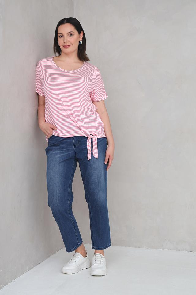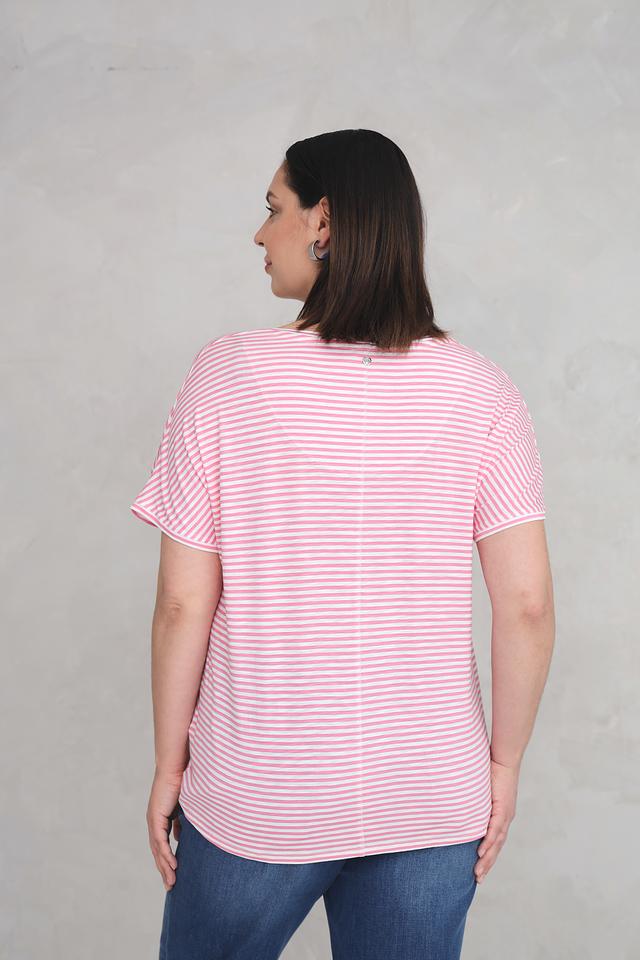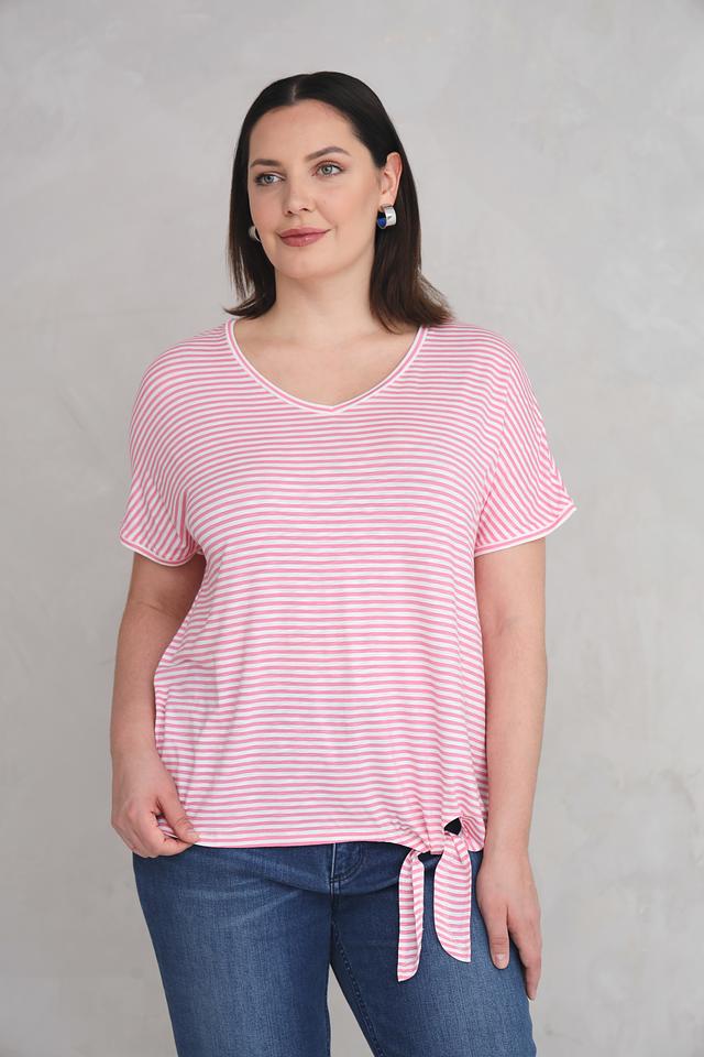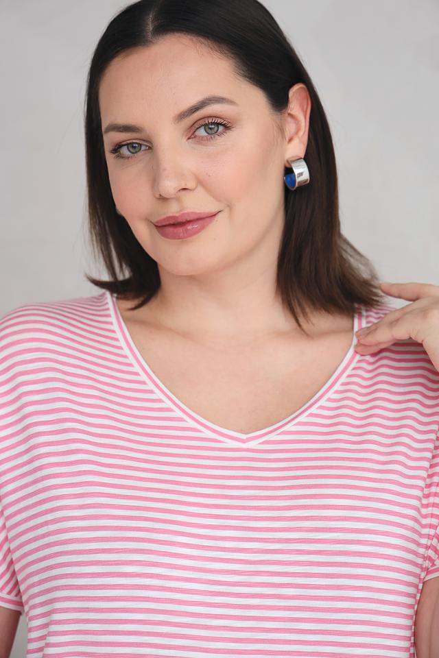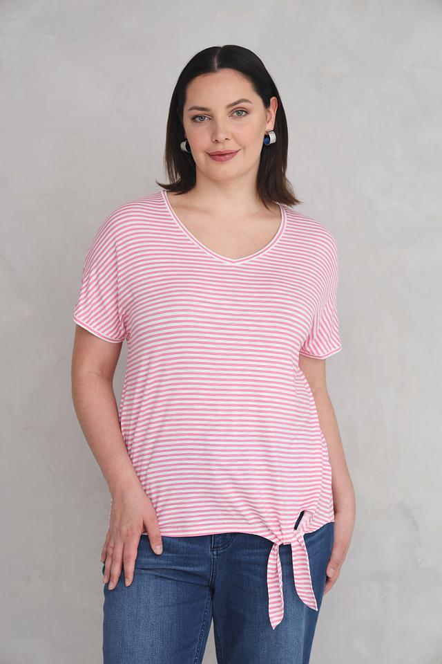 Футболка имеет классический крой с короткими рукавами и V-образным вырезом. Её отличает нежный розовый цвет и стильный полосатый принт. Боковые завязки позволяют регулировать силуэт и создавать различные образы.